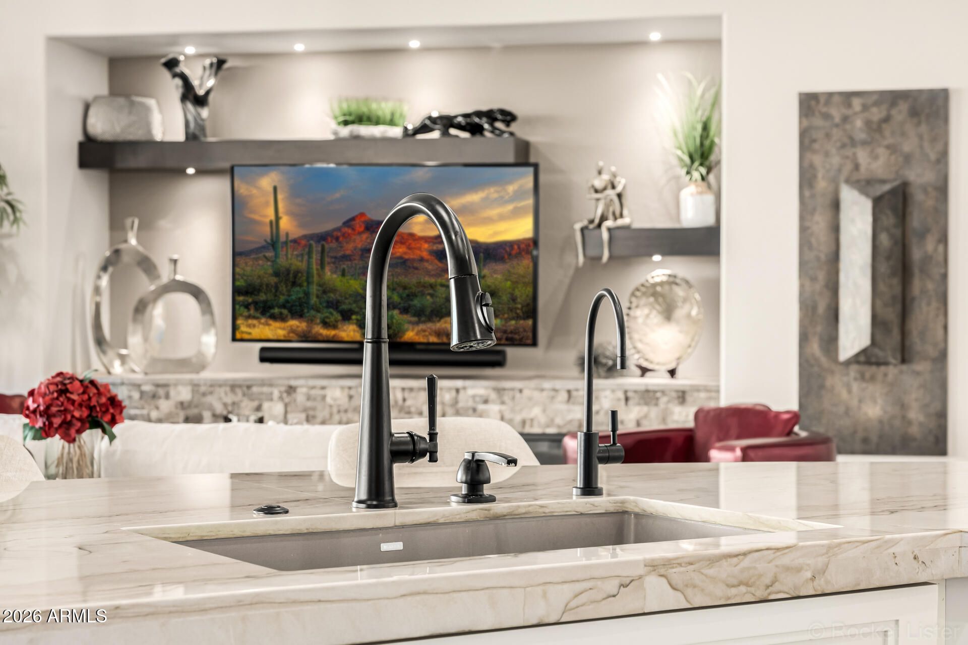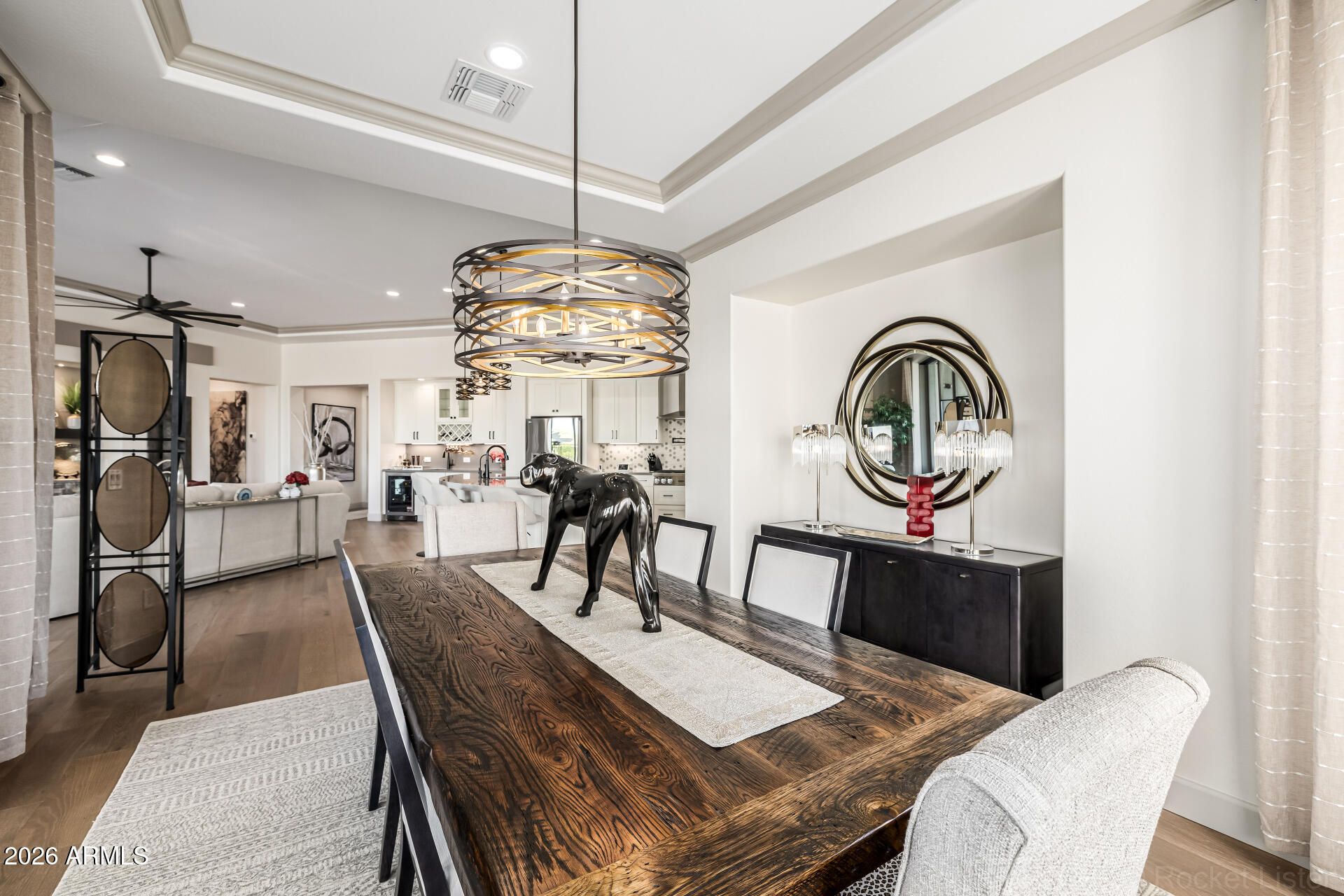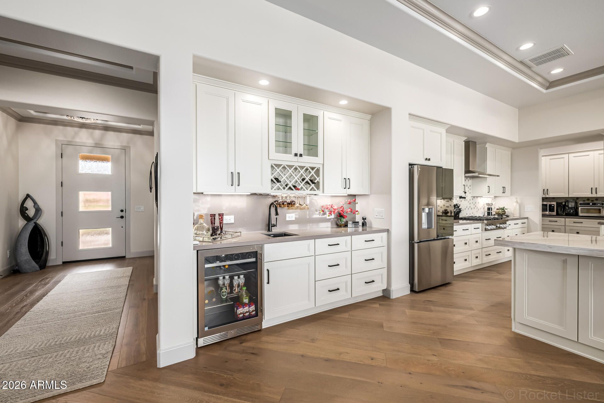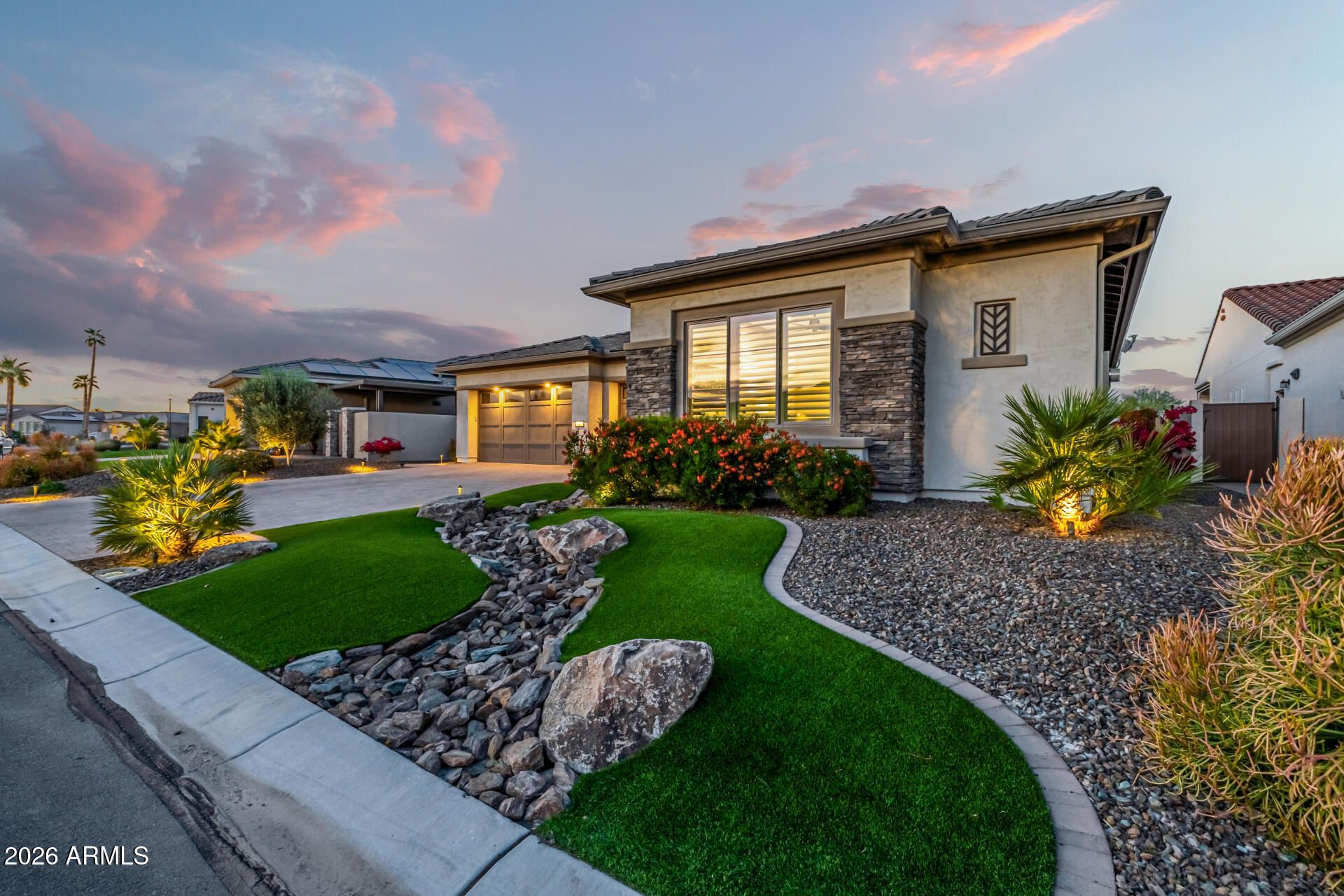 This masterpiece is the epitome of sophistication, elegance, and intentional design. No detail has been overlooked and no expense spared in this stunning Solstice model, completed in 2024. Perfectly positioned to capture serene water and golf course views, the setting is as breathtaking as the home itself. From the moment you enter, the flawless design and refined finishes make an unforgettable impression. A dramatic motorized glass wall seamlessly merges indoor and outdoor living, creating the ultimate Arizona lifestyle experience and ideal for effortless entertaining. The private guest suite features its own sitting area, offering luxurious accommodations for visitors or serving perfectly as a mother-in-law suite. The replacement cost to replicate this exceptional property would far exceed its value today. Impeccably maintained and thoughtfully designed, this extraordinary residence is move-in ready and prepared to deliver the elevated lifestyle you've been dreaming of! Upgrades & Enhancements $293K in Builder Upgrades $365K Lot Premium $101K Professionally Designed Landscaping Air Conditioned Garage with Epoxy-Coated Concrete Floor Motorized Rear Patio Screens Designer Dimmers to Light Switches Under-Cabinet Lighting in Kitchen & Sitting Room Motorized Window Coverings Exterior Privacy Screens Custom Media Wall Featuring 84" Linear Fireplace Upgraded Ceiling Fans & Designer Light Fixtures Crown Molding Throughout Upgraded Water Softener System & Reverse Osmosis Jetted Tub with Fireplace in Main Suite