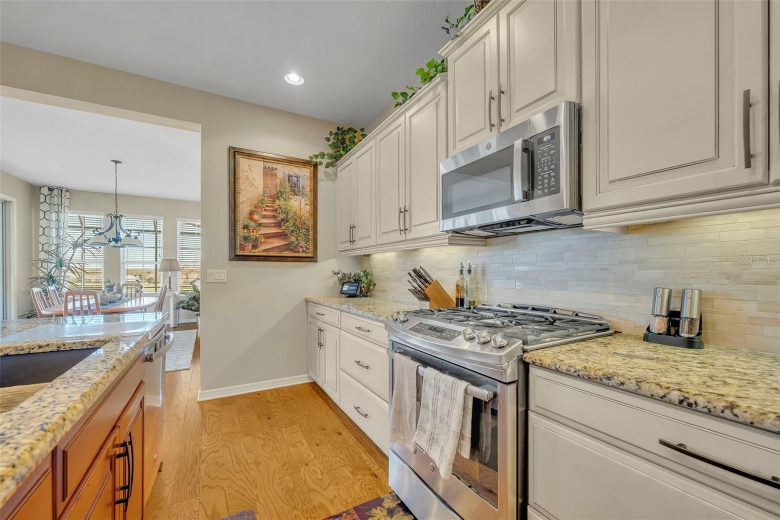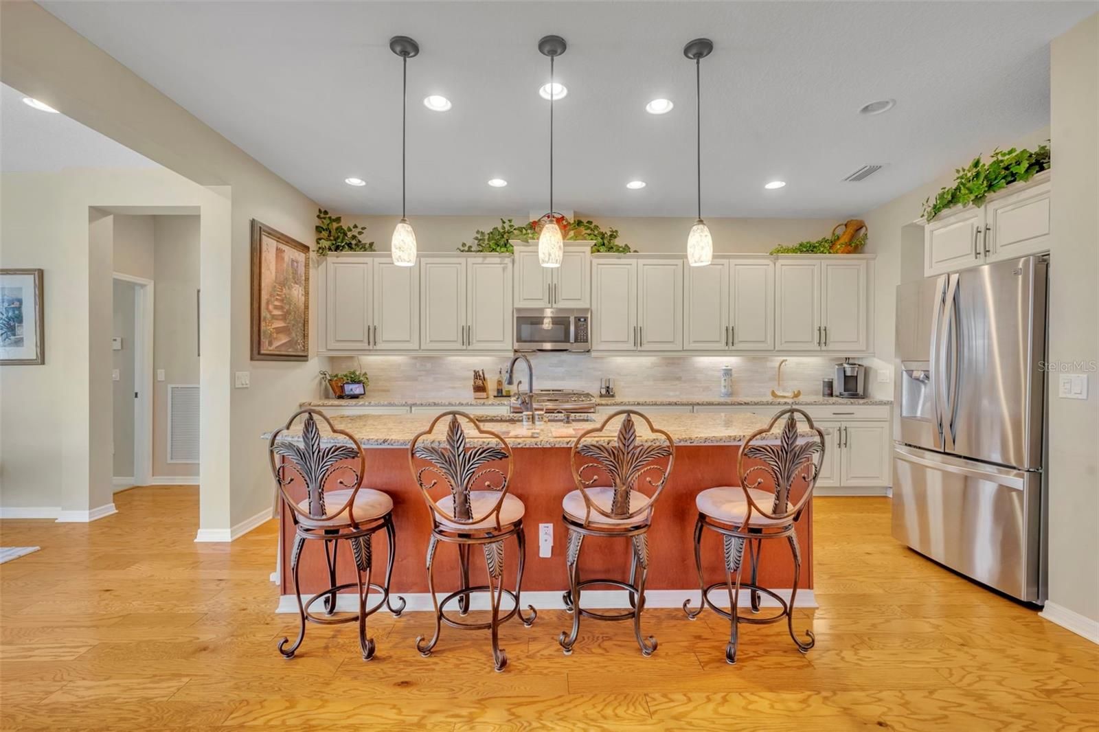 Experience refined living in this beautifully maintained 2-bedroom, 2-bath end-unit residence featuring a private den/office and additional flex space, ideal for working from home, hobbies, or welcoming guests. Perfectly positioned on a rare premium lot, this home offers unobstructed scenic views and desirable eastern exposure, filling the home with natural light and providing stunning sunrise views each morning.Inside, the home showcases rich wood flooring throughout the main living areas, soft neutral tones, and an open, inviting layout designed for both comfort and elegance. The living room is anchored by a charming fireplace, creating a warm and relaxing atmosphere for quiet evenings or entertaining guests.The chef-inspired kitchen is thoughtfully designed with granite countertops, a ceramic tile backsplash, a spacious dining area, and an oversized pantry, offering both style and functionality for everyday living and hosting. One of the home’s most exceptional features is the all-season enclosed lanai with eastern exposure, providing the perfect place to enjoy beautiful sunrises, morning coffee, or evening relaxation. Designed for year-round use, this versatile space seamlessly extends the living area while allowing you to take in the peaceful scenic surroundings. Additional square footage has been thoughtfully incorporated into the breakfast area, pantry, laundry room, and second bedroom, offering added convenience and flexibility rarely found in similar homes. As a rare end-unit, the property also provides enhanced privacy and a sense of openness that truly sets it apart.