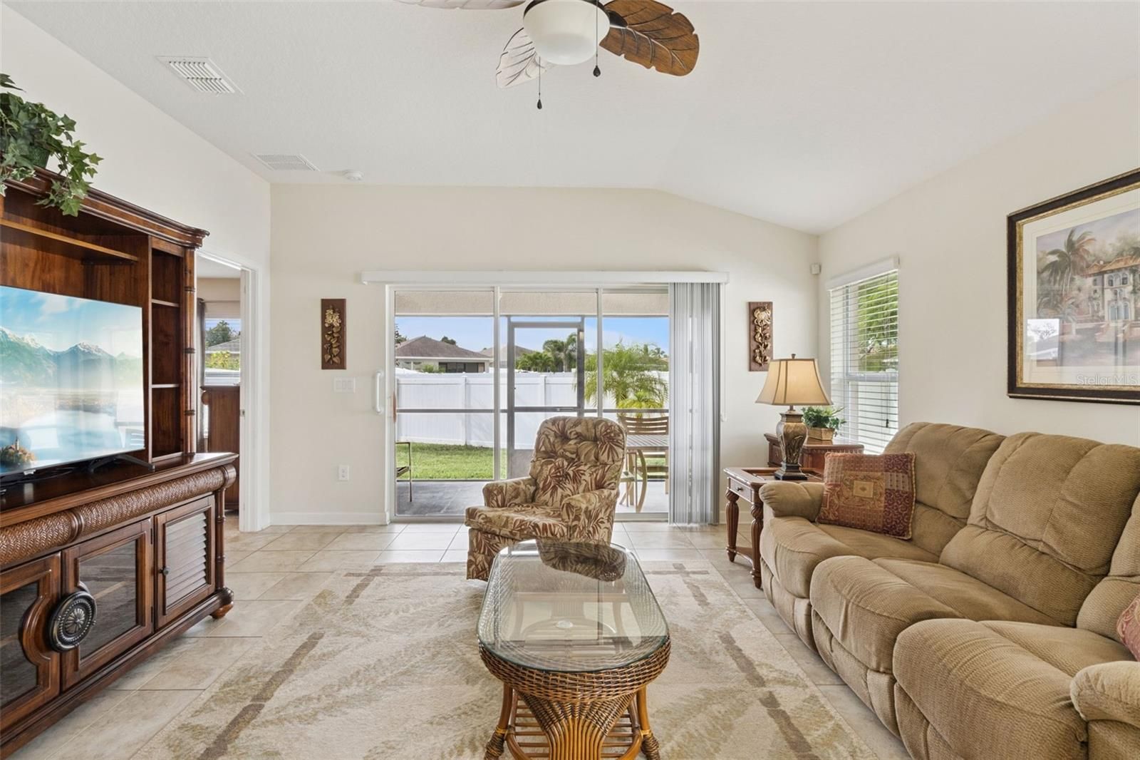 Located in the highly desirable 55+ maintenance-free gated community of Traditions on Lake Ruby, this wonderful 2-bedroom, 2-bath home offers charm, functionality, and an exceptional lifestyle. Upon arrival, you’re greeted by a welcoming front porch that sets the tone for the inviting interior. Inside, the open-concept floor plan features a spacious living room with vaulted ceilings and triple sliding glass doors that lead to the screened-in lanai, creating a seamless connection between indoor and outdoor living. The eat-in kitchen showcases 42" upper cabinetry with crown molding, chrome hardware, a subway glass tile backsplash, and quartz countertops. Functional upgrades include a smudge-proof stainless steel appliance package, pull-out shelves, a gooseneck faucet, and a closet pantry. A charming breakfast nook is ideal for casual dining, while the formal dining area, enhanced with sliding glass doors that open to the fenced yard, further extends the living space outdoors. Easy-to-maintain solid surface flooring flows throughout the main living areas. The primary bedroom suite features wall-to-wall carpeting, a walk-in closet, and peaceful backyard views. The en-suite bath includes a comfort-height vanity with a built-in cosmetic desk, quartz countertops, and a walk-in shower with a glass enclosure. Outdoor enjoyment awaits with a fully fenced yard and a generously sized screened-in lanai—perfect for relaxing or entertaining guests. Additional highlights include a laundry room with washer, dryer, irrigation system, architectural shingle roof, double pane windows, hybrid water heater, fenced in yard, programmable thermostat, alexa system, alarm system, In-wall pest system, exterior spot lights, 2-car garage with My Q garage door opener, plus a paved driveway and walkway. Traditions at Ruby Lake offers an exceptional array of amenities: a lakefront clubhouse, dock and boat ramp, heated swimming pool and spa, ballroom, billiards, meeting rooms, library, computer room, craft room, dog park, tennis and pickleball courts, basketball, bocce, shuffleboard, fitness center, aerobics studio, and more. The monthly HOA fee covers exterior house painting, cable, internet, front-yard lawn service, and access to clubhouse amenities—ensuring a worry-free, maintenance-free lifestyle.