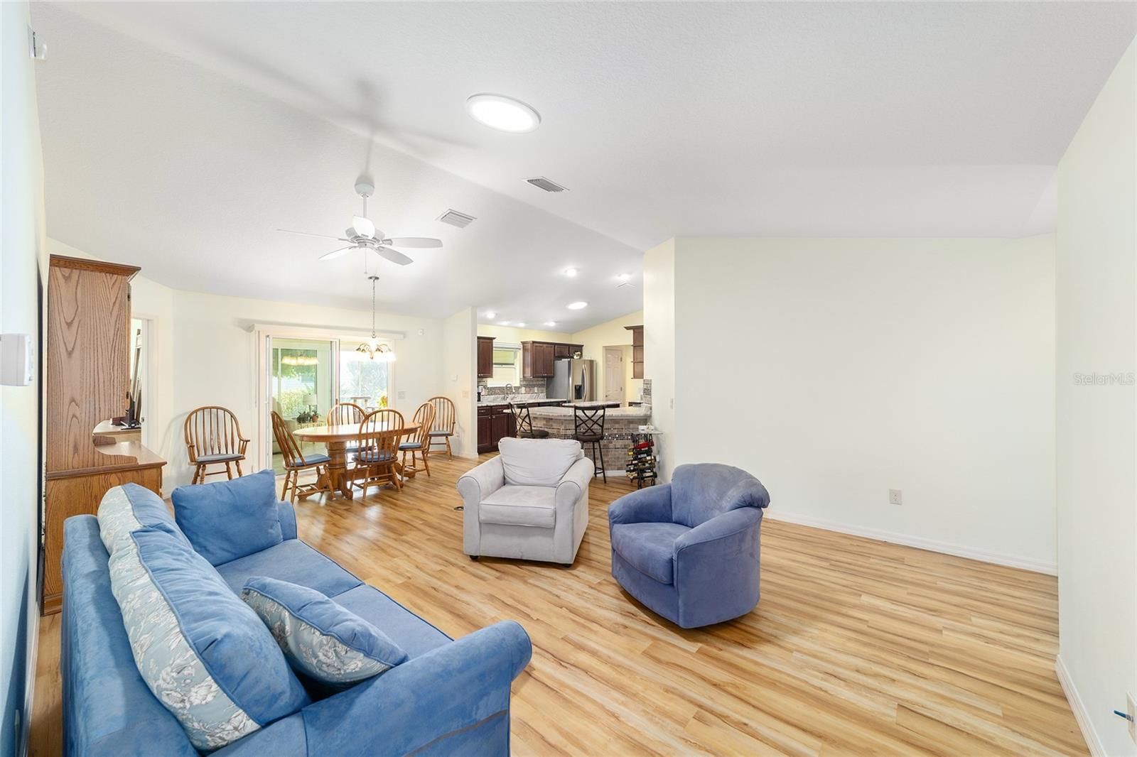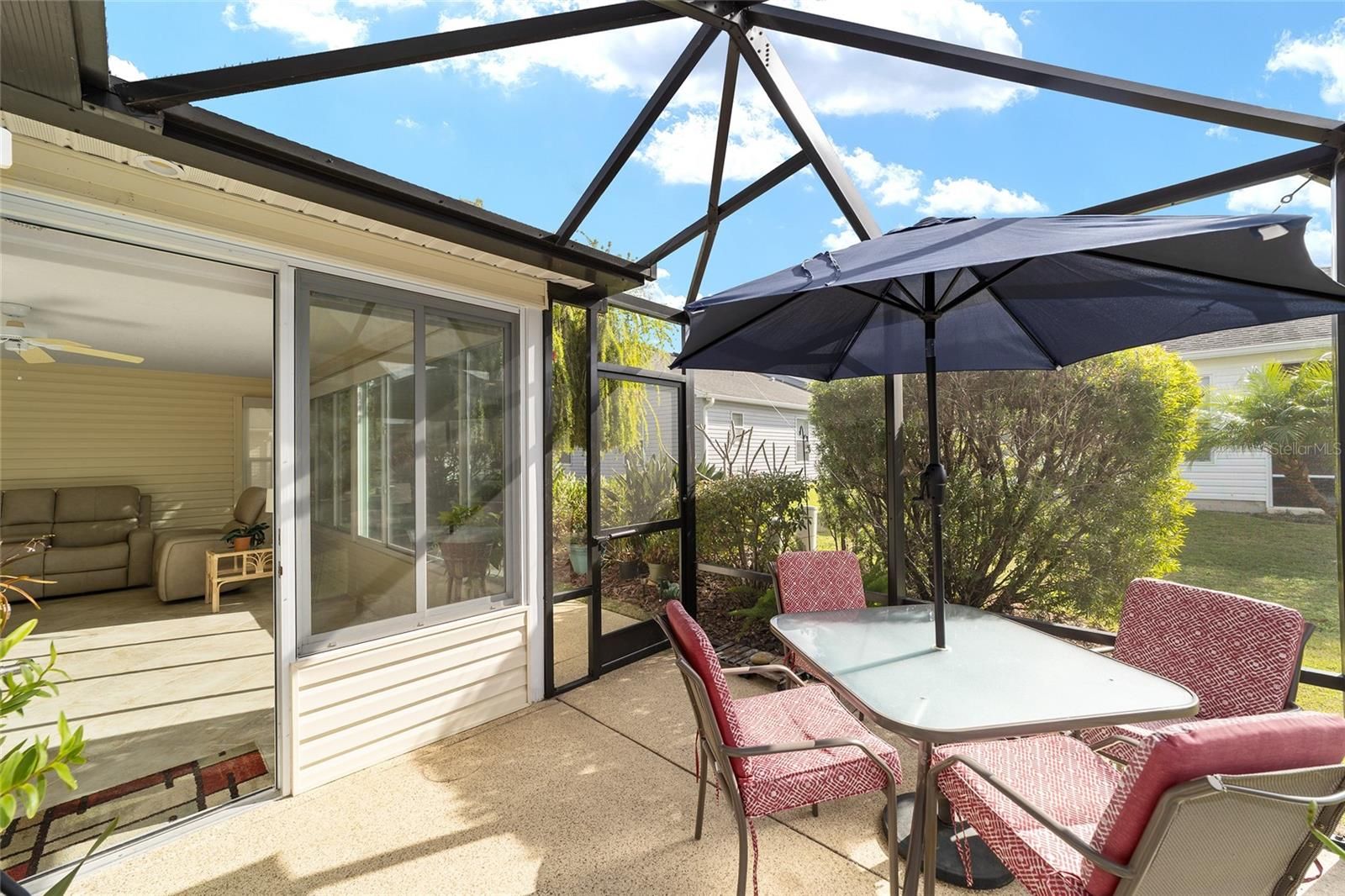Lovely Anchor model in the desirable Village of Charlotte. Mature landscaping and painted driveway greet you as you arrive. Light luxury vinyl floors throughout the home, kitchen was recently updated with granite countertops, mosaic backsplash, new appliances and custom island. Solar tubes in Living room and kitchen bring light to the space. Enjoy your cozy, lush back yard from the glass enclosed lanai with mini split, remote operated blinds and tile floors, or from the new screened patio, a lovely place for morning coffee or afternoon cocktails. Primary bedroom offers en suite bath with walk in shower and huge walk in closet. Second bedroom is a spacious and light filled room, third bedroom makes for a perfect office or guest room. New AC 2025, New garage door and opener 2025, Full size refrigerator in garage. Perfectly located in the middle of the Villages. Just south of 466A , a quick golf cart ride to 4 golf courses, Sarasota practice range and Pro Shop and all types Restaurants, Country Clubs, Shopping and Medical care Bond balance $13,013 Annual Fire $320.71 Annual Maintenance $396.22 These 2 figures to be verified Property may be sold with furniture Excluding 2 sofas in lanai All real estate and financial information is believed correct but should be verified by Buyer