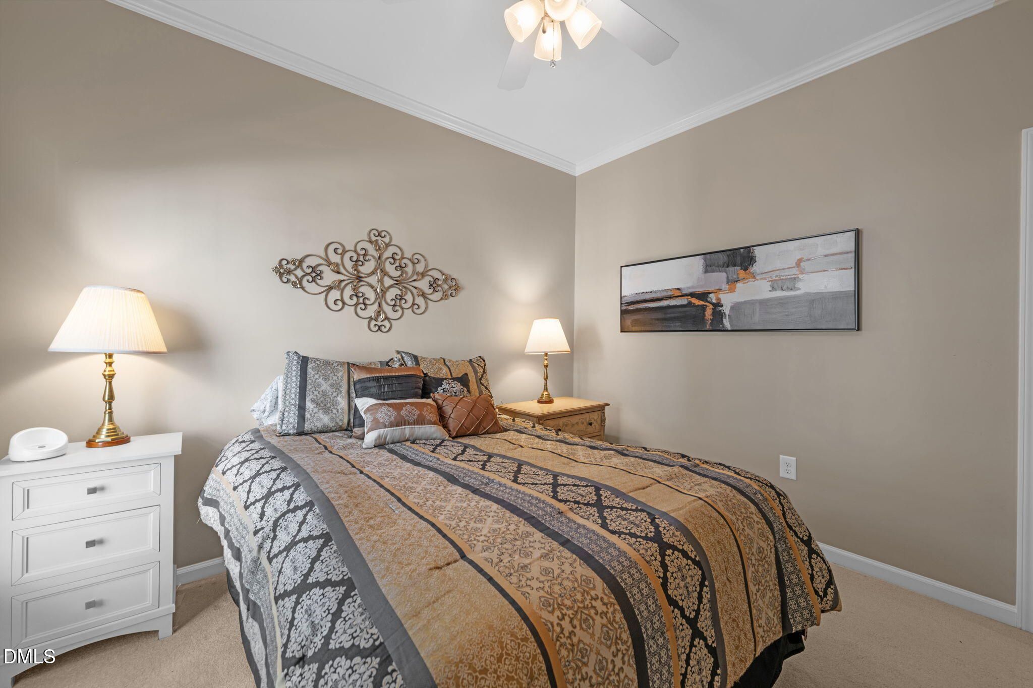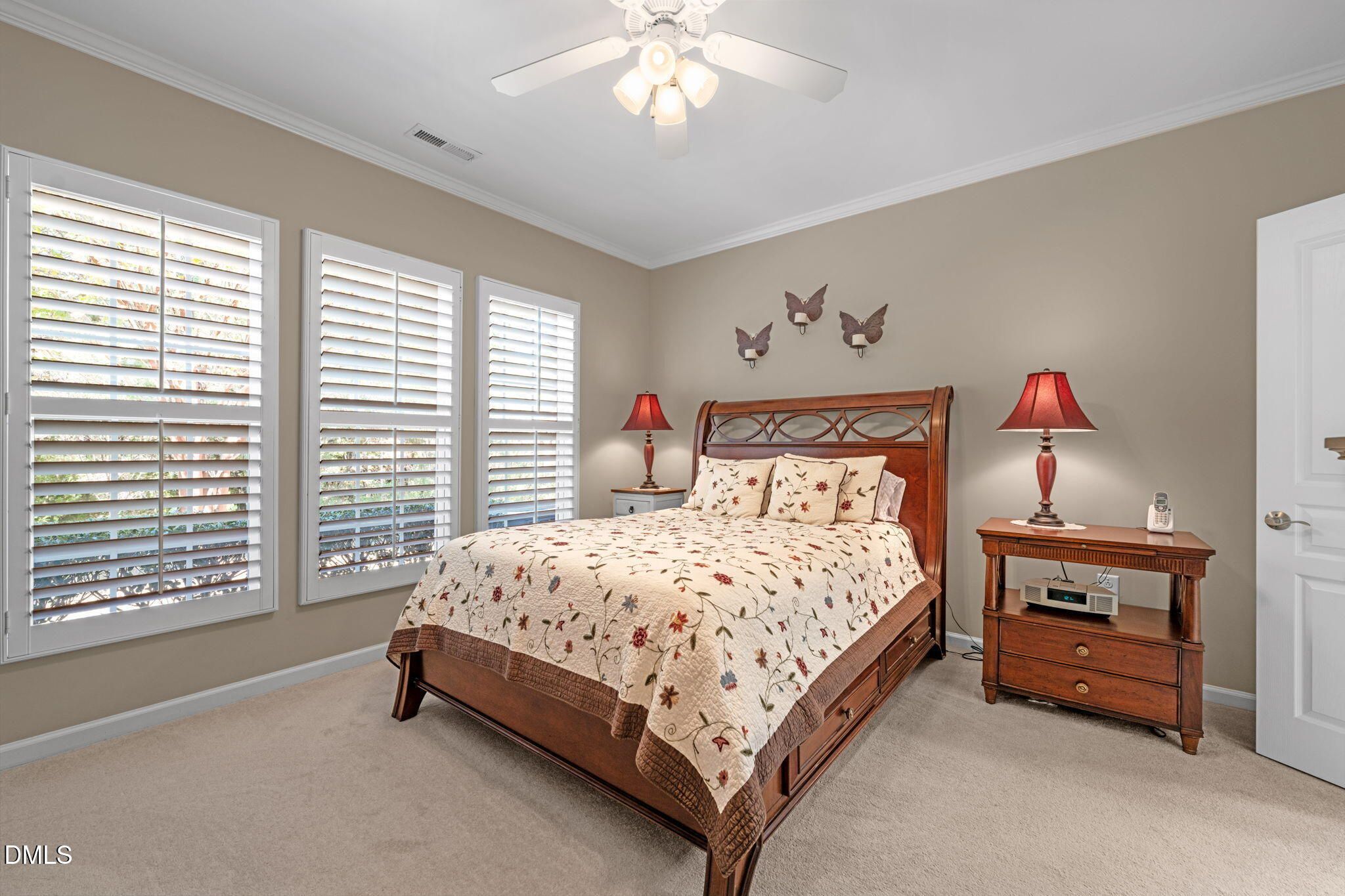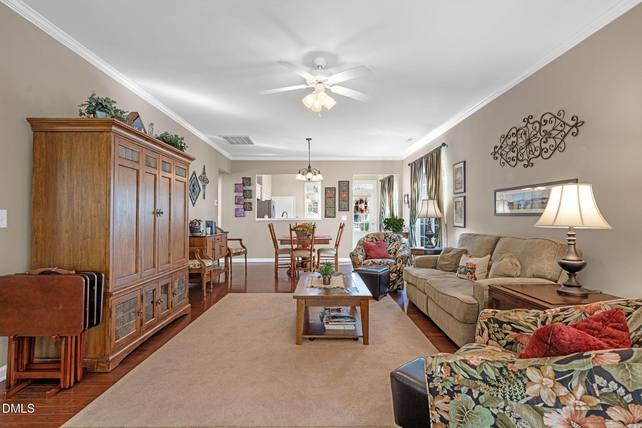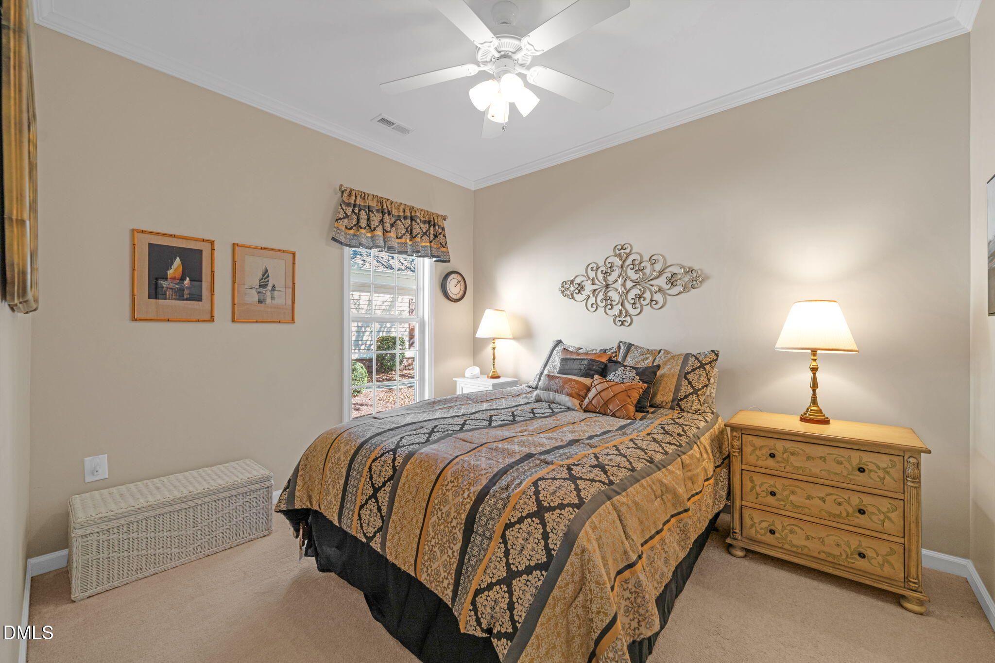 Not too big, not too small....but just right! Nestled in the cul de sac with private back yard views and walking distance to Simmer Coffee, Amberly Local, Domino's, park, & clubhouse! Meticulously maintained with newer roof, appliances, water heater and HVAC. Updated closets including large hall storage closet. Crown molding throughout. Retractable screen at the front door and remote-controlled awning covers the back patio. Enjoy wooded views through the sunroom sliding glass doors and onto the patio. With 3 bedrooms and 2 baths, eat-in kitchen, living/dining combo and sunroom, this well-designed home lives large. Come and see why Carolina Preserve is Cary's premier 55+ active adult community with over 100 clubs, pools, tennis, pickle ball, bocce, parks, and access to two gorgeous clubhouses. Remember, the early bird always gets the worm!