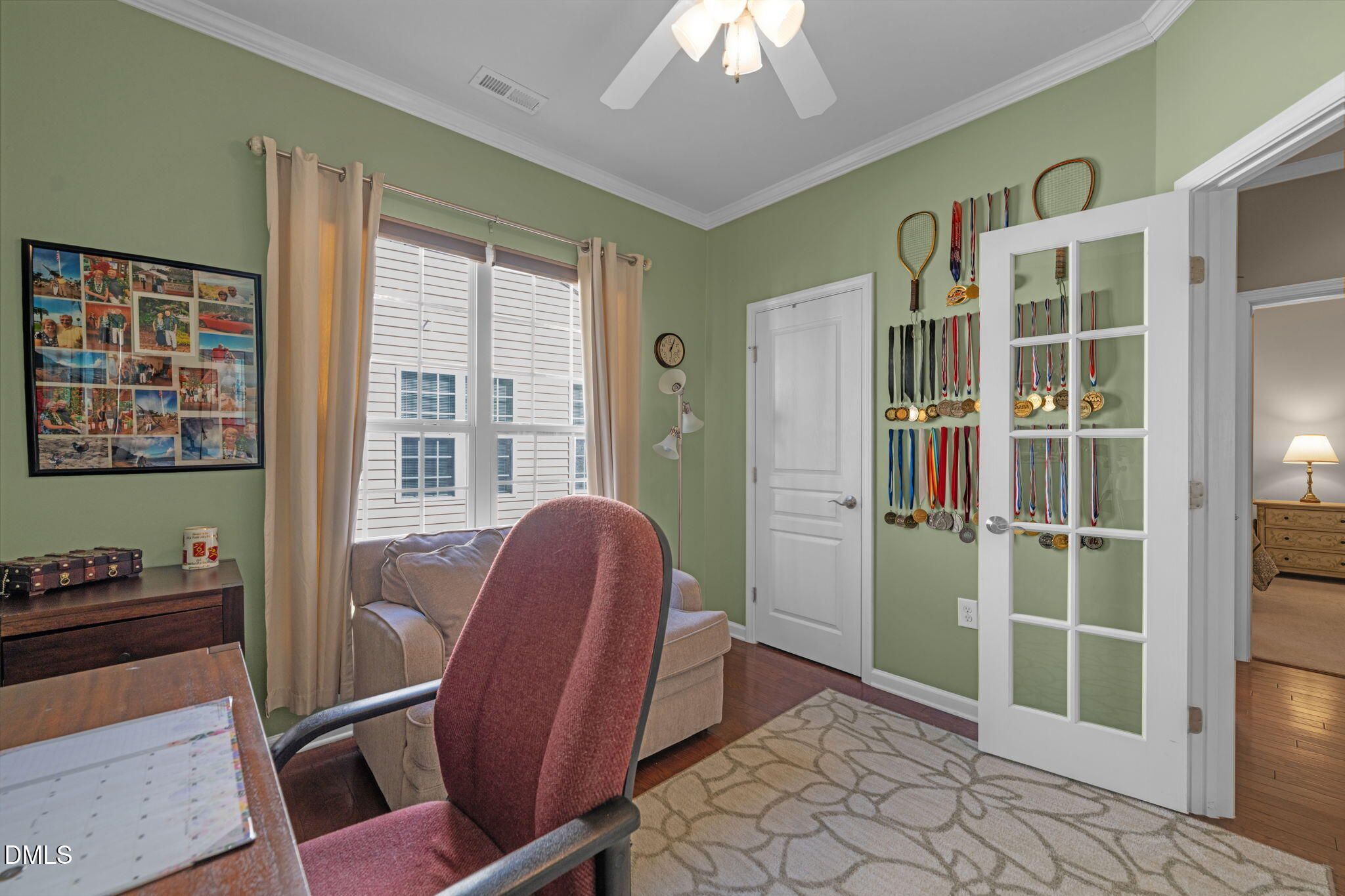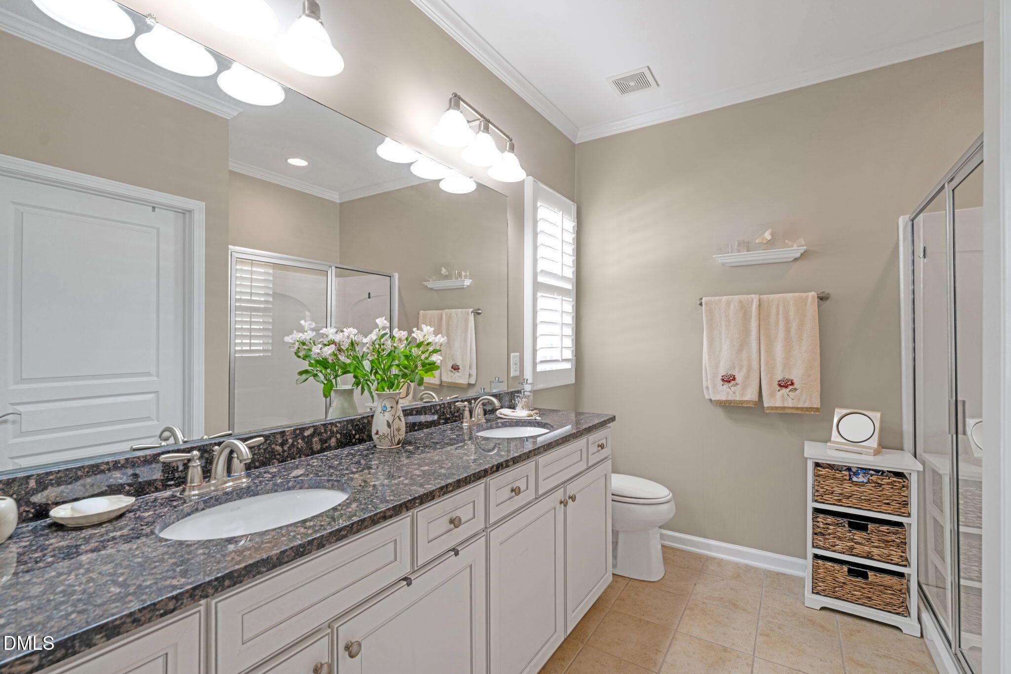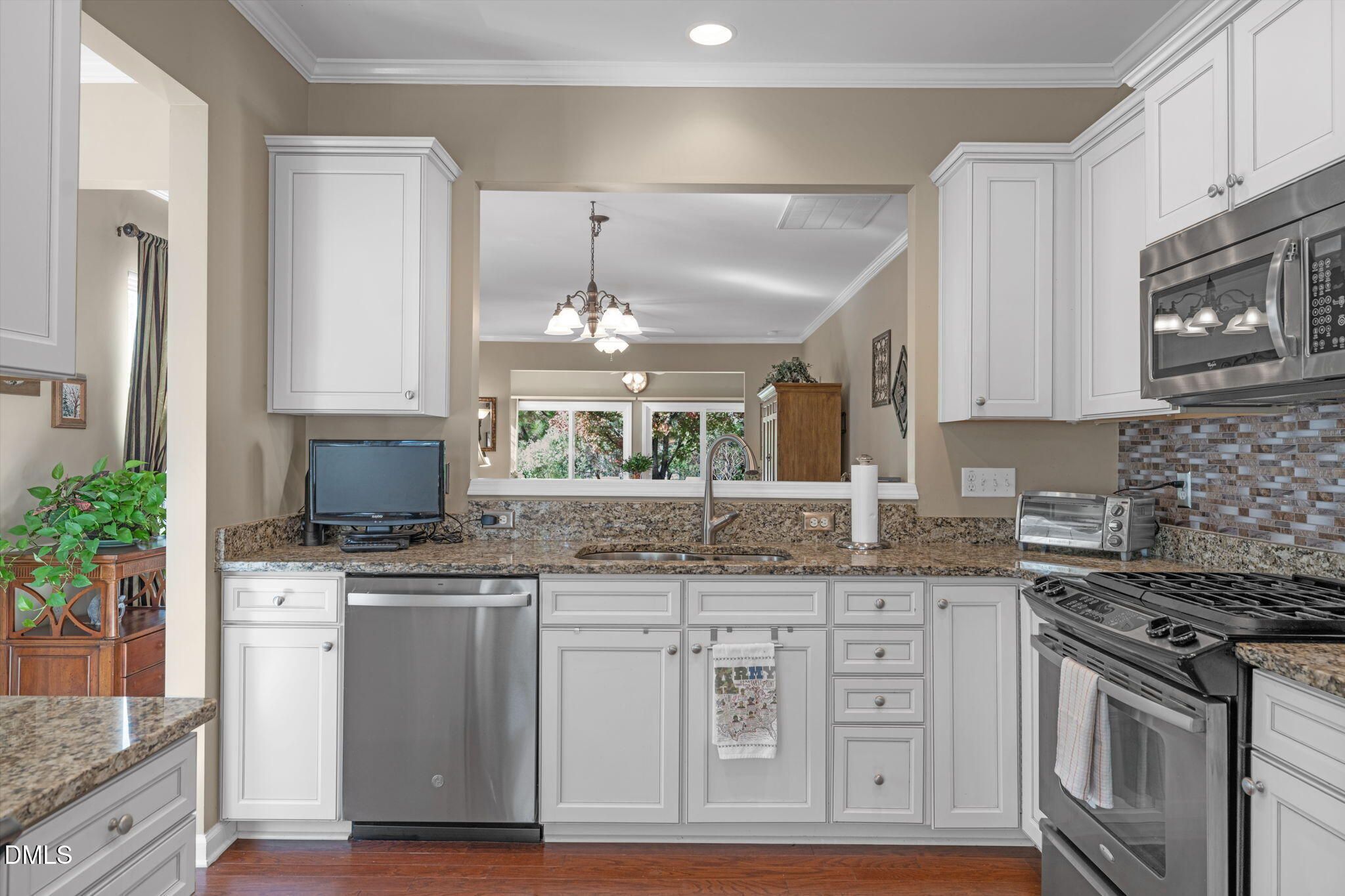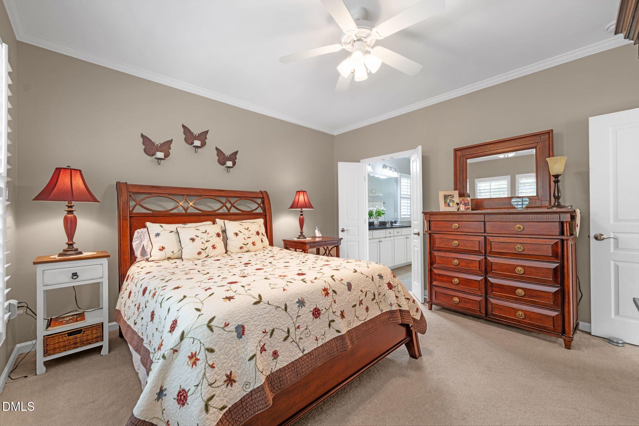 Not too big, not too small....but just right! Nestled in the cul de sac with private back yard views and walking distance to Simmer Coffee, Amberly Local, Domino's, park, & clubhouse! Meticulously maintained with newer roof, appliances, water heater and HVAC. Updated closets including large hall storage closet. Crown molding throughout. Retractable screen at the front door and remote-controlled awning covers the back patio. Enjoy wooded views through the sunroom sliding glass doors and onto the patio. With 3 bedrooms and 2 baths, eat-in kitchen, living/dining combo and sunroom, this well-designed home lives large. Come and see why Carolina Preserve is Cary's premier 55+ active adult community with over 100 clubs, pools, tennis, pickle ball, bocce, parks, and access to two gorgeous clubhouses. Remember, the early bird always gets the worm!