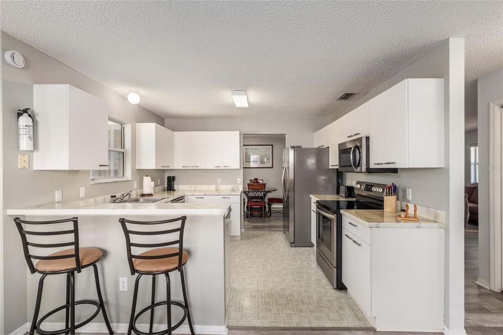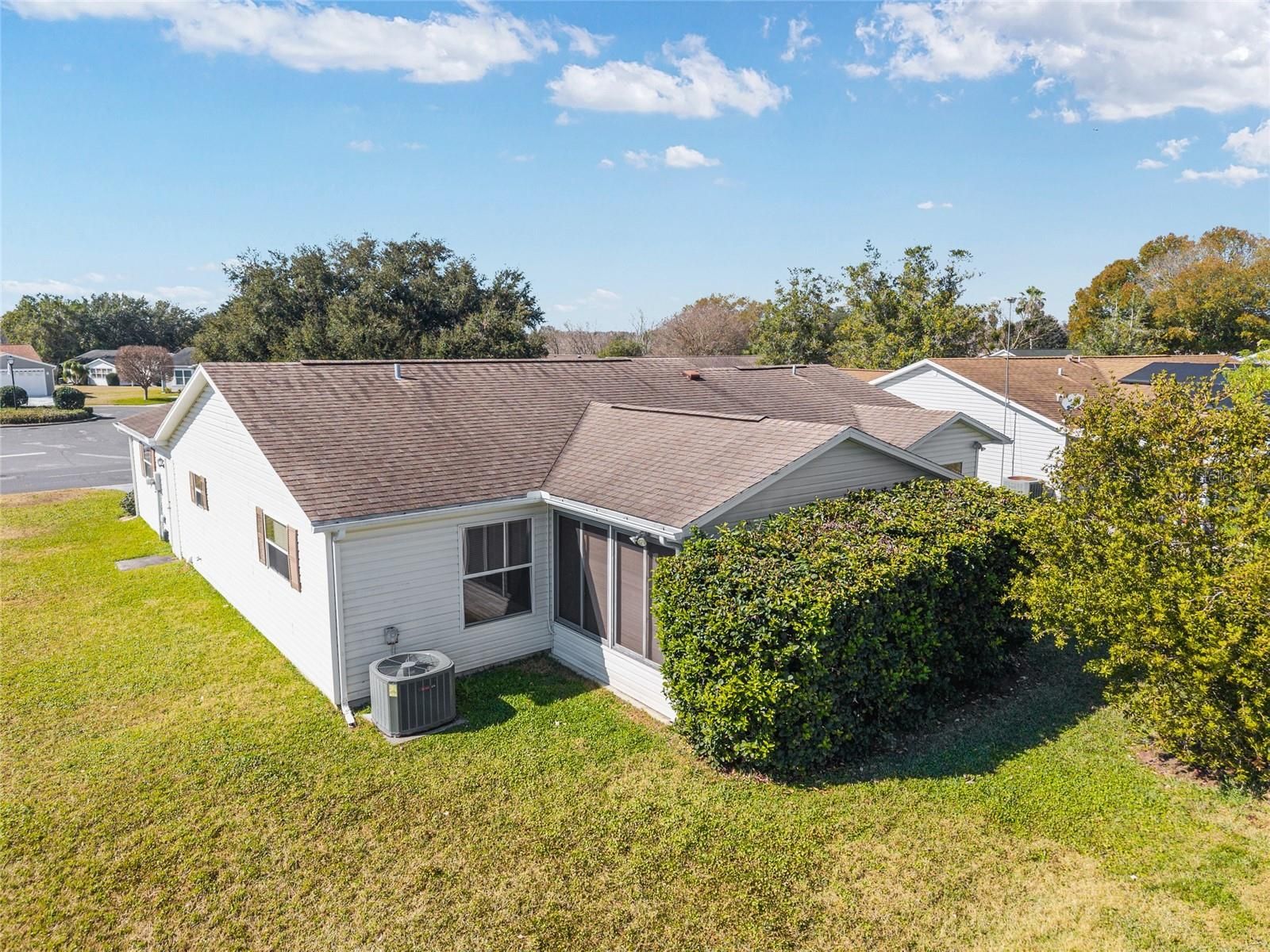 Welcome to the Village of Rio Ponderosa, centrally located close to Lake Sumter and Spanish Springs Town Squares. This charming Laramie ranch-style home is turnkey, fully furnished, and ready for you to move right in. With 1,360 sq ft, a desirable split-floor plan, and no carpet, the light-filled interior offers easy one-level living with low maintenance vinyl plank and rolled vinyl flooring throughout. The kitchen features white cabinetry, stainless steel appliances, barstool seating plus a dining nook, dishwasher, garbage disposal, microwave space-saver, and electric range - ideal for everyday meals or entertaining. The primary bedroom boasts an attached ensuite with a beautifully renovated walk-in tile shower and spacious closets. The guest bath includes a tub-shower combination. Practical touches include double-pane windows and sliders, blinds, and smoke alarms. Mechanicals and updates provide peace of mind: HVAC (2018), bond paid, and an enclosed lanai with privacy shades overlooking mature rear landscaping. The exterior shows pride of ownership with architectural shingles, frame and vinyl siding, gutters/downspouts, color-coded driveway, irrigation system, and rear patio. The one-car plus golf cart garage has epoxy-painted floor, attic stairs, and garage door opener with transmitters. Washer, dryer, and refrigerator are included. Quick close possible. This turnkey home blends comfort, convenience, and Village lifestyle just steps from recreation, dining, and shopping.