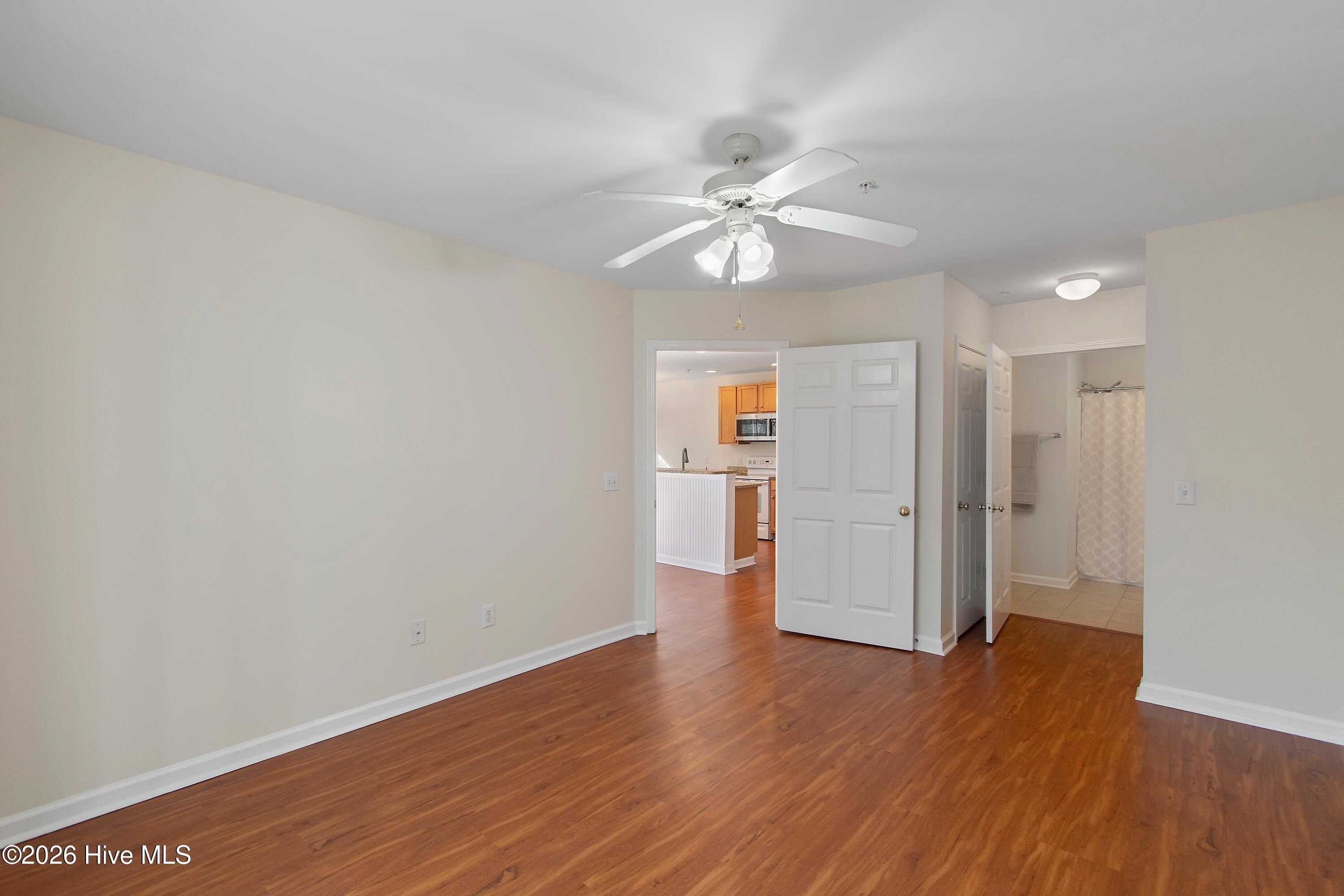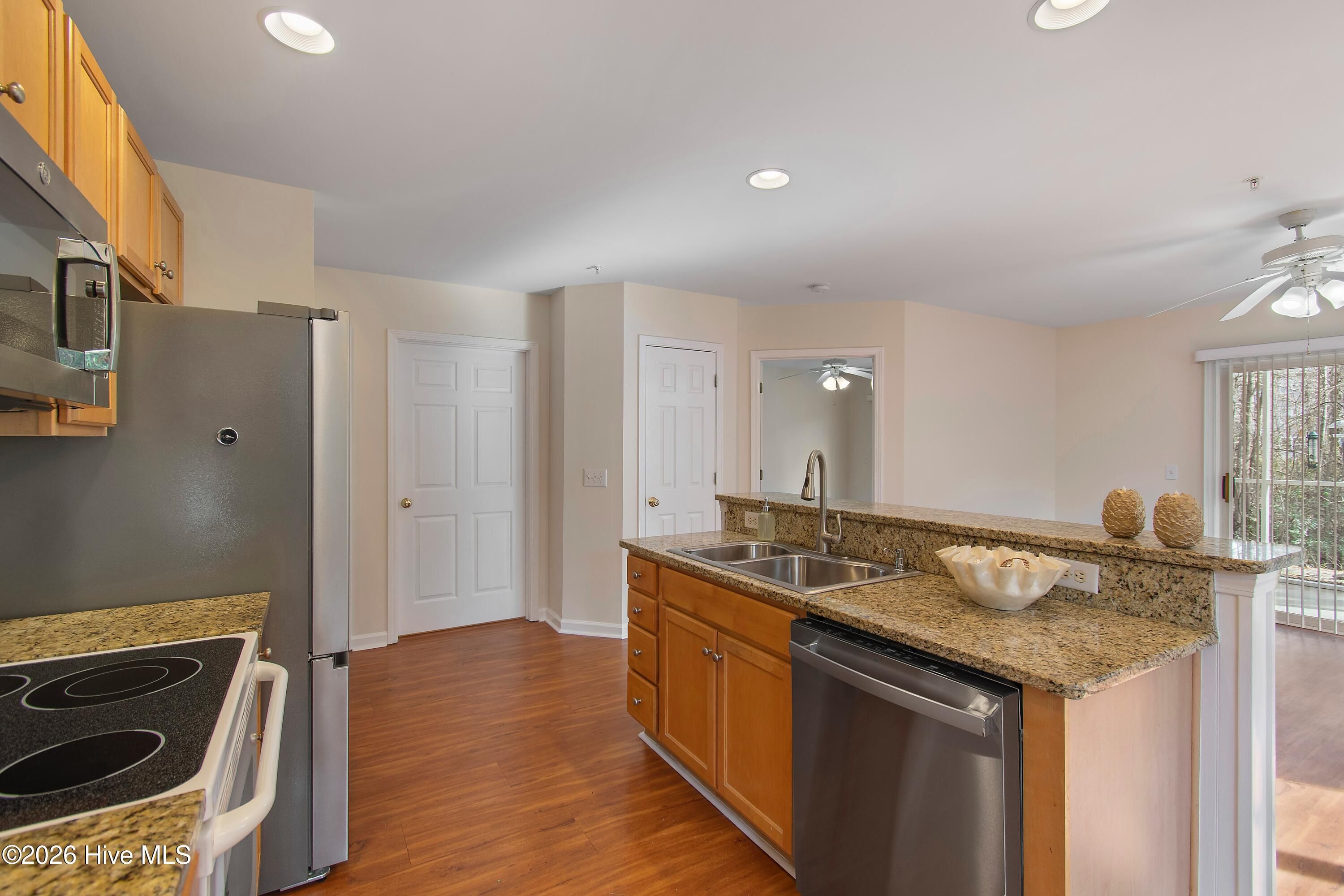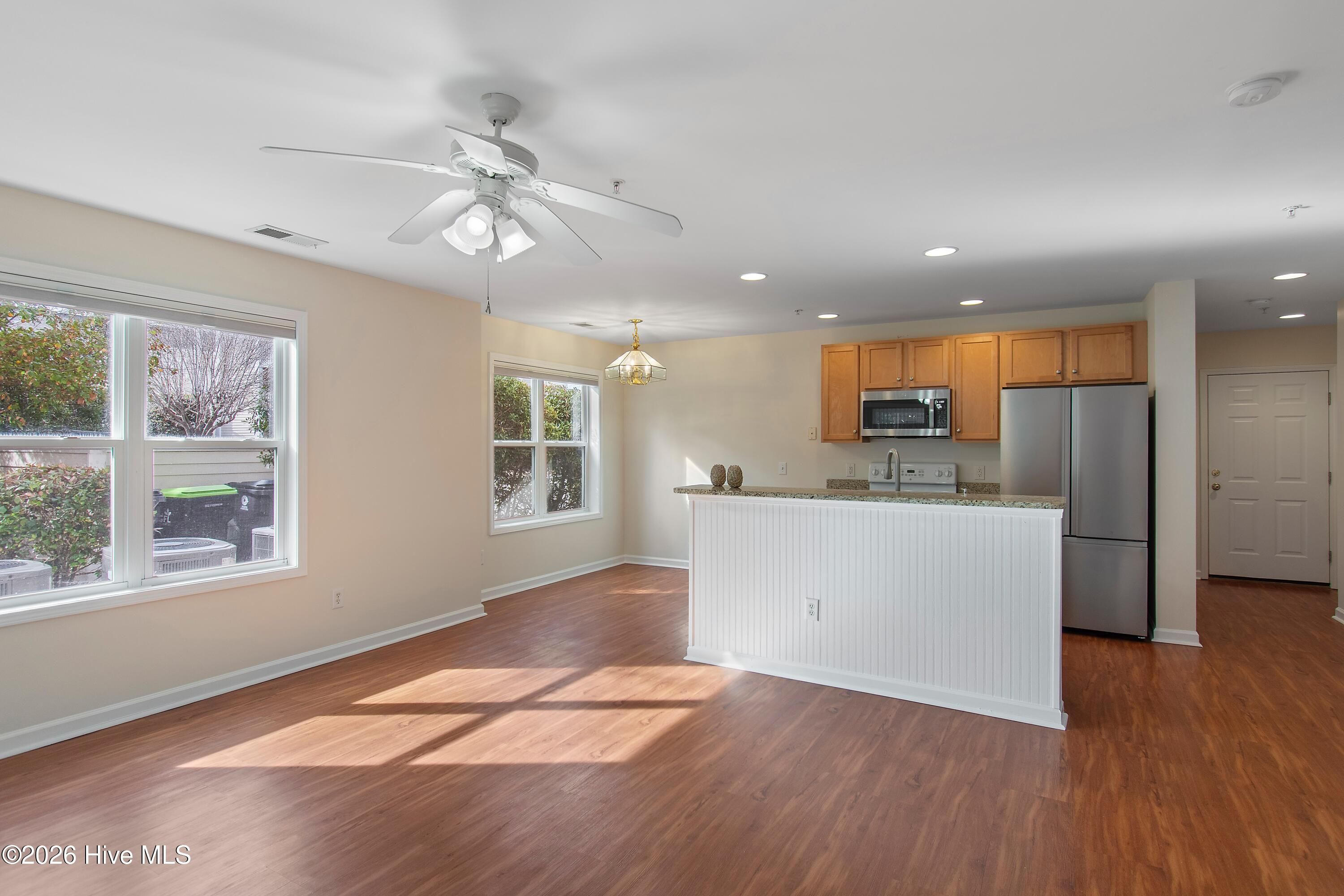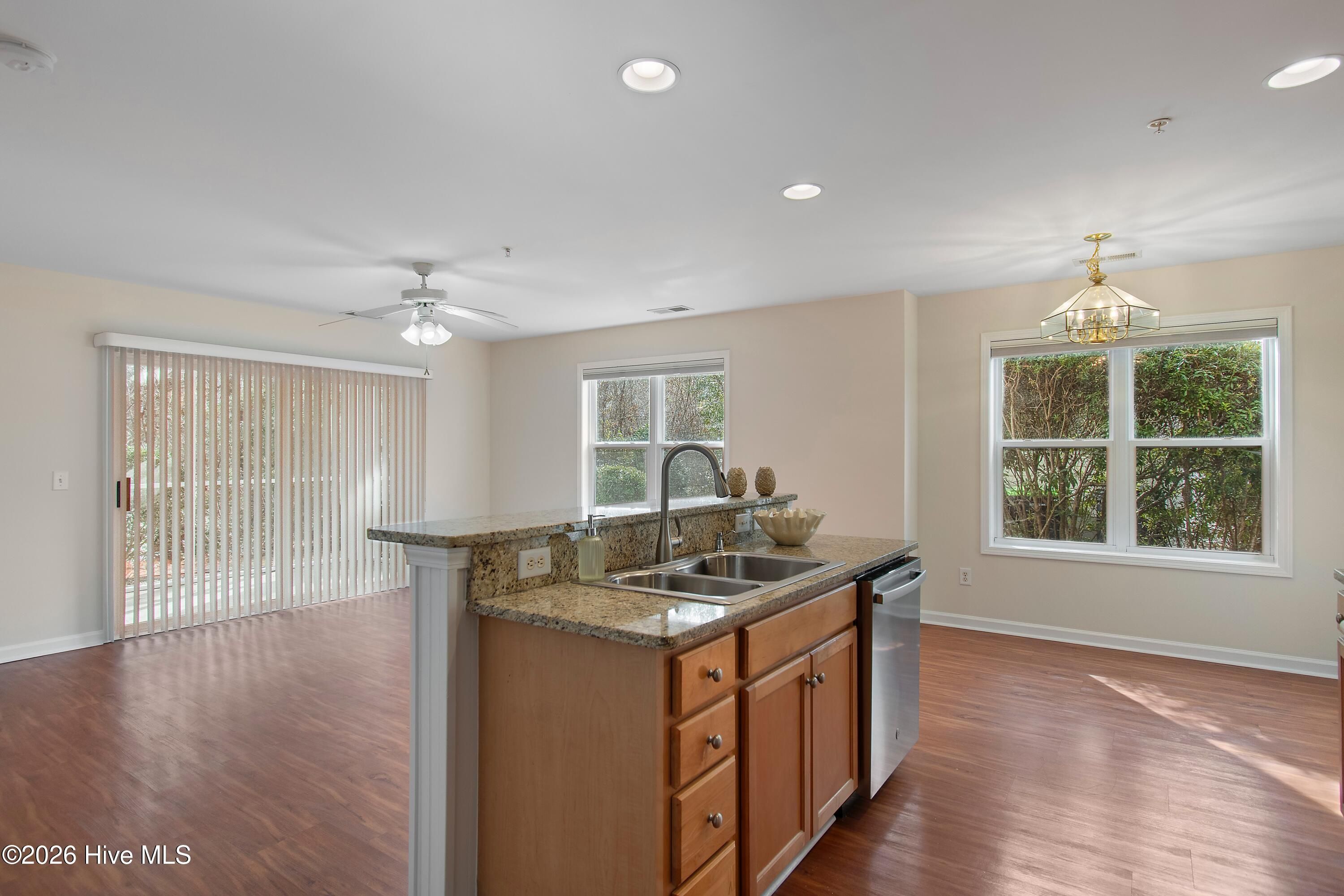 - Solid Surface Counters, Kitchen Island, Ceiling Fan(s), Walk-In Shower, Blinds
