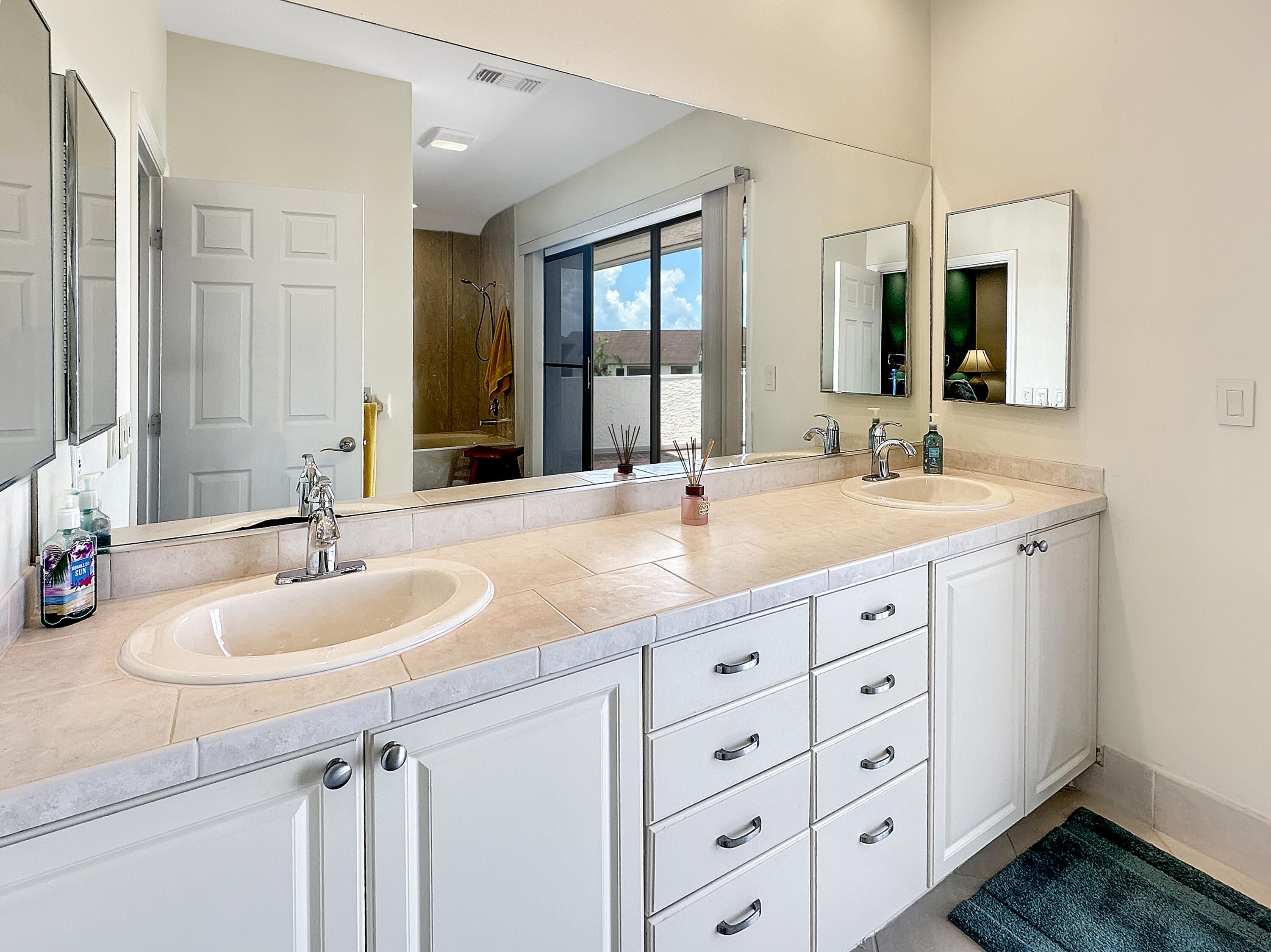 - Custom Mirrors, Entry Level Living Area, Entrance Foyer, Split Bedrooms, High Ceilings, Walk-In Closet(s), Great Room, Living/Dining Room, Blinds, Impact Glass, Sliding Window(s), Window Vertical(s), Dual Sinks, Upper Level Primary, Separate Shower, Bathtub, Washer/Dryer Hookup