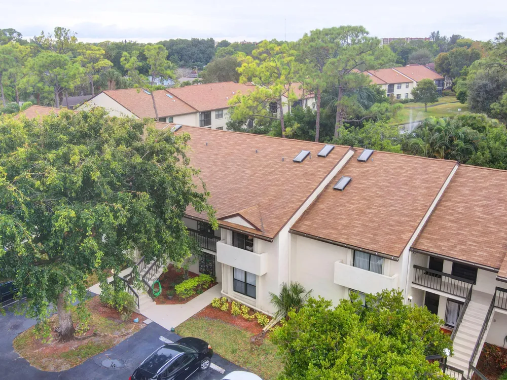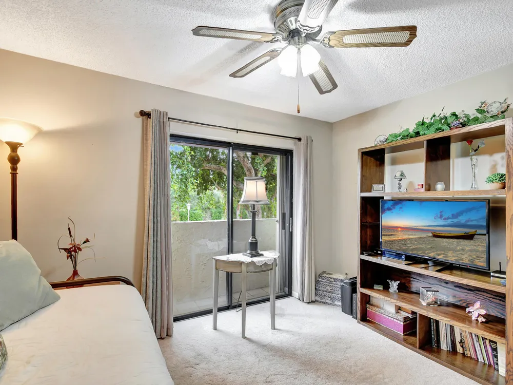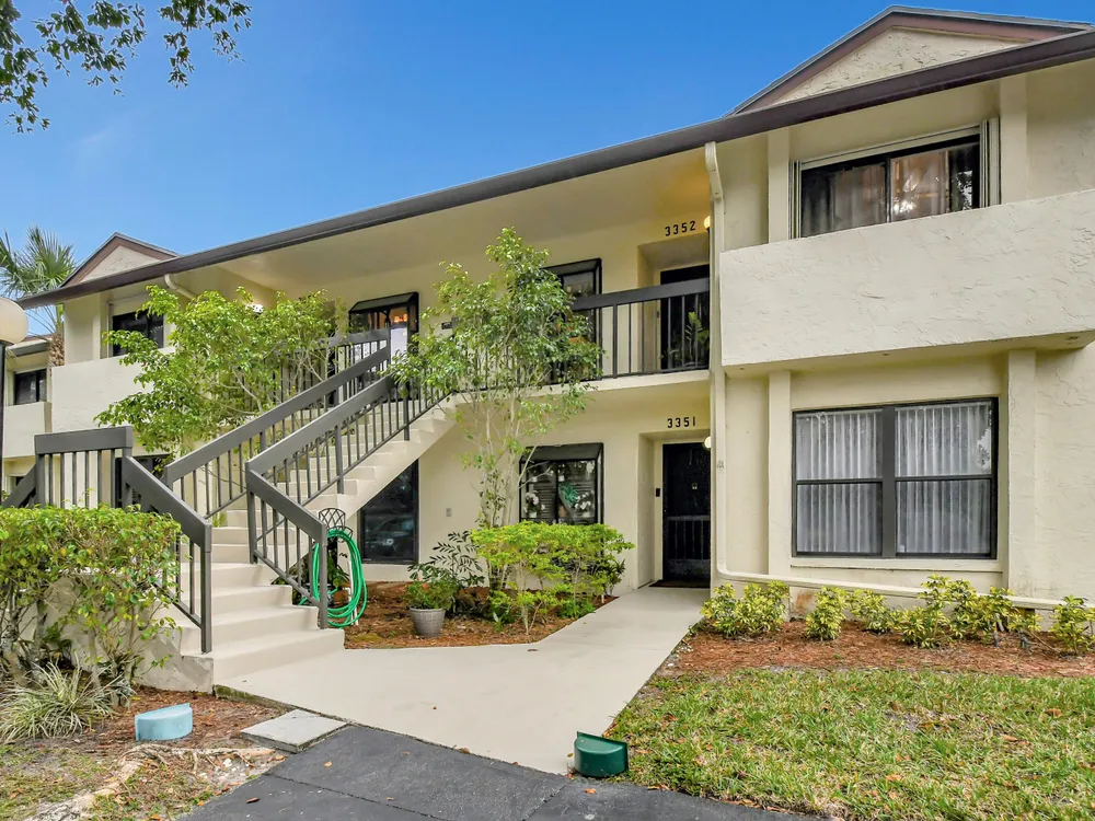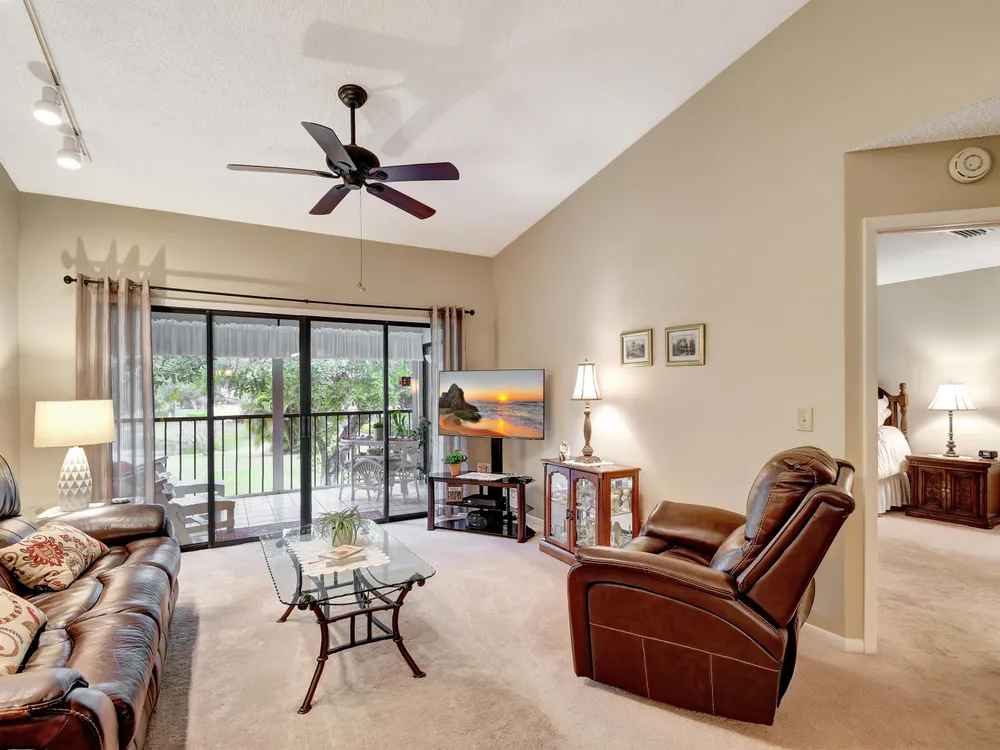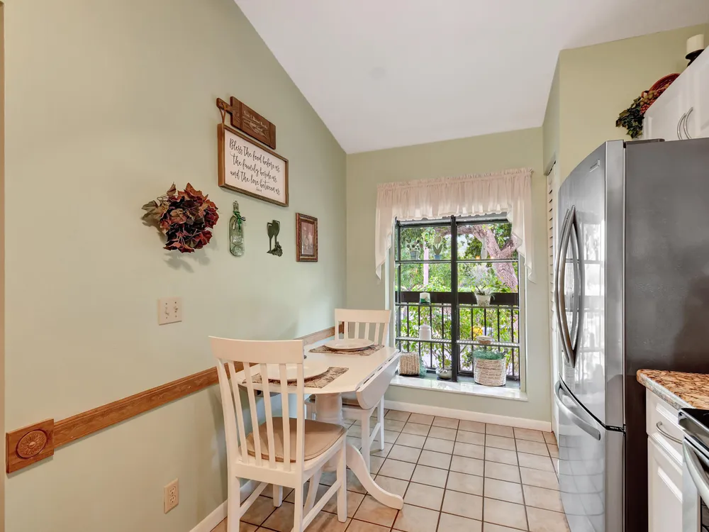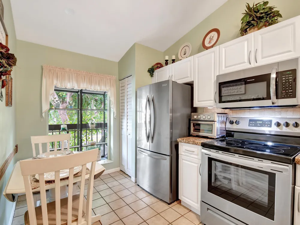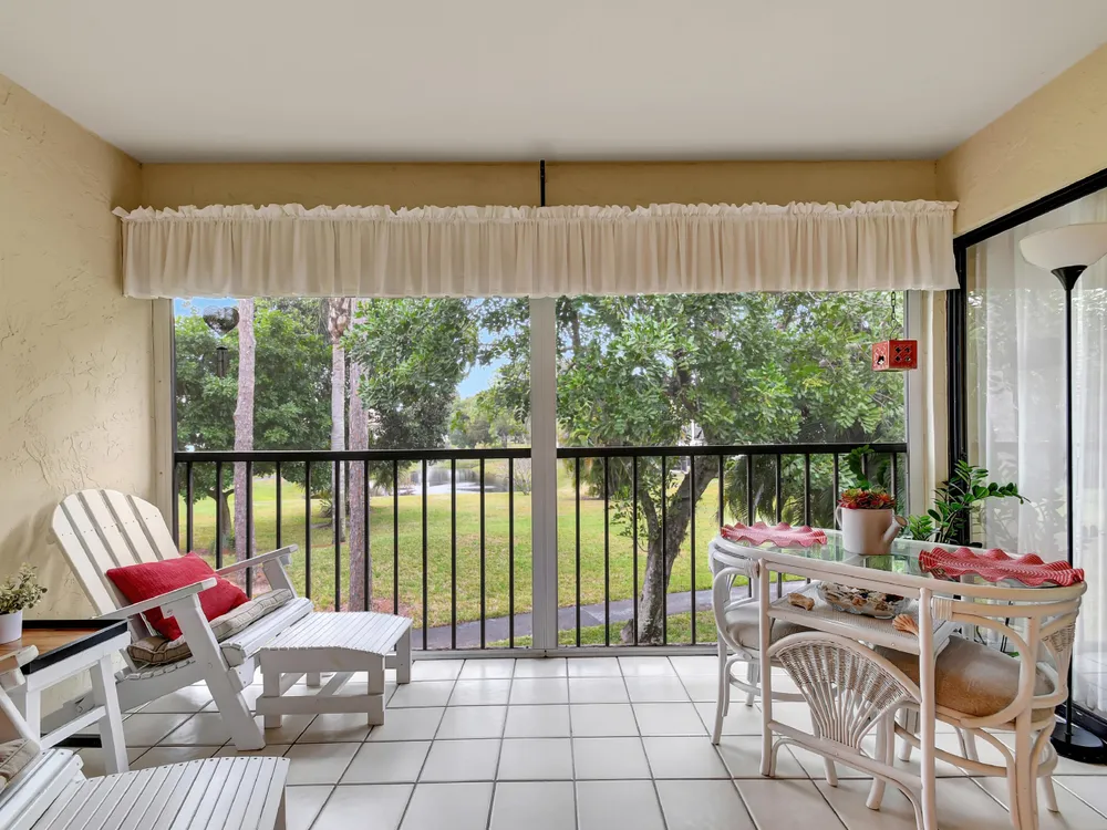 Don't miss out on this beautifully maintained unit with 2/2, vaulted ceilings and serene lake & landscape view from the screened balcony w/sliding doors to living/dining room & master suite. Oversize master suite w/nook area, full bathroom & two closets (1 walk-in). Bathroom w/skylight, shower, new toilet and mirror trim, & refaced cabinet doors. Kitchen w/pantry, breakfast nook, newer SS appliances (8/2023), granite countertop, backsplash, pass through to dining area & refaced cabinet doors. 2nd bedroom w/sliding door to balcony. 2nd bathroom w/skylight & bathtub, new toilet and mirror trim & refaced cabinet doors. 4 yr old washer & dryer. New A/C (9/2024). 4 yr old water heater w/new electrical outlet. Accordion and roll down shutters. Assigned parking space close to stairs. Click