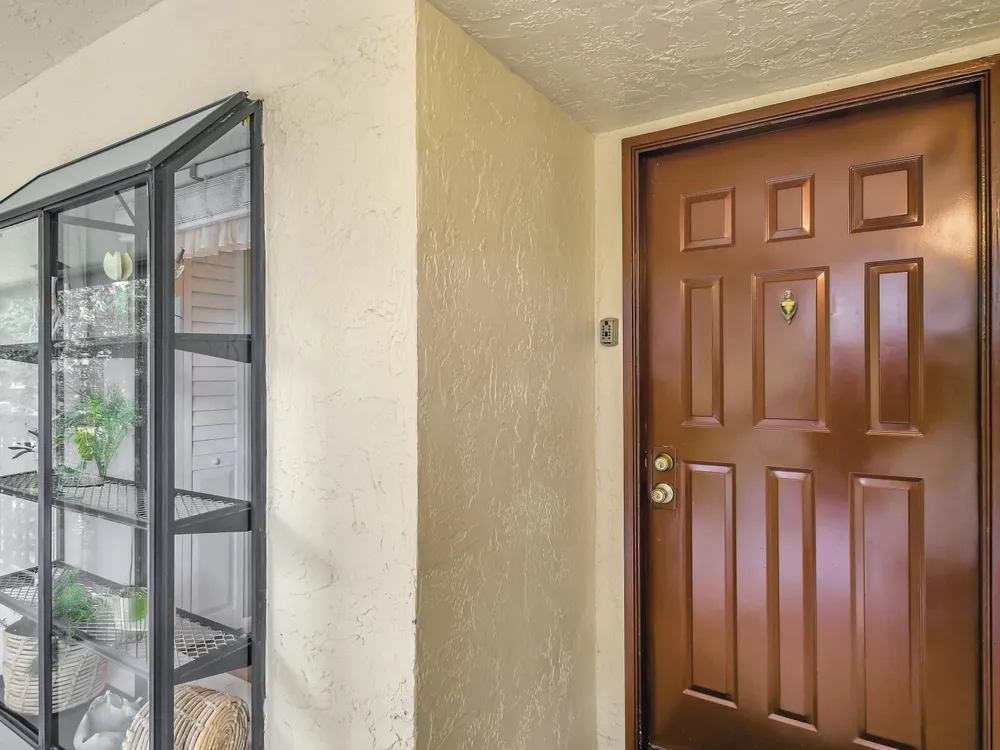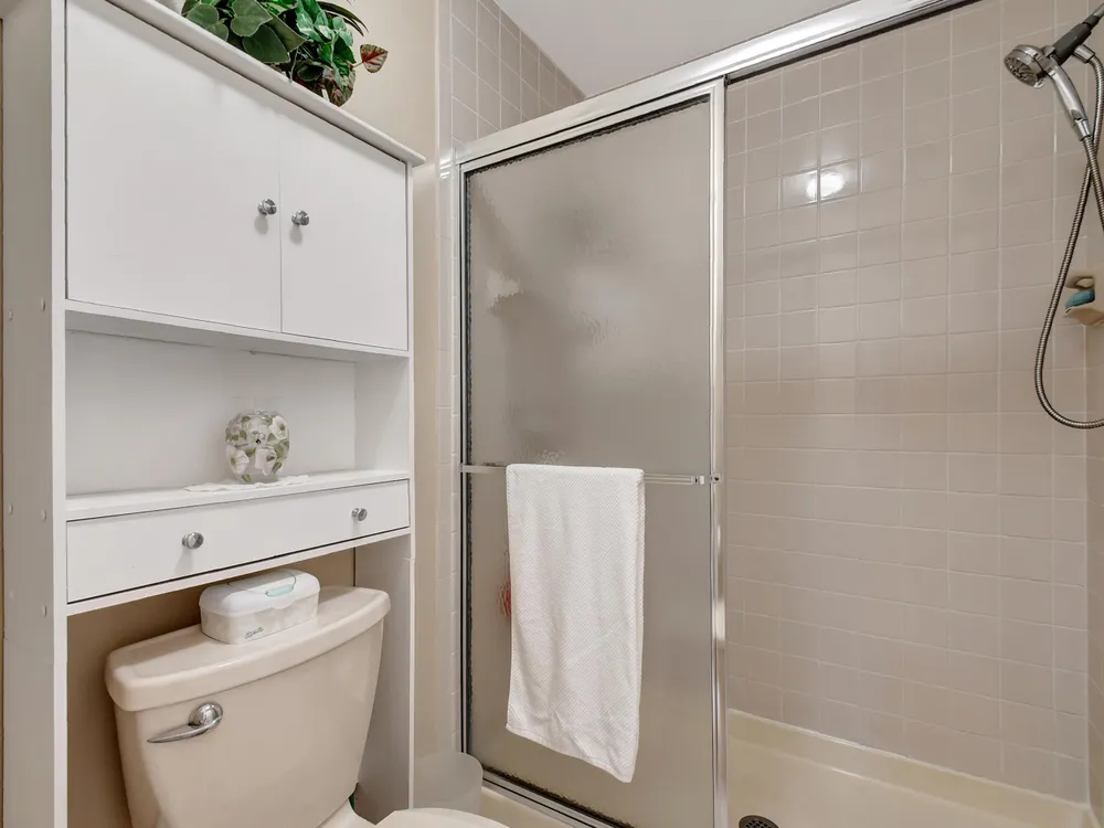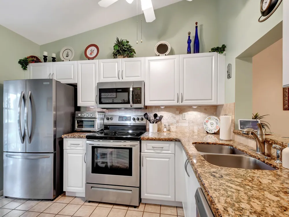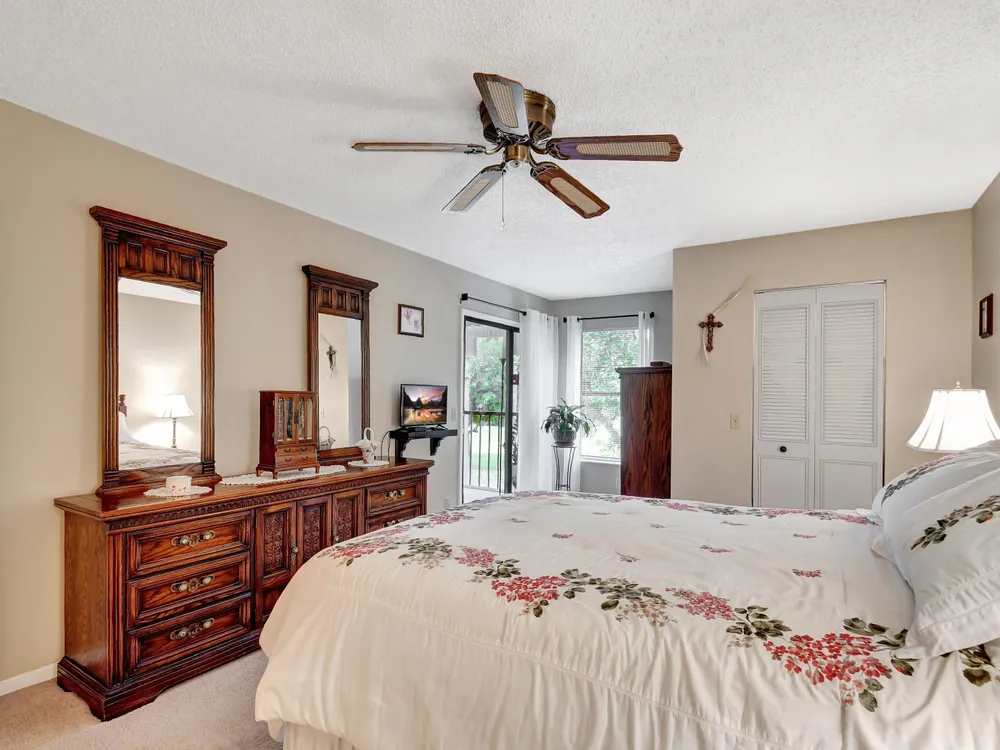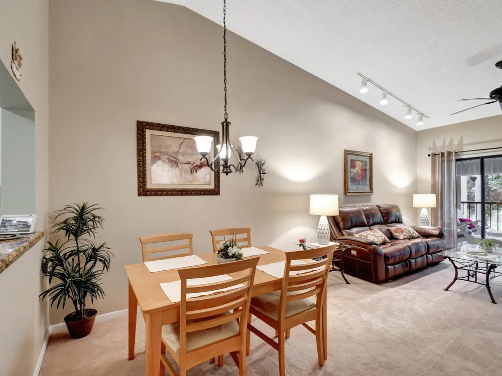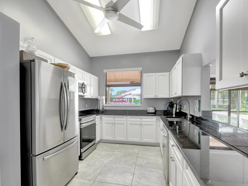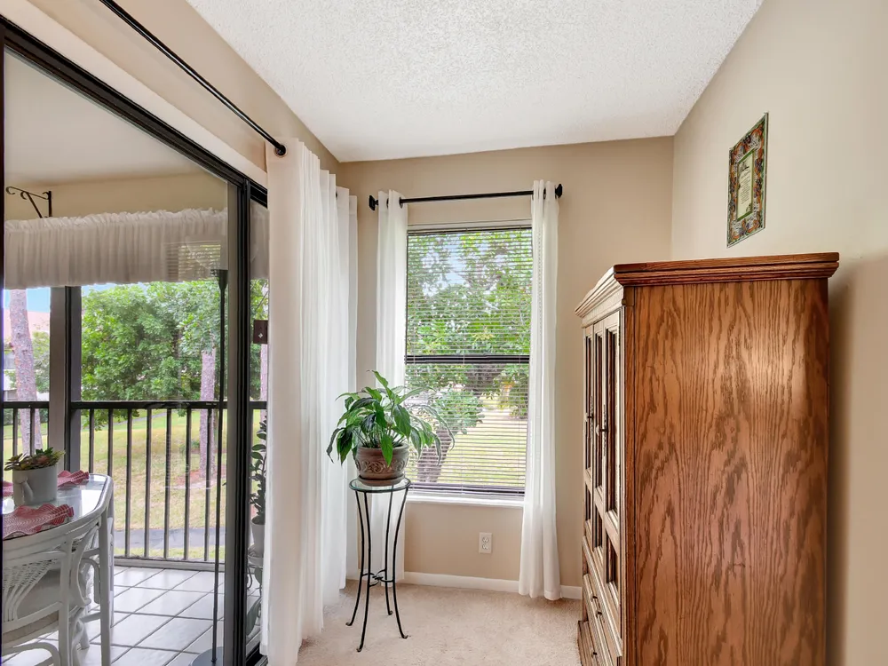 Don't miss out on this beautifully maintained unit with 2/2, vaulted ceilings and serene lake & landscape view from the screened balcony w/sliding doors to living/dining room & master suite. Oversize master suite w/nook area, full bathroom & two closets (1 walk-in). Bathroom w/skylight, shower, new toilet and mirror trim, & refaced cabinet doors. Kitchen w/pantry, breakfast nook, newer SS appliances (8/2023), granite countertop, backsplash, pass through to dining area & refaced cabinet doors. 2nd bedroom w/sliding door to balcony. 2nd bathroom w/skylight & bathtub, new toilet and mirror trim & refaced cabinet doors. 4 yr old washer & dryer. New A/C (9/2024). 4 yr old water heater w/new electrical outlet. Accordion and roll down shutters. Assigned parking space close to stairs. Click