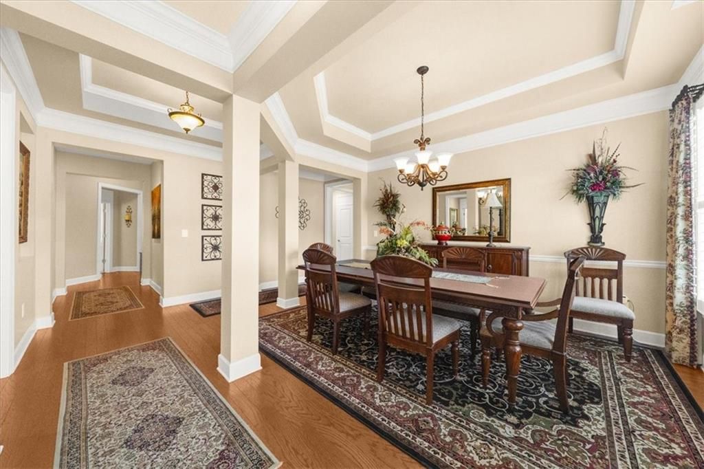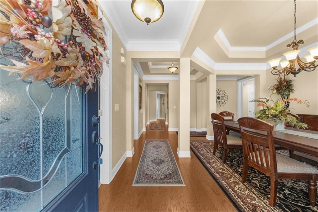 Welcome to the premier 55 + community of Cresswind at Lake Lanier. This REDWOOD model sits on a 25-acre lot that backs up to woods and is conveniently located within walking distance of the clubhouse amenities, the community garden, and the dog park. It has 3 bedrooms, 2.5 baths, an office, dining room, great room, a screened lanai, and an unfinished terrace level. The main floor is 2840 sq ft, and the unfinished terrace level of 2721 sq ft is ready for your customization and is plumbed for a future bath. Pride in ownership shows. A professionally painted interior, beautiful hardwood flooring in the main living areas, elegant crown molding in the dining room, great room, and primary bedroom, and plantation shutters adorn every window. The elegant formal dining room features crown molding, a tray ceiling, and a chandelier, and can easily seat 12+. The office is located at the front of the home, offering a nice view of the comings and goings of the neighborhood, and a TV connection can make this room a second TV room. The gourmet kitchen is a chef’s dream, offering plenty of cabinets with slide-outs for convenience, a large center island, a breakfast bar, a walk-in pantry, stainless-steel appliances, including double ovens, a gas cooktop, a microwave, a refrigerator, and recessed lighting. The great room has an open sunroom that adds space for a casual dining table, a card table, or a reading area. The gas-log fireplace offers bookshelves and a cabinet on each side. Plenty of light for the room comes from a sun tunnel and recessed lighting. A ceiling fan will keep you cool in the warm summer months. Relax in the screened lanai overlooking the woods and enjoy the two ceiling fans for comfort. The large primary suite has lots of light streaming in from the abundant windows. It includes two walk-in closets, a walk-in shower, a dual vanity with framed mirrors, and a makeup vanity. The second and third bedrooms on the other side of the home have walk-in closets and share a Jack-and-Jill bath with a shower/tub combination and separate vanities. Completing the home are a powder room and a spacious laundry room with cabinets for storage. The desirable EXTENDED garage has a textured, epoxy floor. The unfinished terrace level is plumbed for a bath, offers storage or can be finished to your needs, and opens to a spacious patio and backyard. Cresswind is located on the shores of beautiful Lake Lanier. The amenities include a 43,000 square-foot, three-story clubhouse featuring indoor and outdoor pools, kayaking, fishing, boat docks, courtesy docks, over 120 clubs, an arts and crafts room, pickle ball, tennis, basketball, gym, dance and fitness classes, poker, games, billiards, theater, music performances, chorus, concerts, dances, and more. The community has a full-time activities director, property manager, and maintenance staff. Residents are noted for being welcoming and for integrating new members into the community. Head up to TGIF each week to meet new friends! I have lived here for 12+ years. I know you will enjoy the Cresswind lifestyle as much as I do!
