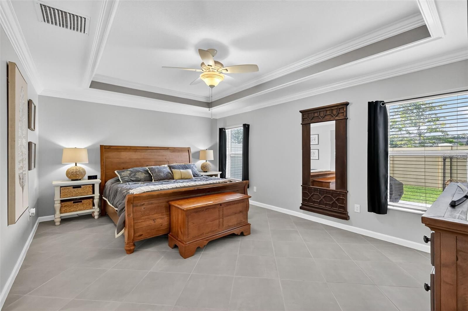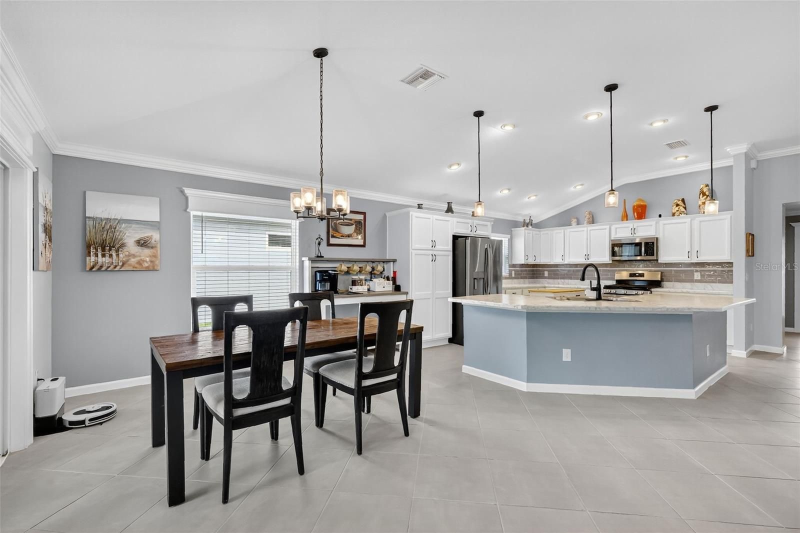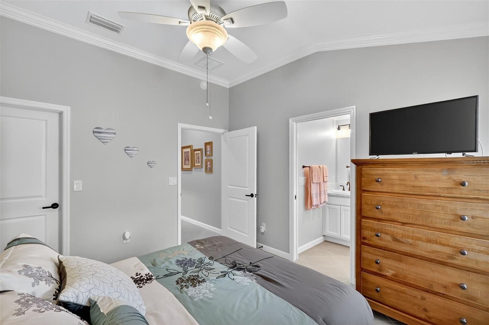 - Ceiling Fan(s), Crown Molding, Eat-in Kitchen, High Ceilings, Living/Dining Room, Open Floorplan, Main Level Primary, Split Bedrooms, Thermostat, Tray Ceiling(s), Vaulted Ceiling(s), Walk-In Closet(s)