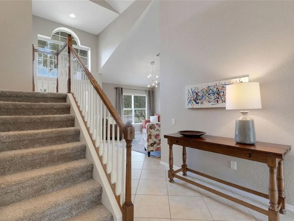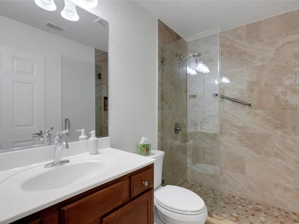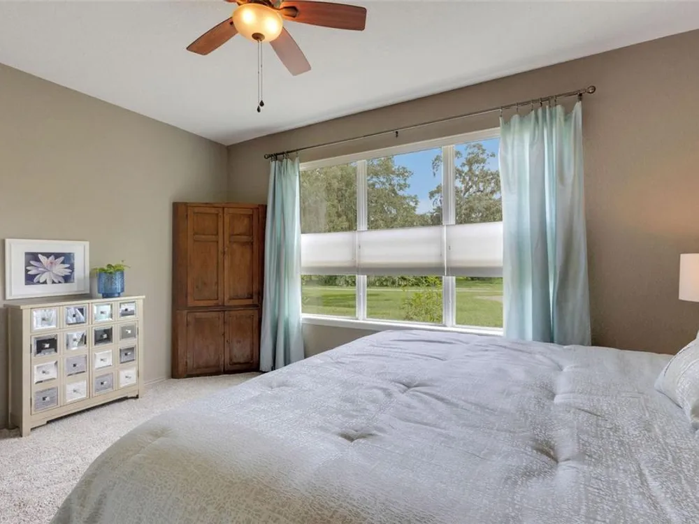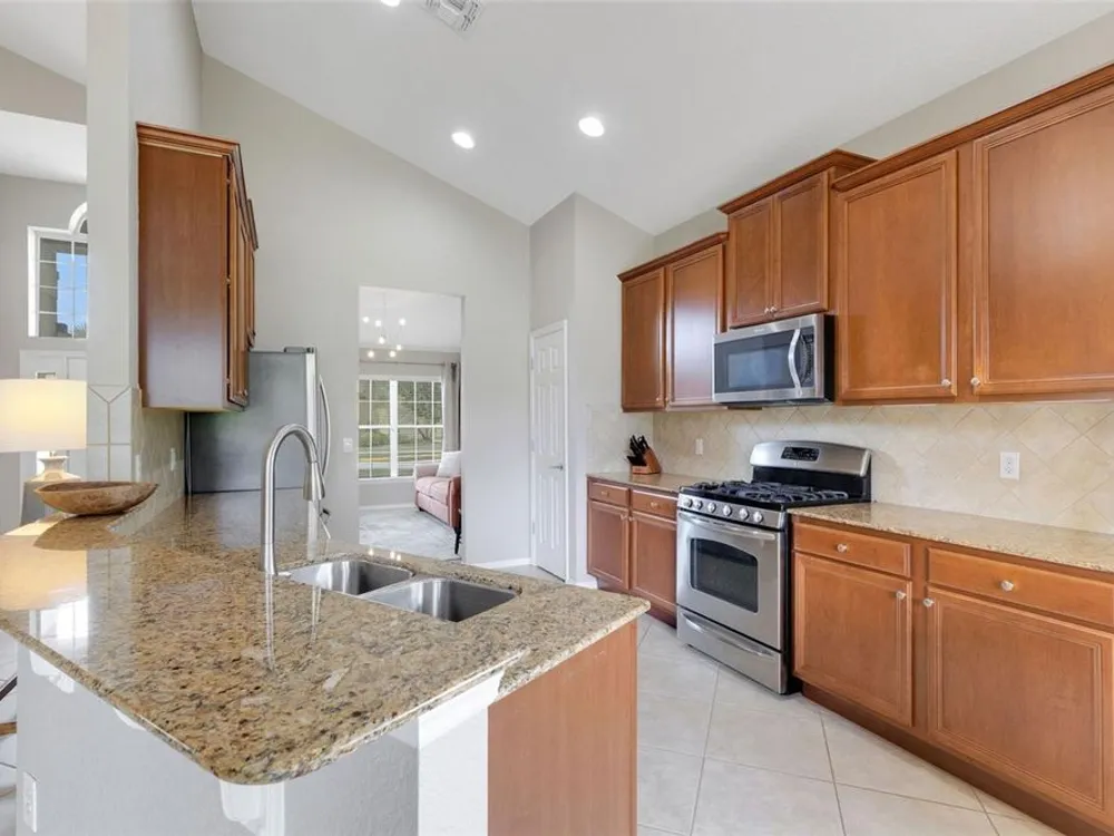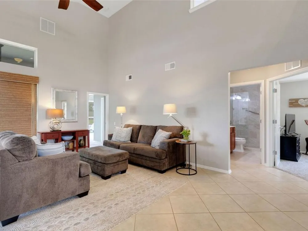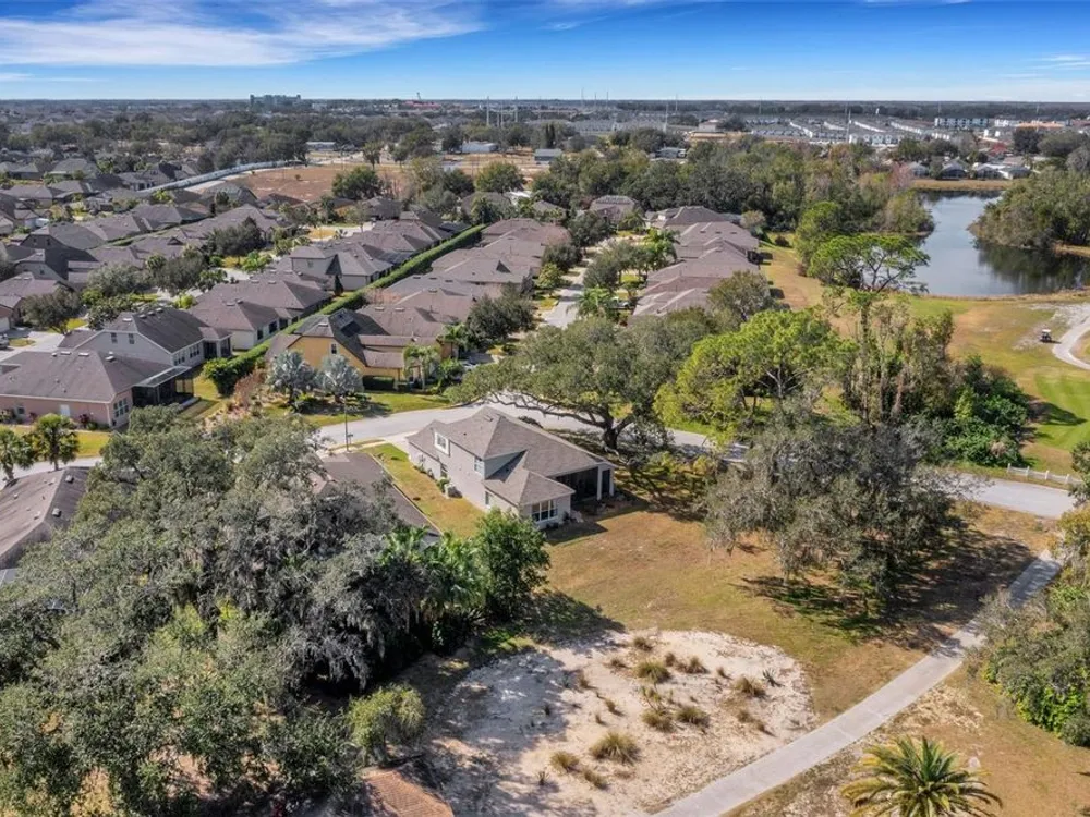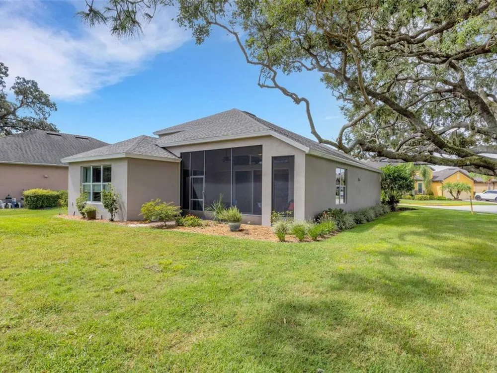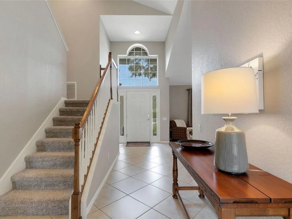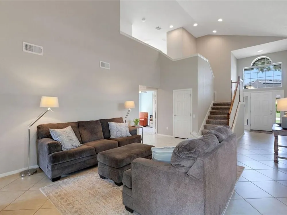 Drive through the gates into the oasis that is Del Webb Orlando and fall in love with this beautifully updated two-story residence. On a prestigious corner lot with a stunning mature live oak tree and overlooking the White Heron golf course, this immaculate 2,086-square-foot home combines timeless style with modern upgrades. The floor plan features a first-floor primary suite with a luxuriously remodeled bath and walk-in closet and a second bedroom/den with an adjoining remodeled bath. The primary suite bathroom features two sinks with quartz countertops, a stand-alone modern tub, modern floor-to-ceiling tiles, walk-in shower, linen closet, and private water-closet. The second bathroom features a remodeled floor-to-ceiling tiled shower with glass doors. The upstairs loft houses the third bedroom, bathroom with a tub convenient for children’s baths, and lovely front room full of natural light perfect for a sitting room, art room, or office. Ceiling fans throughout the house provide year-round comfort. You enter the home through the front door with side lights into the airy, open floor plan onto the enclosed lanai with golf course view. The eat-in kitchen features stainless steel appliances, a recently purchased refrigerator with French doors and two freezer drawers, gas stove, granite countertops, wood cabinets with bottom pull-outs and a tile backsplash. The property’s prime location has tons of space to build the lanai of your dreams. For space launch lovers, sit on your lanai and watch exciting Cape Canaveral launches day or night. Recent improvements to the home include a new roof installed in 2023, two remodeled bathrooms with comfort height toilets, fresh interior paint, new upstairs flooring, and an upgraded made-in-USA stainless steel Navien tankless hot water heater for maximum efficiency and energy savings installed in 2025. The $425 semi-annual HOA fee provides 24x7 staffed security gate and master association-owned private road maintenance. Adjacent to recently renovated 18-hole White Heron Golf Club. The $328 monthly Del Webb HOA fee includes lawn maintenance and exclusive access to resident-owned 30,000+ SF Montecito clubhouse and amenities. DEL WEBB ORLANDO is a 55+ community with a tavern, indoor walking track, fitness center, indoor and outdoor pools and spas with locker rooms and showers, billiards, ping pong, craft room, and a ballroom for special events. Outdoor activities include pickleball, tennis, bocce, basketball, shuffleboard, community gardening center, an outdoor amphitheater, large brick fire pit and large screened-in gazebo over the water. Miles of biking and walking trails within Ridgewood Lakes gated community. Located conveniently to shopping at Posner Park (4 miles), Disney World, Universal Studios, Orlando & Central FL entertainment nearby. Easy access to I-4, medical facilities, airports & Sunrail Station. Advent Health hospital is 3 miles away.