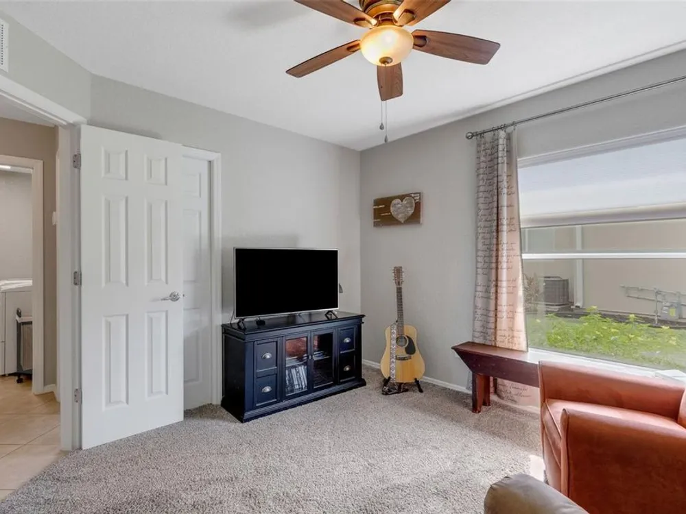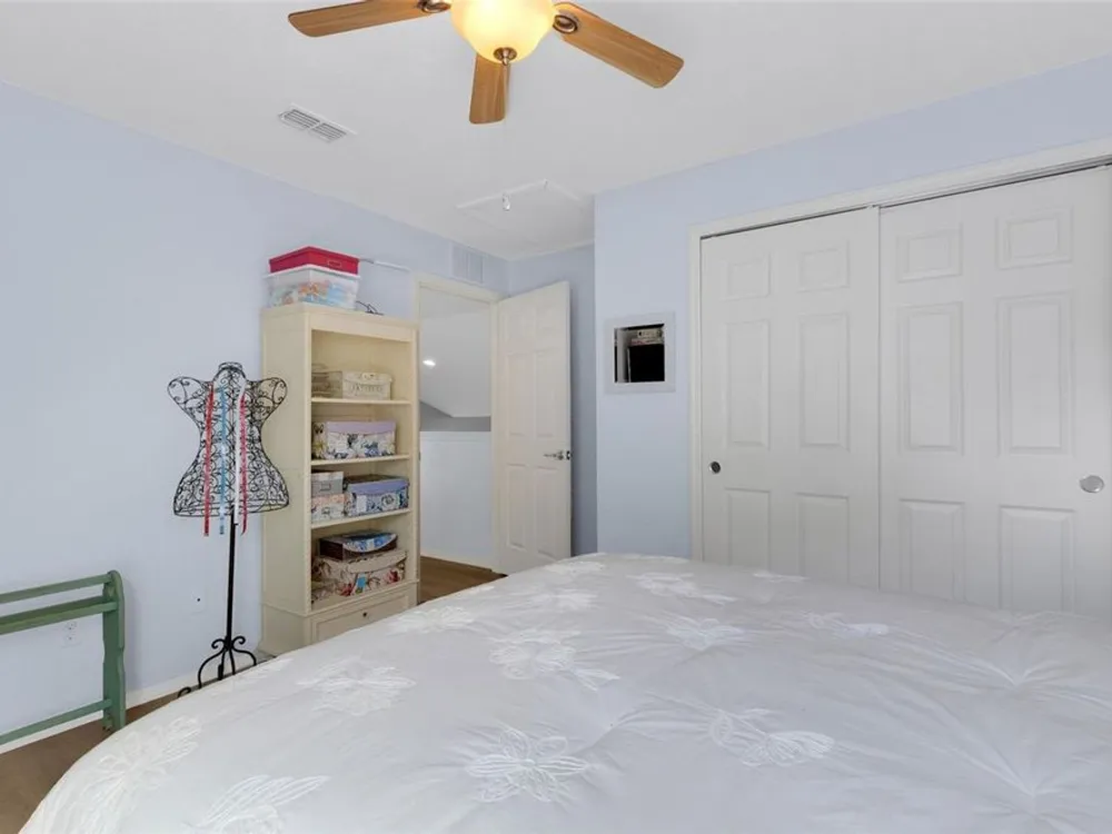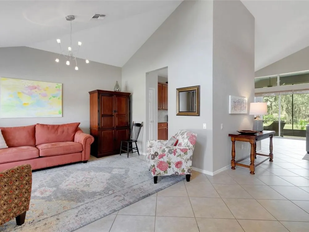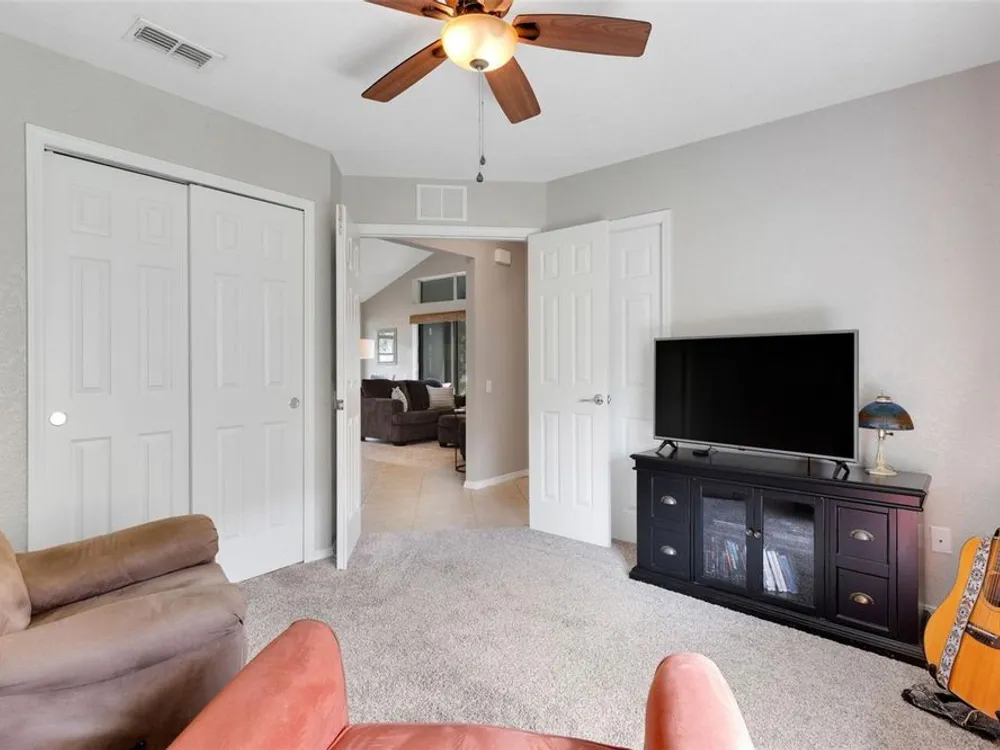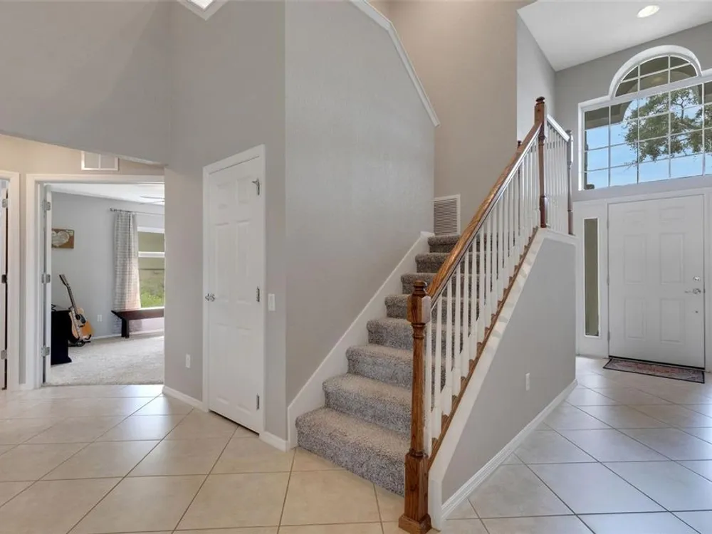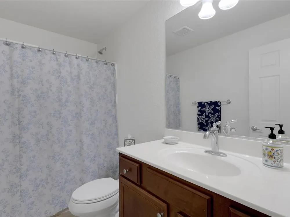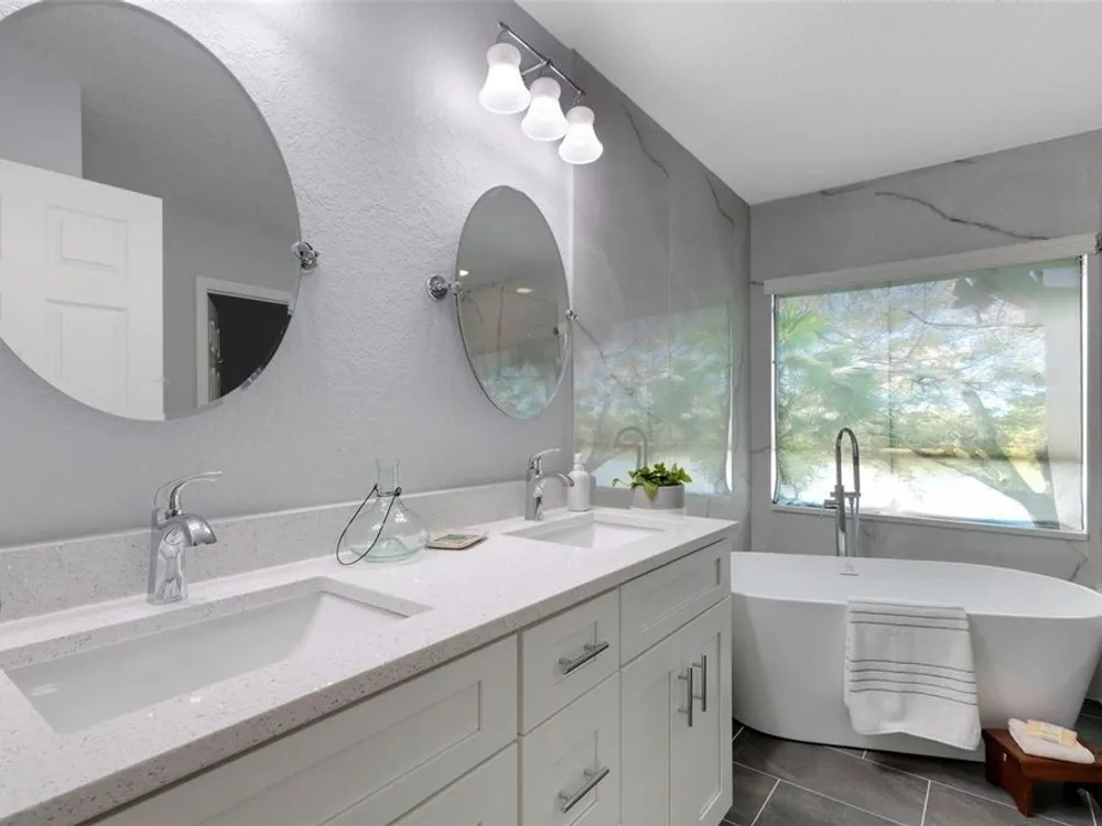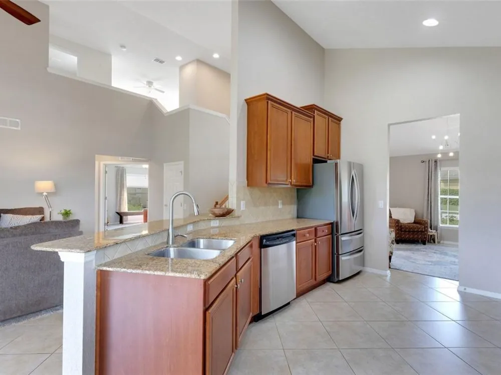 Drive through the gates into the oasis that is Del Webb Orlando and fall in love with this beautifully updated two-story residence. On a prestigious corner lot with a stunning mature live oak tree and overlooking the White Heron golf course, this immaculate 2,086-square-foot home combines timeless style with modern upgrades. The floor plan features a first-floor primary suite with a luxuriously remodeled bath and walk-in closet and a second bedroom/den with an adjoining remodeled bath. The primary suite bathroom features two sinks with quartz countertops, a stand-alone modern tub, modern floor-to-ceiling tiles, walk-in shower, linen closet, and private water-closet. The second bathroom features a remodeled floor-to-ceiling tiled shower with glass doors. The upstairs loft houses the third bedroom, bathroom with a tub convenient for children’s baths, and lovely front room full of natural light perfect for a sitting room, art room, or office. Ceiling fans throughout the house provide year-round comfort. You enter the home through the front door with side lights into the airy, open floor plan onto the enclosed lanai with golf course view. The eat-in kitchen features stainless steel appliances, a recently purchased refrigerator with French doors and two freezer drawers, gas stove, granite countertops, wood cabinets with bottom pull-outs and a tile backsplash. The property’s prime location has tons of space to build the lanai of your dreams. For space launch lovers, sit on your lanai and watch exciting Cape Canaveral launches day or night. Recent improvements to the home include a new roof installed in 2023, two remodeled bathrooms with comfort height toilets, fresh interior paint, new upstairs flooring, and an upgraded made-in-USA stainless steel Navien tankless hot water heater for maximum efficiency and energy savings installed in 2025. The $425 semi-annual HOA fee provides 24x7 staffed security gate and master association-owned private road maintenance. Adjacent to recently renovated 18-hole White Heron Golf Club. The $328 monthly Del Webb HOA fee includes lawn maintenance and exclusive access to resident-owned 30,000+ SF Montecito clubhouse and amenities. DEL WEBB ORLANDO is a 55+ community with a tavern, indoor walking track, fitness center, indoor and outdoor pools and spas with locker rooms and showers, billiards, ping pong, craft room, and a ballroom for special events. Outdoor activities include pickleball, tennis, bocce, basketball, shuffleboard, community gardening center, an outdoor amphitheater, large brick fire pit and large screened-in gazebo over the water. Miles of biking and walking trails within Ridgewood Lakes gated community. Located conveniently to shopping at Posner Park (4 miles), Disney World, Universal Studios, Orlando & Central FL entertainment nearby. Easy access to I-4, medical facilities, airports & Sunrail Station. Advent Health hospital is 3 miles away.