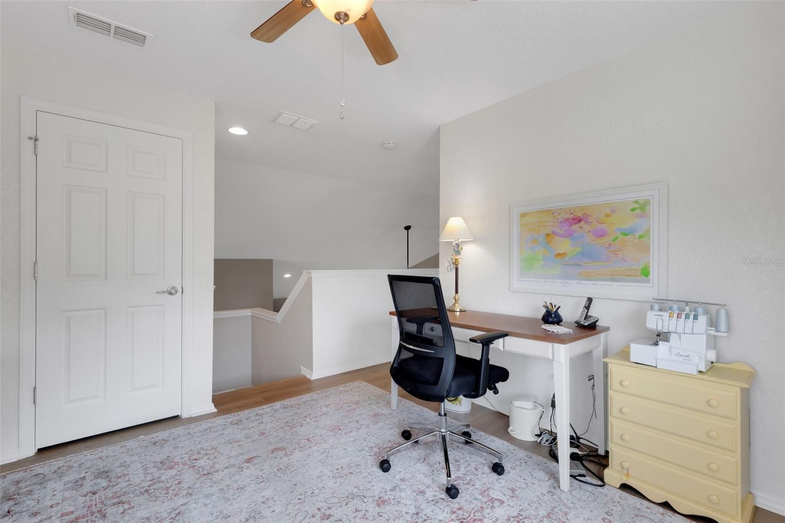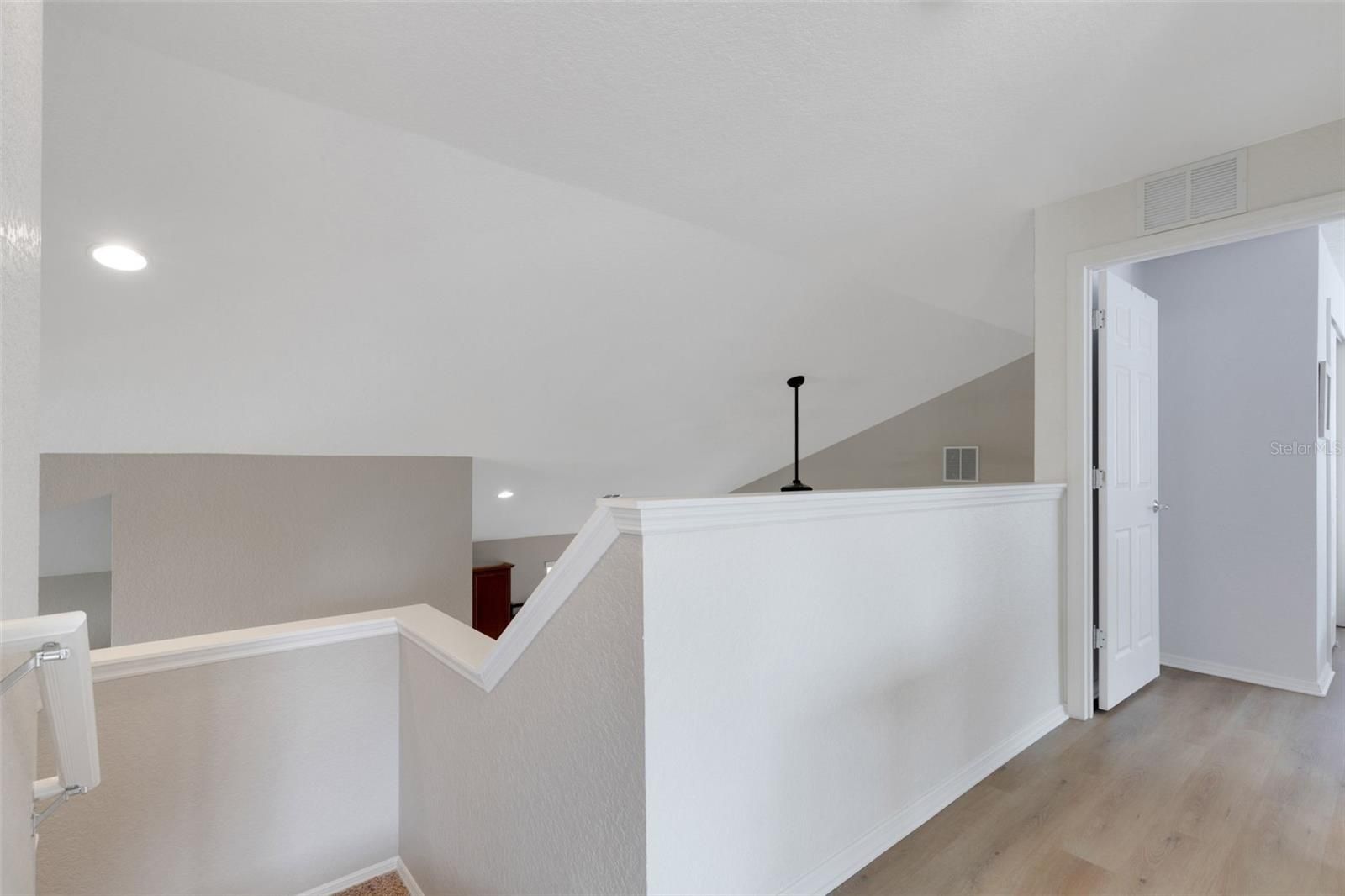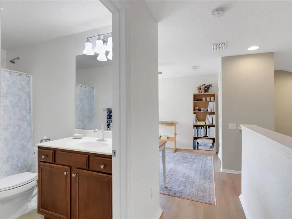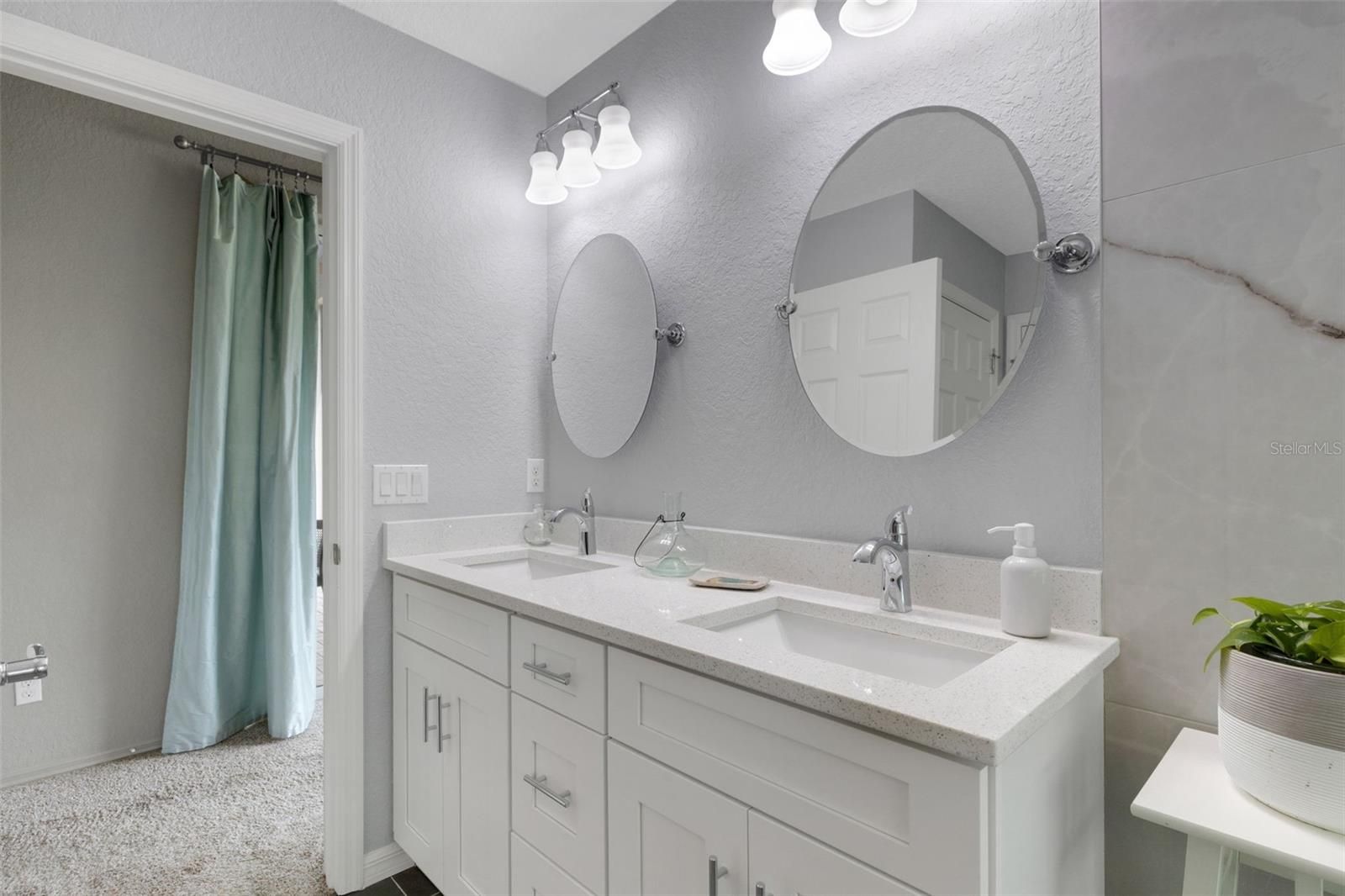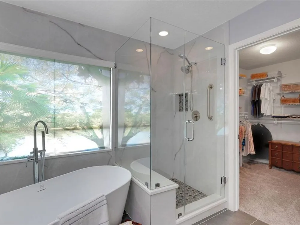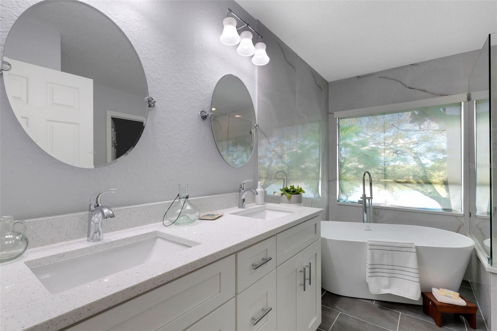 Drive through the gates into the oasis that is Del Webb Orlando and fall in love with this beautifully updated two-story residence. On a prestigious corner lot with a stunning mature live oak tree and overlooking the White Heron golf course, this immaculate 2,086-square-foot home combines timeless style with modern upgrades. The floor plan features a first-floor primary suite with a luxuriously remodeled bath and walk-in closet and a second bedroom/den with an adjoining remodeled bath. The primary suite bathroom features two sinks with quartz countertops, a stand-alone modern tub, modern floor-to-ceiling tiles, walk-in shower, linen closet, and private water-closet. The second bathroom features a remodeled floor-to-ceiling tiled shower with glass doors. The upstairs loft houses the third bedroom, bathroom with a tub convenient for children’s baths, and lovely front room full of natural light perfect for a sitting room, art room, or office. Ceiling fans throughout the house provide year-round comfort. You enter the home through the front door with side lights into the airy, open floor plan onto the enclosed lanai with golf course view. The eat-in kitchen features stainless steel appliances, a recently purchased refrigerator with French doors and two freezer drawers, gas stove, granite countertops, wood cabinets with bottom pull-outs and a tile backsplash. The property’s prime location has tons of space to build the lanai of your dreams. For space launch lovers, sit on your lanai and watch exciting Cape Canaveral launches day or night. Recent improvements to the home include a new roof installed in 2023, two remodeled bathrooms with comfort height toilets, fresh interior paint, new upstairs flooring, and an upgraded made-in-USA stainless steel Navien tankless hot water heater for maximum efficiency and energy savings installed in 2025. The $425 semi-annual HOA fee provides 24x7 staffed security gate and master association-owned private road maintenance. Adjacent to recently renovated 18-hole White Heron Golf Club. The $328 monthly Del Webb HOA fee includes lawn maintenance and exclusive access to resident-owned 30,000+ SF Montecito clubhouse and amenities. DEL WEBB ORLANDO is a 55+ community with a tavern, indoor walking track, fitness center, indoor and outdoor pools and spas with locker rooms and showers, billiards, ping pong, craft room, and a ballroom for special events. Outdoor activities include pickleball, tennis, bocce, basketball, shuffleboard, community gardening center, an outdoor amphitheater, large brick fire pit and large screened-in gazebo over the water. Miles of biking and walking trails within Ridgewood Lakes gated community. Located conveniently to shopping at Posner Park (4 miles), Disney World, Universal Studios, Orlando & Central FL entertainment nearby. Easy access to I-4, medical facilities, airports & Sunrail Station. Advent Health hospital is 3 miles away.