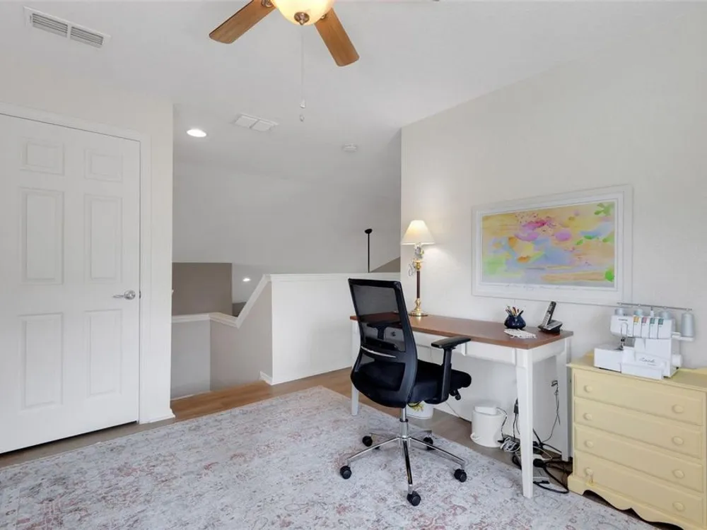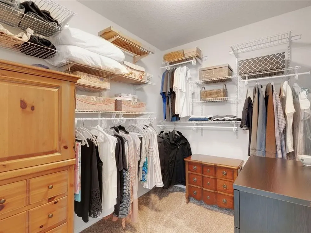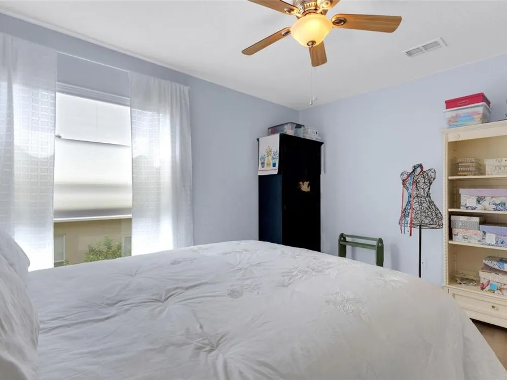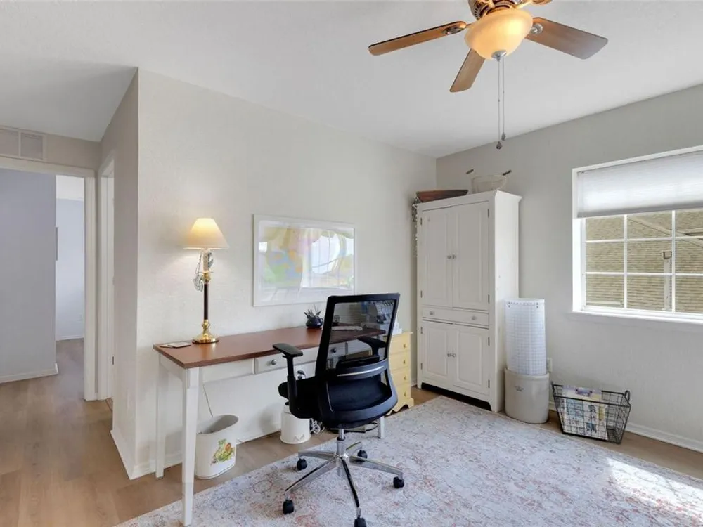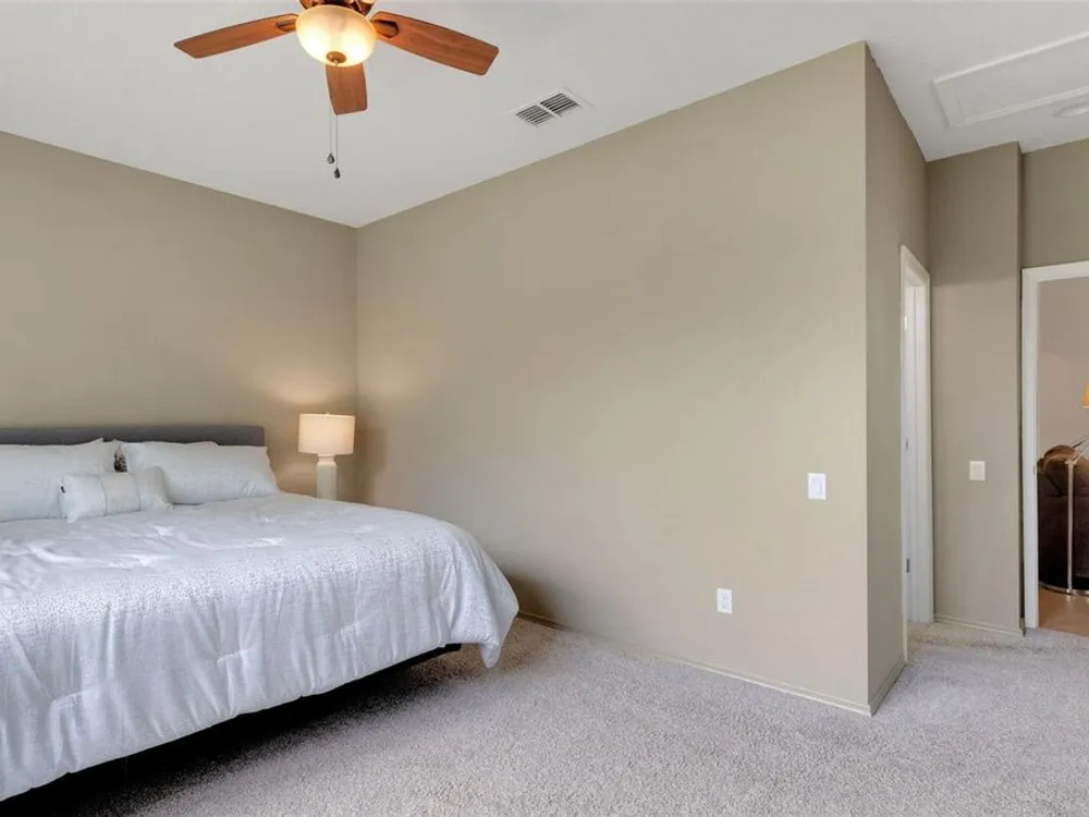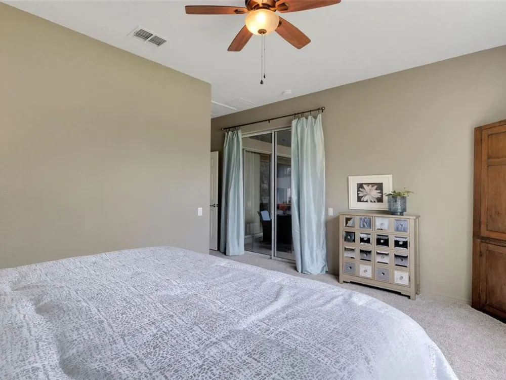 - Ceiling Fan(s), Eat-in Kitchen, High Ceilings, Open Floorplan, Main Level Primary, Split Bedrooms, Stone Counters, Thermostat, Walk-In Closet(s), Window Treatments