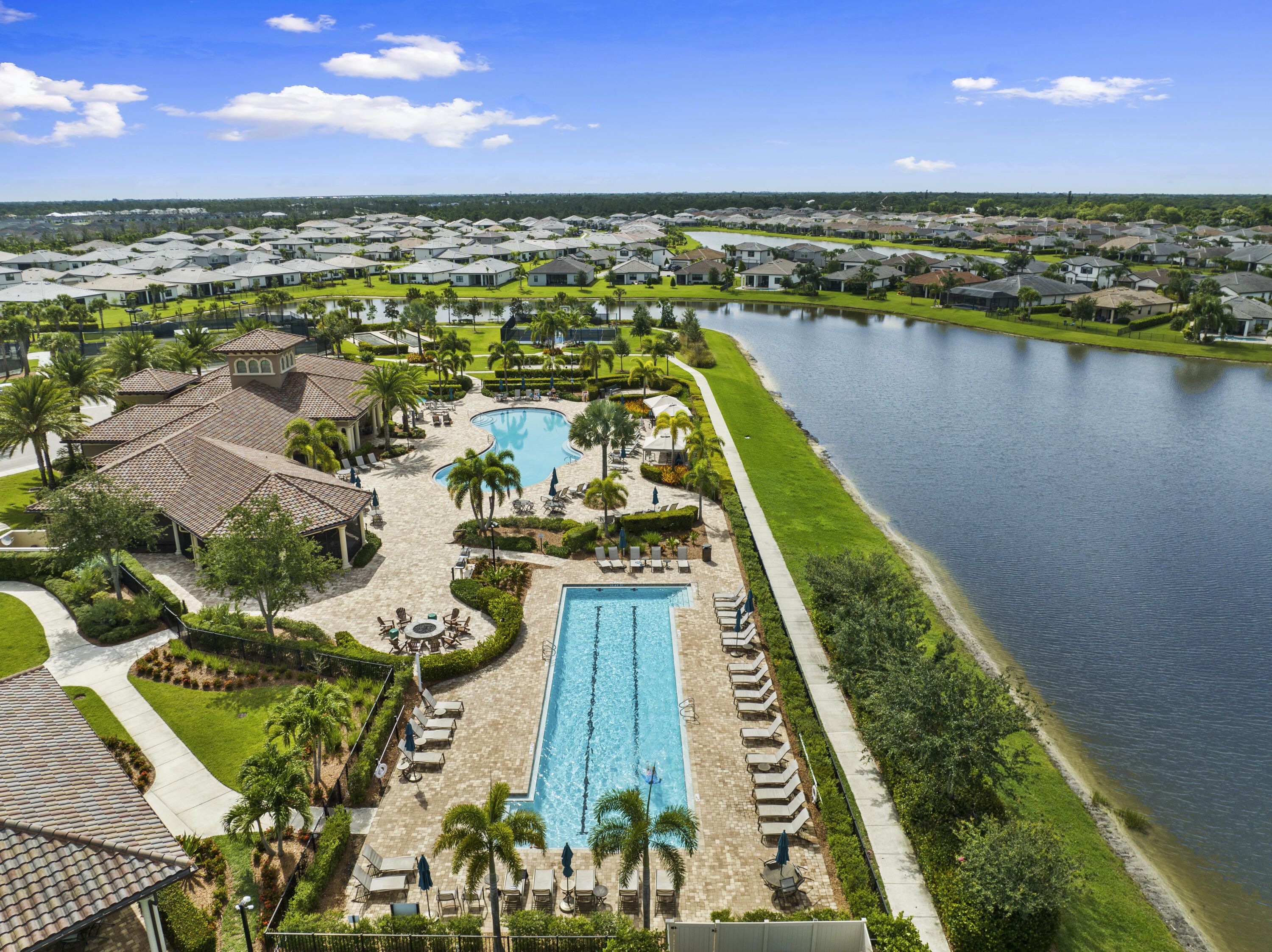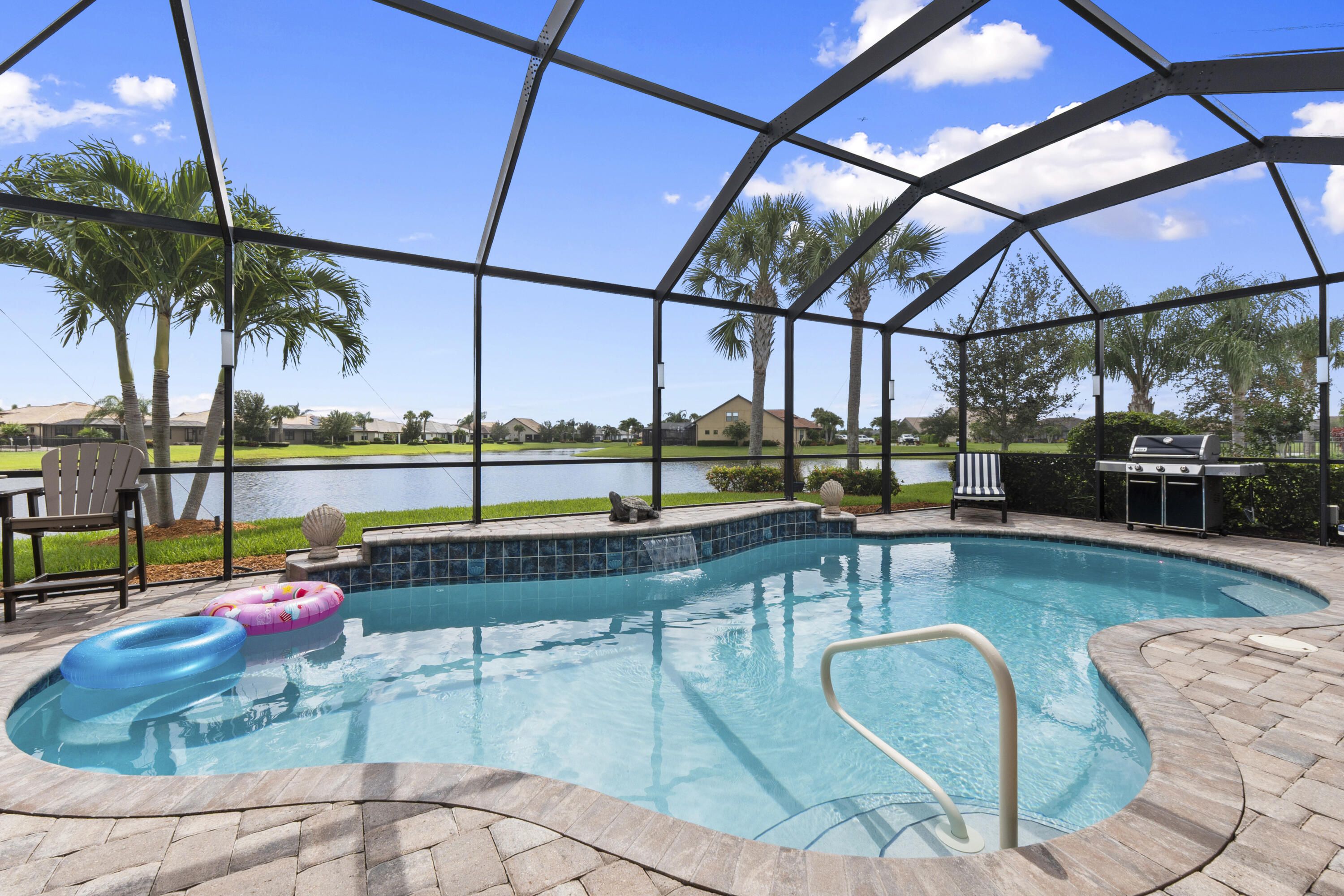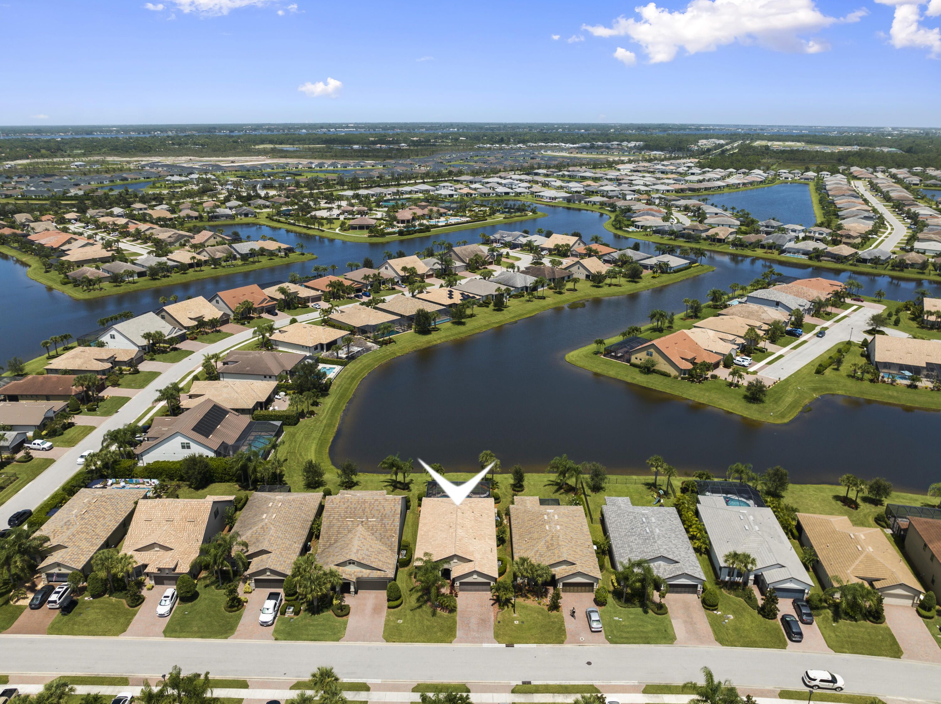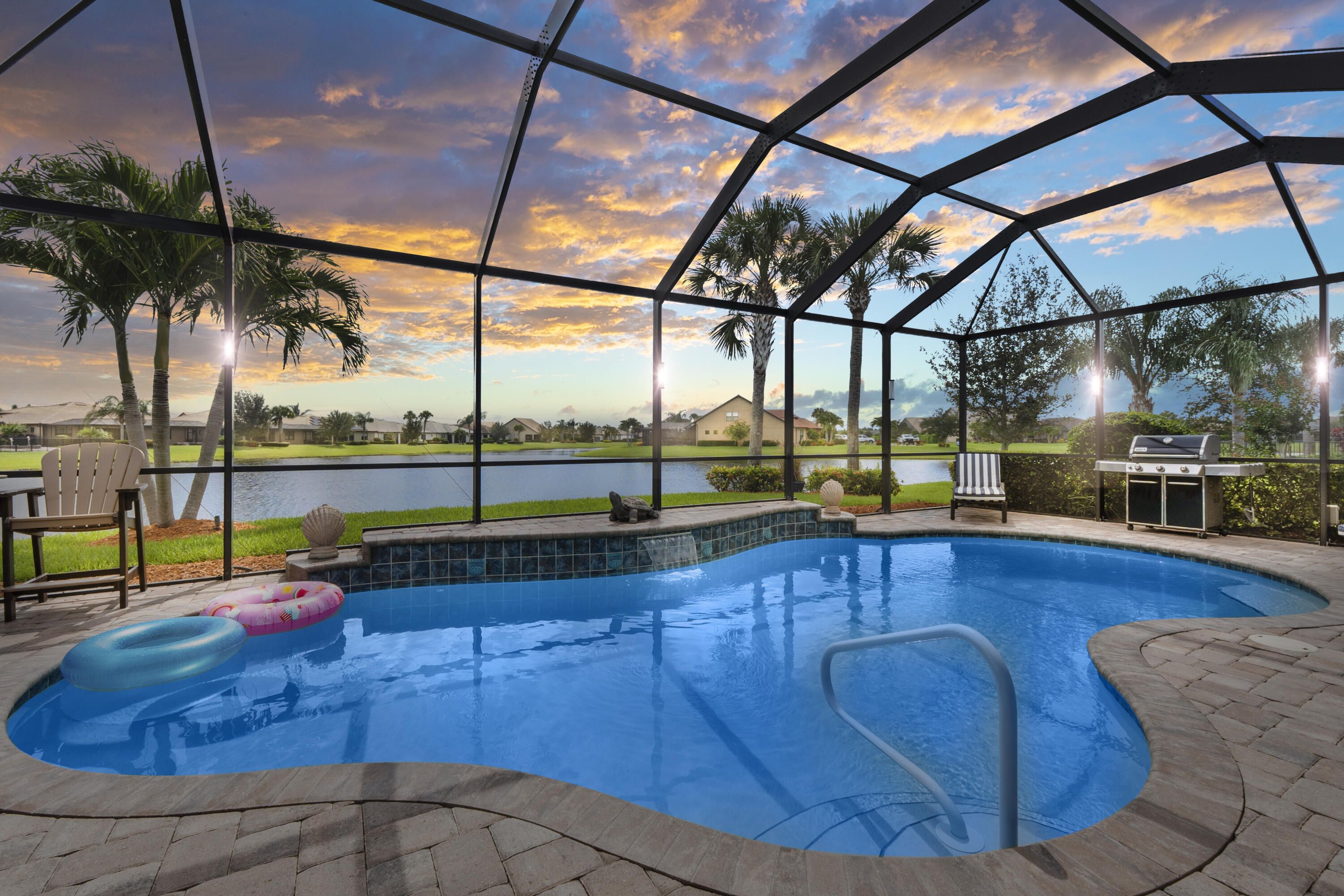 CBS 3Bed + Office 2Bath 2 Car Gar with long lake views. Screened & Gas Heated swimming pool with paver patio. Island Kitchen features 36'' Espresso cabinets, 3CM granite counters, SS appliances, pantry, tile backsplash, gas range, bar area w/beverage cooler, crown molding, pendant lights & title floors. Impact Windows, high ceilings, shiplap accent & built in cabinetry. Built in entertainment center with LED lighting & 60'' TS LED digital fireplace. Master suite features built-in custom closet cabinetry; Main bath has dual sinks & large tiled shower. Patio features retractable electric screen. Clubhouse amenities include Heated resort style pool, Hot Tub, Gym, tennis, playground, kitchen, indoor & outdoor bar, fire pit, BBQ, bocce & dog park. https://youtu.be/Flmo2xovz8g?si=PMVgcJ9RlWfHXgl