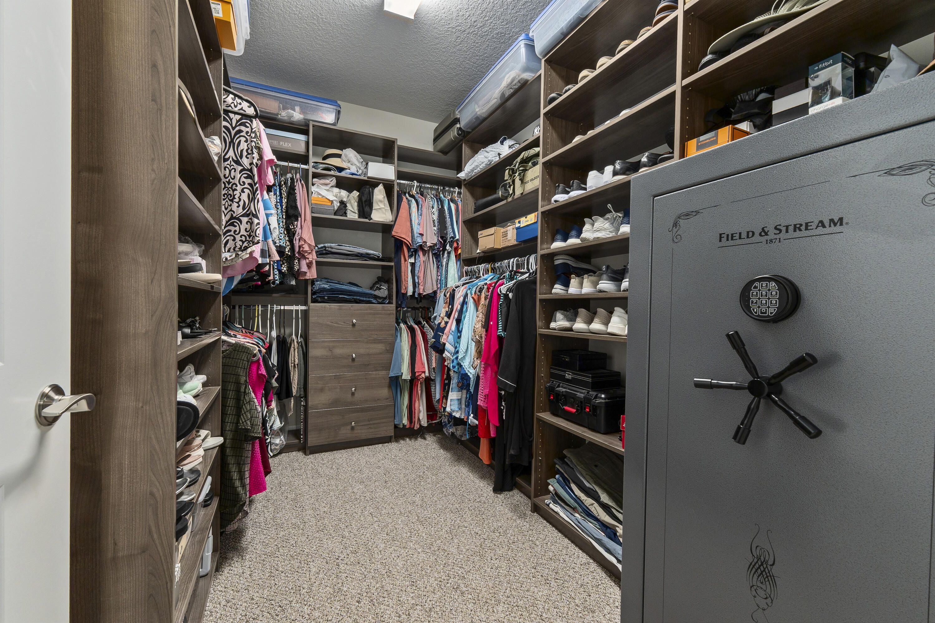 - Bar, Built-in Shelving, Entry Level Living Area, Entrance Foyer, Kitchen Island, Pantry, High Ceilings, Walk-In Closet(s), Attic, Family Room, Great Room, Storage, Separate/Formal Dining Room, Snack Bar, Impact Glass, Single Hung Metal Window(s), Dual Sinks, Primary Downstairs, Separate Shower, Washer/Dryer Hookup