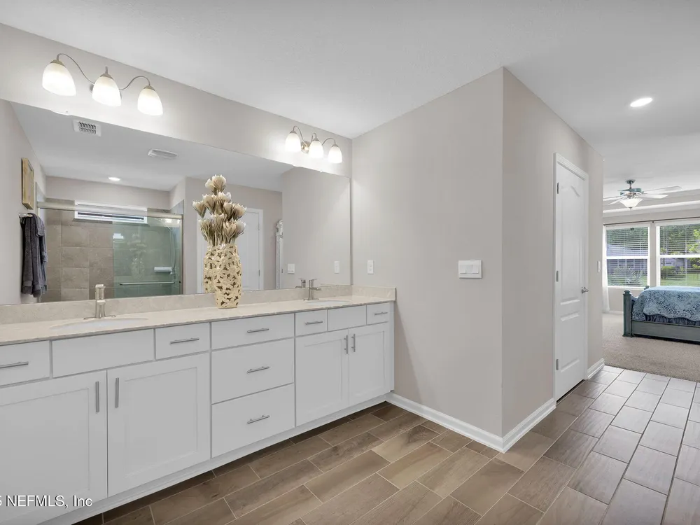 Come and make new friends in one of St Augustine's most desirable and active 55+ community located in the World Golf Village this is Parkland Preserve. Not only do you have the best of St Augustine at your finger tips but with easy access to the highway, the opportunities are endless. This beautifully maintained Elton model that won't disappoint is a 3 bedroom, 3 bathroom with two of those primary suites, both suite bathrooms have walk-in showers and the 3rd has a tub unit. It is well appointed with wood look tile floors through out all common areas and wet areas, carpet in the bedrooms, Stainless steel appliances to include microwave, gas range, refrigerator, and dishwasher, quartz counter tops, white cabinets, deep single basin sink, a laundry room with storage cabinets, the garage floor has been epoxied and houses a deep sink and water softener, and on top of all of that there is a lovely large screened-in lanai that over looks a serene lake. We look forward to seeing you soon.