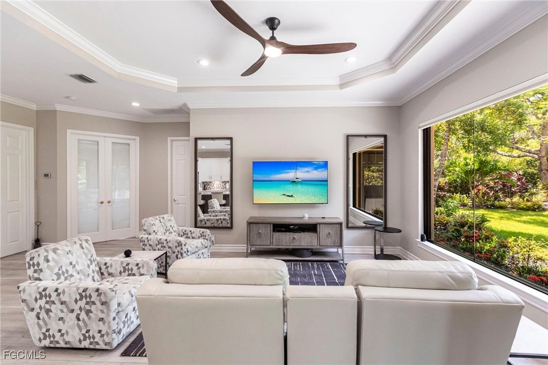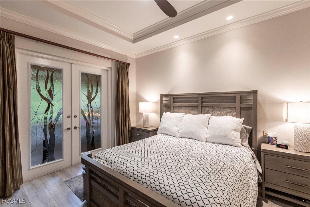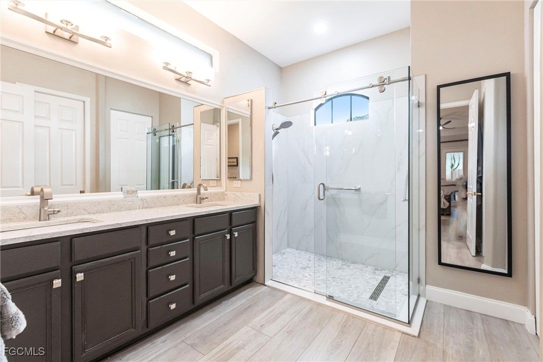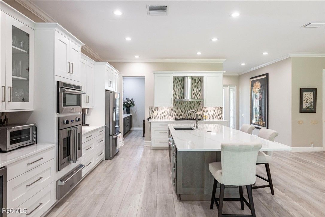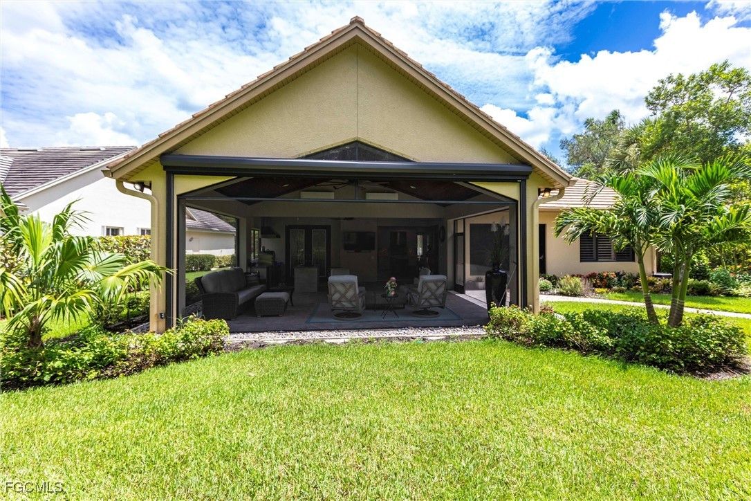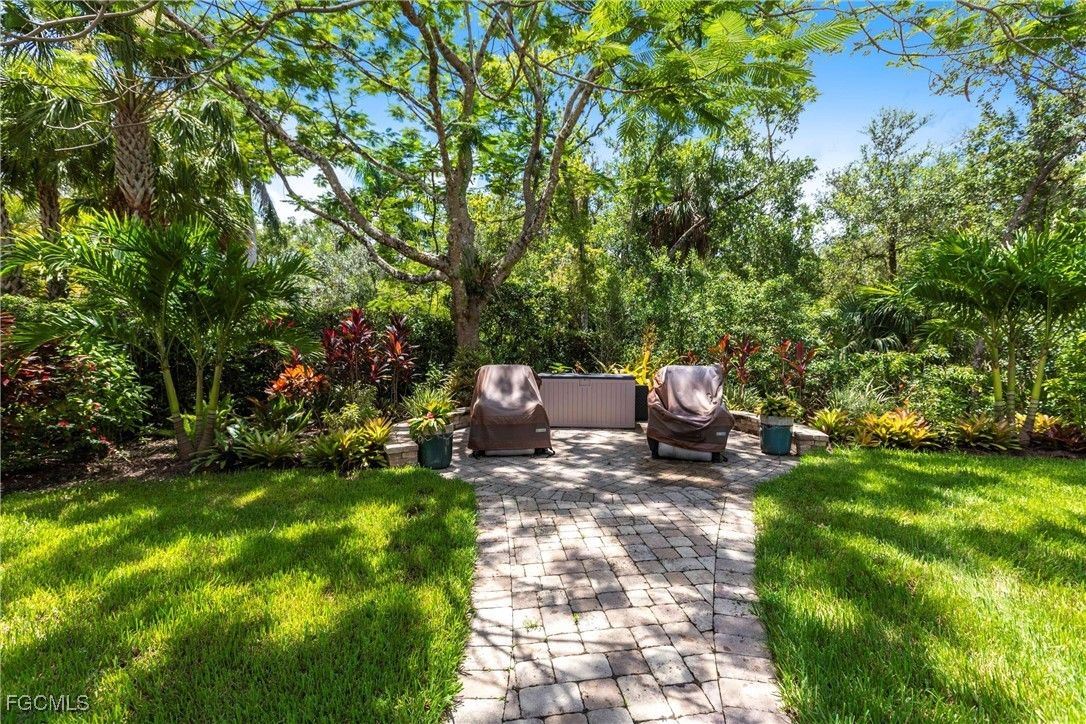 Exquisitely Renovated Home in the Verandah Gated Community. This stunning home has been tastefully renovated to perfection. Some of the features included in the renovated Kitchen are newer countertops, bright kitchen cabinets, newer Viking appliances, elegant backsplash, under cabinet lighting, stainless steel hood vent, double oven and wine cooler. New LVP flooring throughout, crown molding with tray ceilings, updated light and fan fixtures, built in dining room cabinets with luxury backsplash and lighting, plantation shutters and more are upgrades that you will find in the home. Add to this two fully renovated bathrooms, custom closets, built it closets in the Flex Den, laundry tub and cabinets and you have it all. Boasting an abundance of open space, this well-maintained property features a beautiful elevation and a meticulously landscaped yard. The highlight of this home is the expansive covered lanai, measuring 20' x 24', which features a stunning Cedar plank volume ceiling. The lanai also includes a complete outdoor kitchen with a grill and pizza oven, a natural gas fire pit, motorized shutter, built-in flood lighting and a bar. In addition, the southeast corner of the lot boasts a paver-bricked patio that is nearly 16' in diameter, providing a perfect outdoor seating area with a tranquil view of the butterfly garden. This home is equipped with gutters around the entire house, ensuring proper drainage and maintenance. The two car garage has epoxy flooring and plenty of storage area. Don't miss the opportunity to own this truly exceptional property in Verandah. Verandah offers amenities to serve everyone, including 2 championship golf courses designed by Jack Nicklaus and Bob Cupp, a tennis complex, state-of-the-art fitness facilities, a resort style heated community pool, pickleball, bocce, a dog park, kayaks, playground, multiple restaurants and an active social calendar that meets everyone's needs. A must see home so come secure your place in paradise now.
