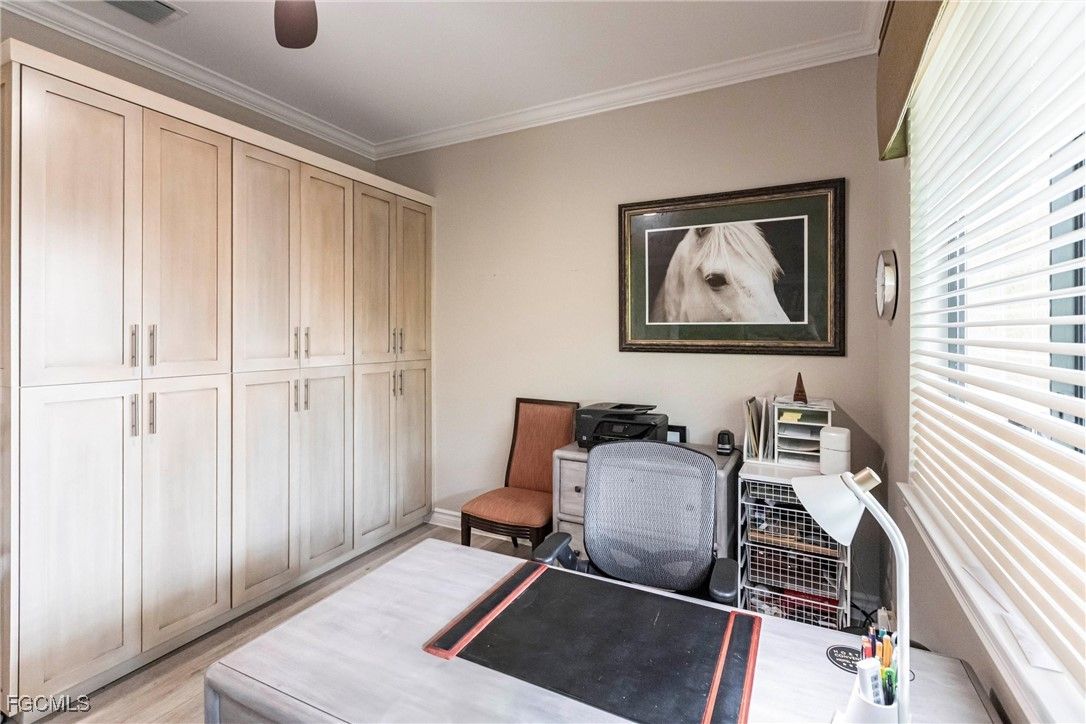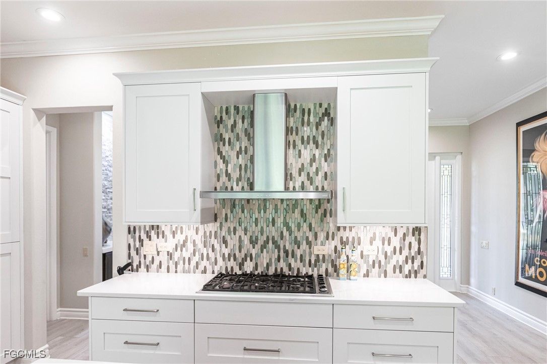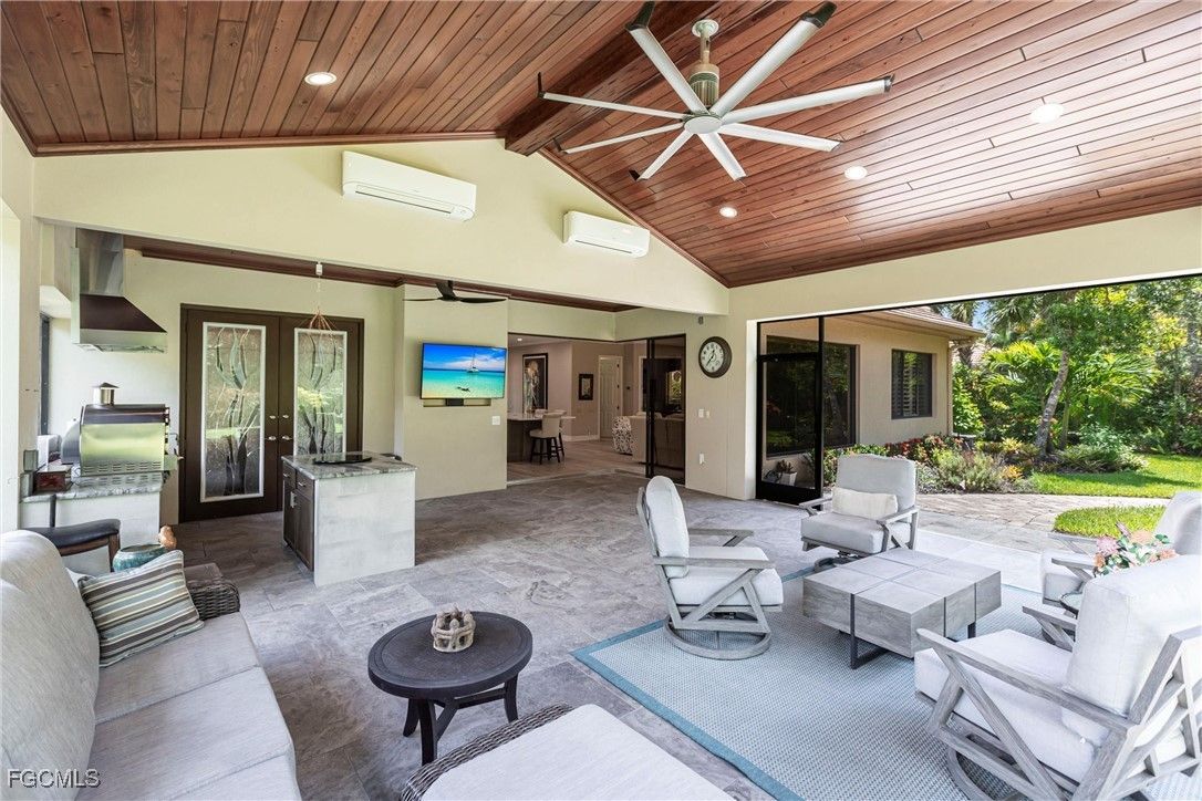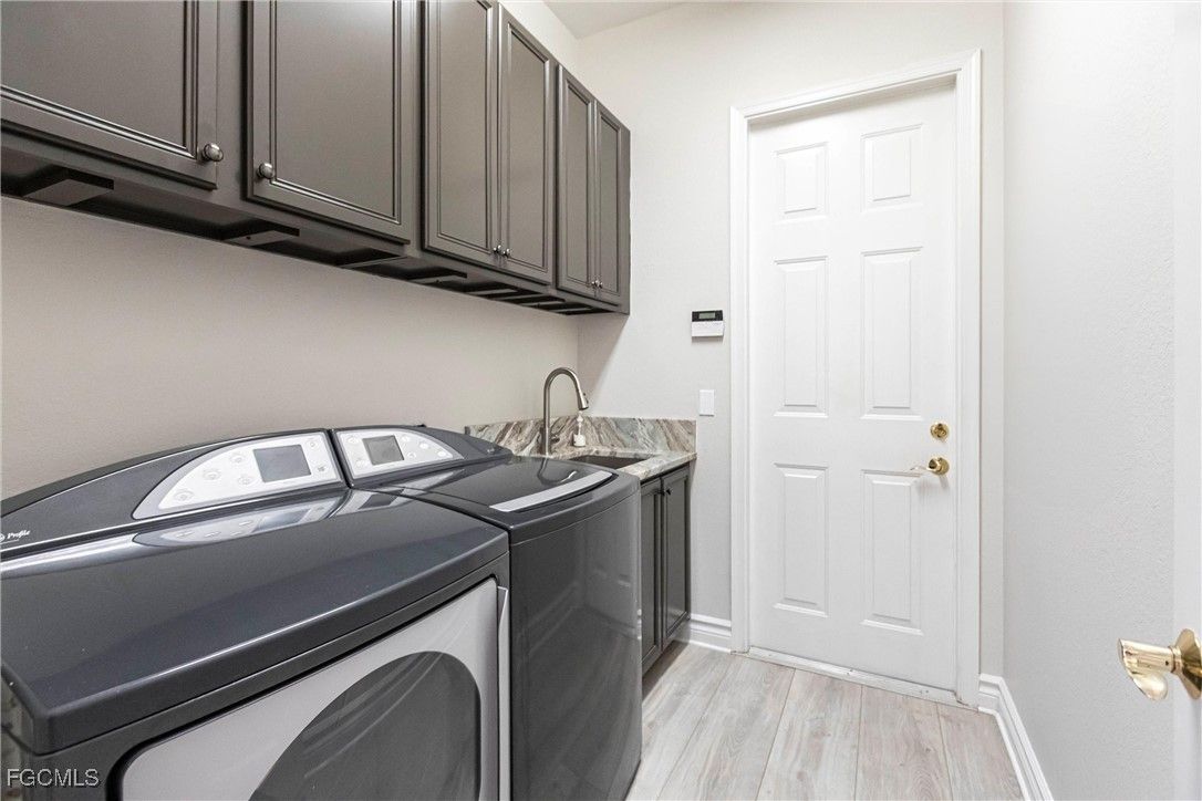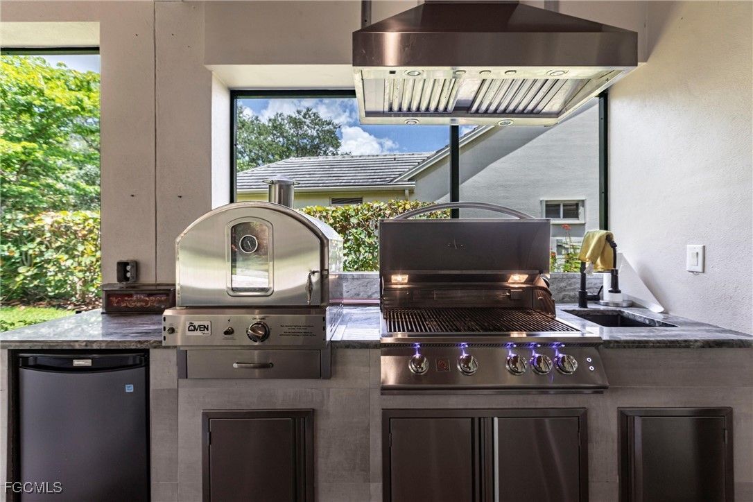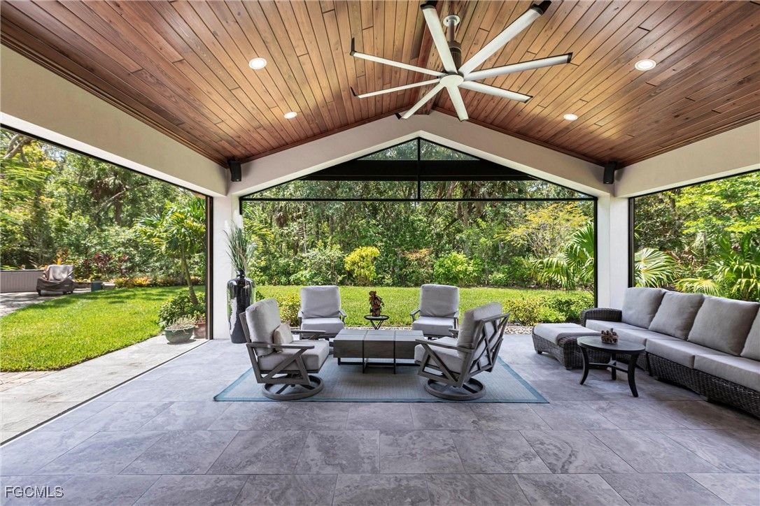 Exquisitely Renovated Home in the Verandah Gated Community. This stunning home has been tastefully renovated to perfection. Some of the features included in the renovated Kitchen are newer countertops, bright kitchen cabinets, newer Viking appliances, elegant backsplash, under cabinet lighting, stainless steel hood vent, double oven and wine cooler. New LVP flooring throughout, crown molding with tray ceilings, updated light and fan fixtures, built in dining room cabinets with luxury backsplash and lighting, plantation shutters and more are upgrades that you will find in the home. Add to this two fully renovated bathrooms, custom closets, built it closets in the Flex Den, laundry tub and cabinets and you have it all. Boasting an abundance of open space, this well-maintained property features a beautiful elevation and a meticulously landscaped yard. The highlight of this home is the expansive covered lanai, measuring 20' x 24', which features a stunning Cedar plank volume ceiling. The lanai also includes a complete outdoor kitchen with a grill and pizza oven, a natural gas fire pit, motorized shutter, built-in flood lighting and a bar. In addition, the southeast corner of the lot boasts a paver-bricked patio that is nearly 16' in diameter, providing a perfect outdoor seating area with a tranquil view of the butterfly garden. This home is equipped with gutters around the entire house, ensuring proper drainage and maintenance. The two car garage has epoxy flooring and plenty of storage area. Don't miss the opportunity to own this truly exceptional property in Verandah. Verandah offers amenities to serve everyone, including 2 championship golf courses designed by Jack Nicklaus and Bob Cupp, a tennis complex, state-of-the-art fitness facilities, a resort style heated community pool, pickleball, bocce, a dog park, kayaks, playground, multiple restaurants and an active social calendar that meets everyone's needs. A must see home so come secure your place in paradise now.