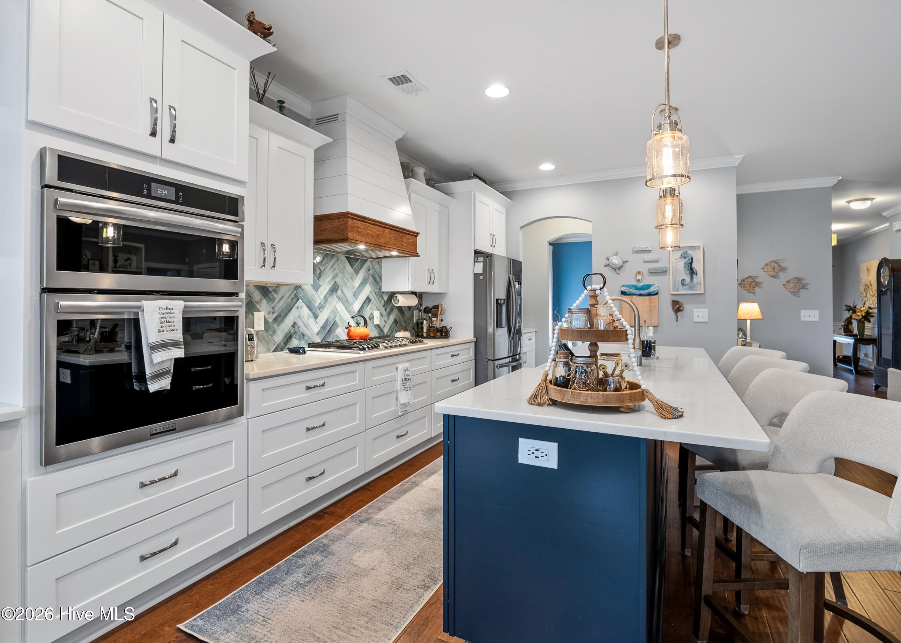 Enjoy the unmatched coastal lifestyle of St. James in this beautifully crafted and maintained 3-bedroom, 3-bath home, ideally located near one of the community's gated entrances and within walking distance to the Seaside Club. Inside, the home offers engineered hardwood floors, a formal dining room with arched doorways, wainscoting, and a convenient butler's pantry. The open concept kitchen/living areas includes a totally renovated gourmet kitchen (2023) with an oversized quartz island, blue glass tile backsplash, gas cooktop, wall oven, microwave, and custom pantry. The living room features built-ins flanking a shiplap fireplace and opens up to a three-season room with EZ Breeze windows overlooking a pond. The main level also includes a guest bedroom, full bath, laundry room, and an oversized primary suite with tray ceiling and sitting room/office/flex space. Upstairs offers an additional bedroom suite, large bonus/game room, and ample attic storage. Additional features include a 2-car garage with epoxy floors and fenced backyard. The Seaside club features a zero-entry pool, wet and lounge decks, splash pad, tennis and pickleball courts, fitness center, seasonal bar and grill, sand volleyball, and more. HOA fees cover lawn maintenance for care-free living. St. James residents also enjoy four championship golf courses, a marina, private beach club on Oak Island, parks, trails, dining, social clubs, and more! Conveniently located to downtown Southport area restaurants and shopping. Book your showing today! See agent remarks regarding possession.