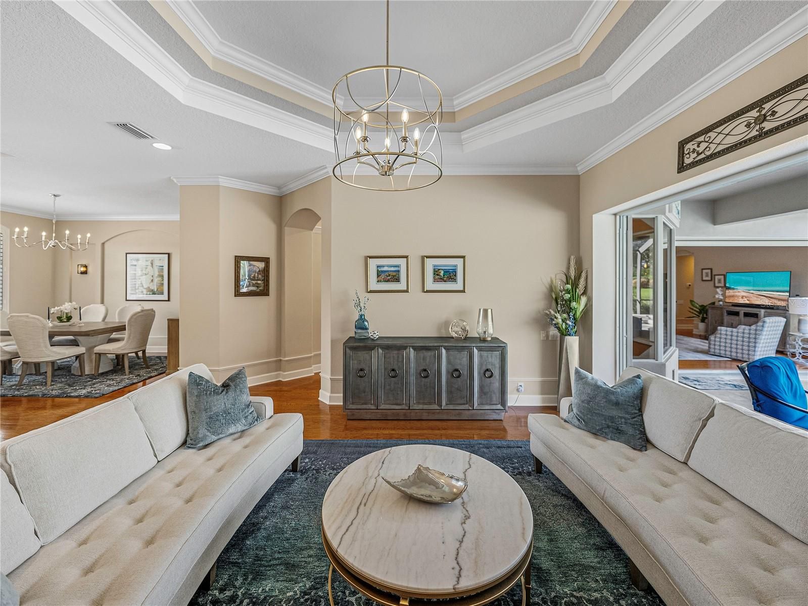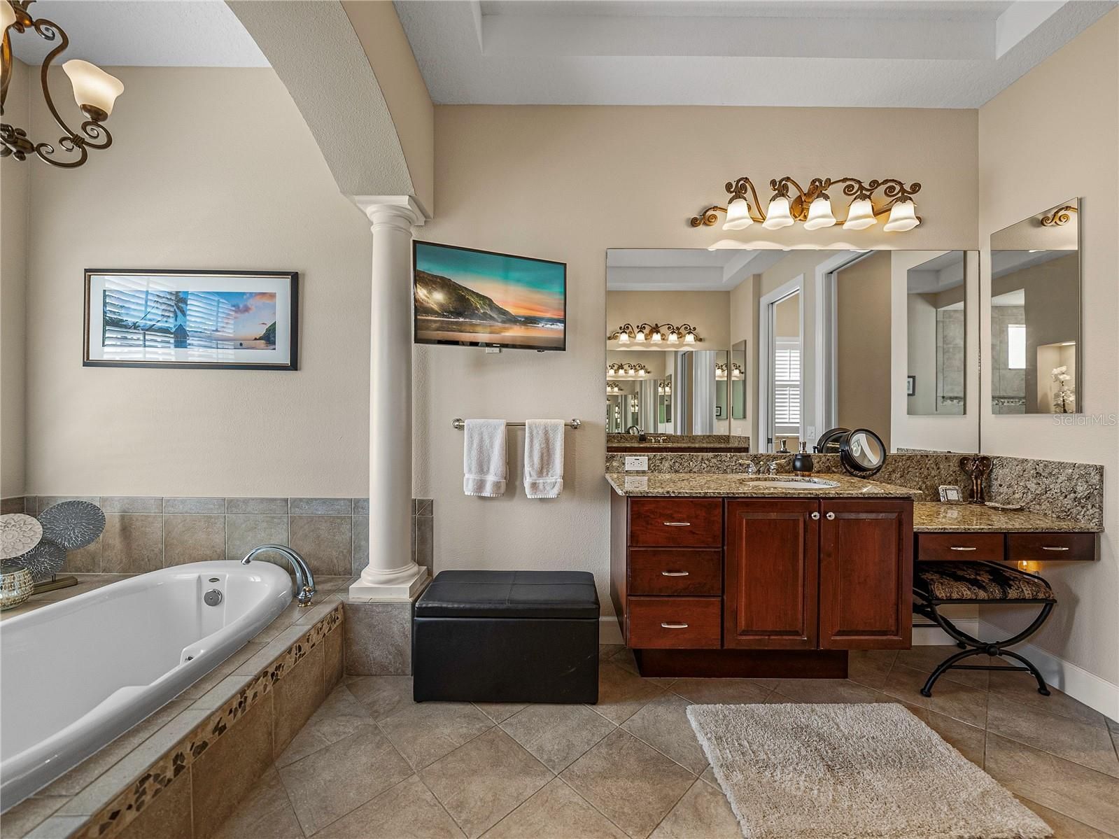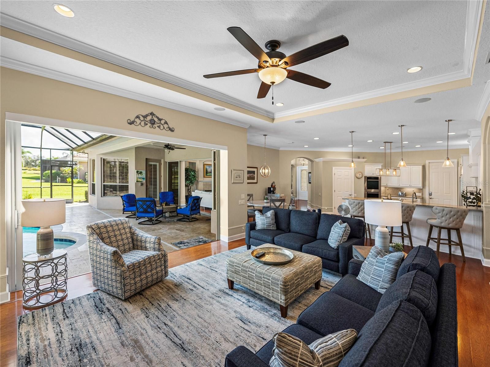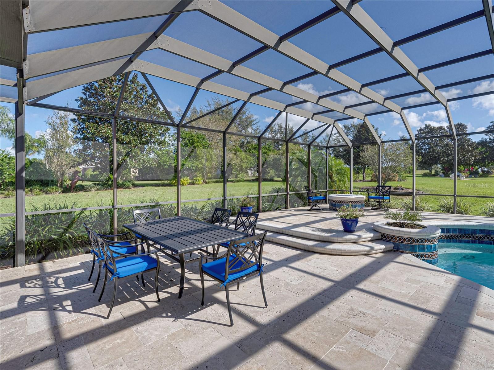 Extraordinary luxury home, located in the exclusive, gated community of Lake Jovita Golf and Country Club. This stunning home is situated among the tranquil rolling hills, on an expansive and beautifully landscaped ¾ acre lot. Special exterior features include a large and welcoming covered front porch, a circular paver driveway and sidewalks, plus a large private back yard. Discerning buyers will appreciate the quality construction, upgrades and finishes throughout this well-appointed home. The split bedroom floor plan includes all the spaces desired for today’s lifestyle, beginning with the office and adjacent half-bathroom, formal dining and living room with gas fireplace, and a fabulous open kitchen and family room combo. The guest wing of the home includes 3 guest bedrooms, 2 guest bathrooms and a bonus room with a new built-in wine bar, electric wall fireplace and access to the lanai. The highly updated kitchen is loaded with beautiful, refinished cabinetry and plenty of quartz countertop workspace, including a center island and bar, with seating for 4, a breakfast nook and a large walk-in pantry. Professional-grade appliances include a Sub-Zero refrigerator, Wolf 5-burner gas cooktop, exhaust hood, and a pot-filler. New Wolf double ovens, microwave and Bosch dishwasher installed in 2022. Large panoramic sliding glass doors in the living room, family room and bonus room provide abundant natural light and open to the massive lanai oasis with 2 covered areas, new travertine tile decking, an over-sized pool and spa with Pentair pool lighting, a fire pit and outdoor kitchen. The spacious primary bedroom includes a seating area, and two large walk-in closets with custom California Closet built-ins, plus a splendid ensuite bathroom, with large double vanities, a roomy walk-in shower, soaking tub and private water closet. New systems and numerous upgrades, have been completed during the past 5 years, including: a whole house Generac 22kw generator, whole house water purification system, Trane air conditioner and thermostats, Permakote Roof coating with 15 year warranty, new water heater, smoke and carbon monoxide detectors, digital door locks, new irrigation well tank with irrigation switch, gorgeous landscape lighting, plus new interior paint, shutters and hardwood flooring throughout the home, with tile flooring in the bathrooms and laundry room. Also, new frameless shower doors in all baths, remote control shades on the sliding glass doors in the family and bonus room, plus updated interior light fixtures. The oversized 3-car garage has New Age stone composite tile flooring and plenty of room for storage in the garage AND the attic. Lake Jovita is a warm and welcoming, gated, resort community with 2 championship golf courses, tennis courts, fitness center, community pool, basketball and pickleball courts, a beautiful park with paved walking path, a playground and separate dog parks for small and larger dogs. We are conveniently located near excellent shopping, restaurants, medical & educational facilities, and unlimited entertainment options. Located only 6 miles from I-75, with easy access to other major highways and two international airports. Don’t miss your opportunity to own this special home and enjoy all that Lake Jovita and the Greater Tampa & Orlando Region have to offer.