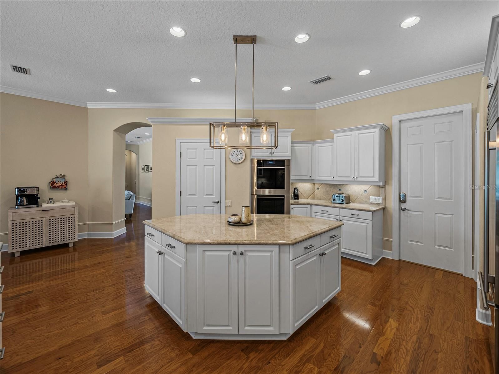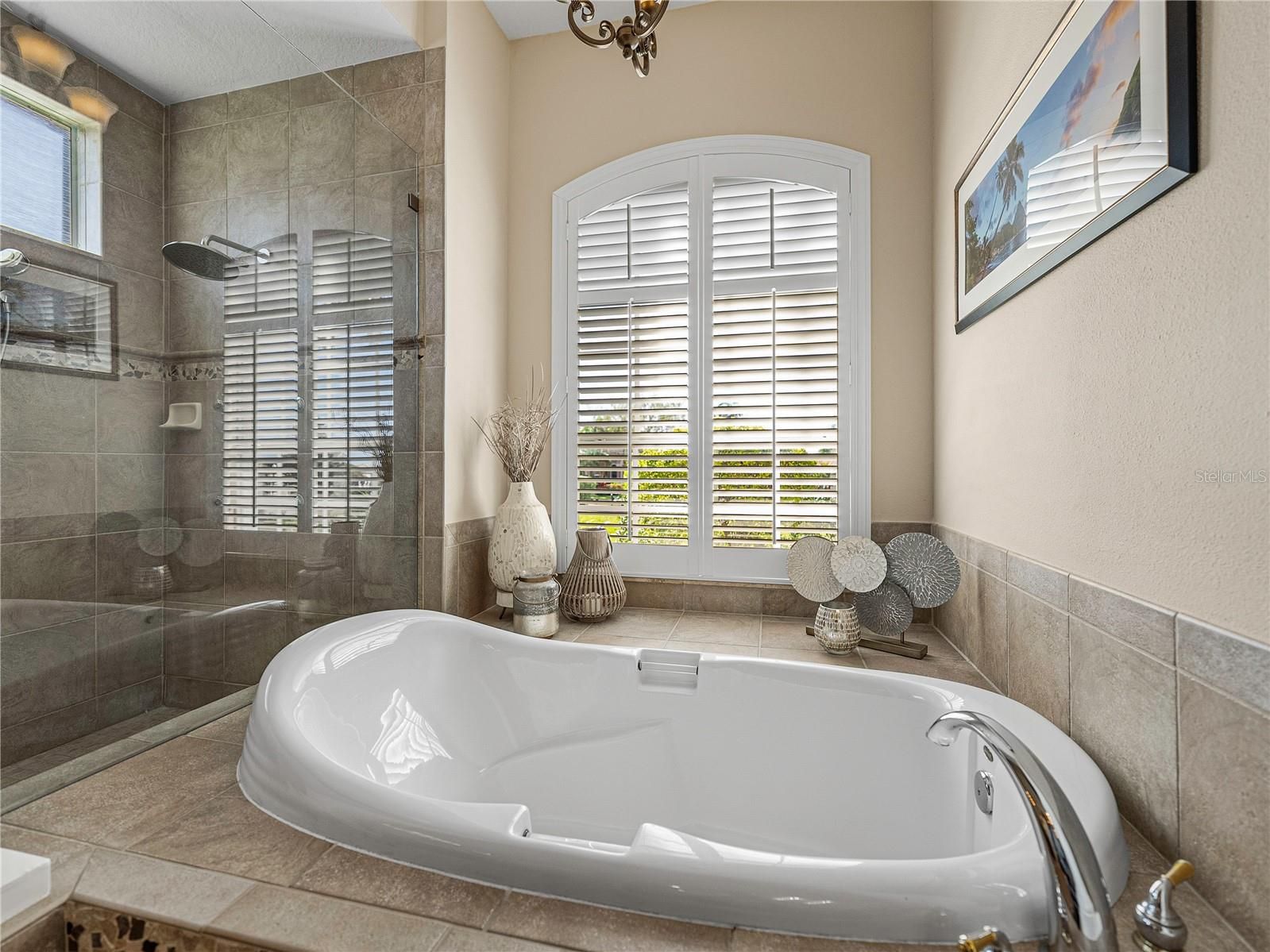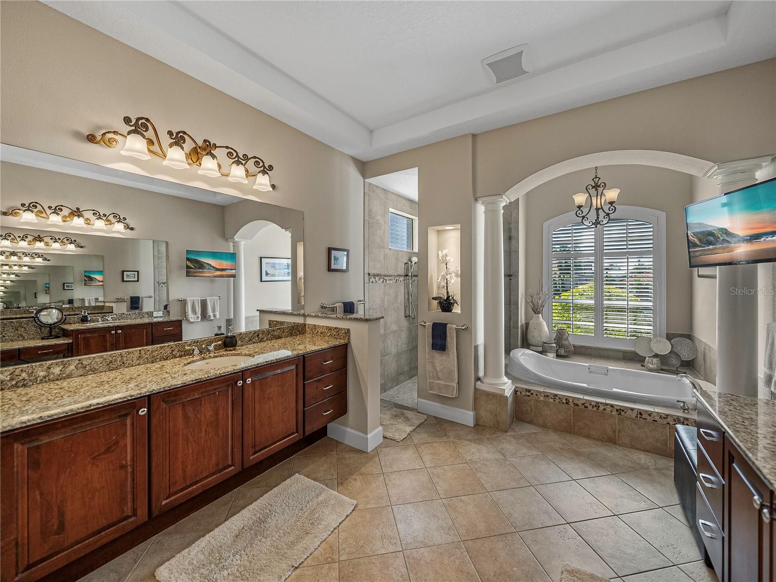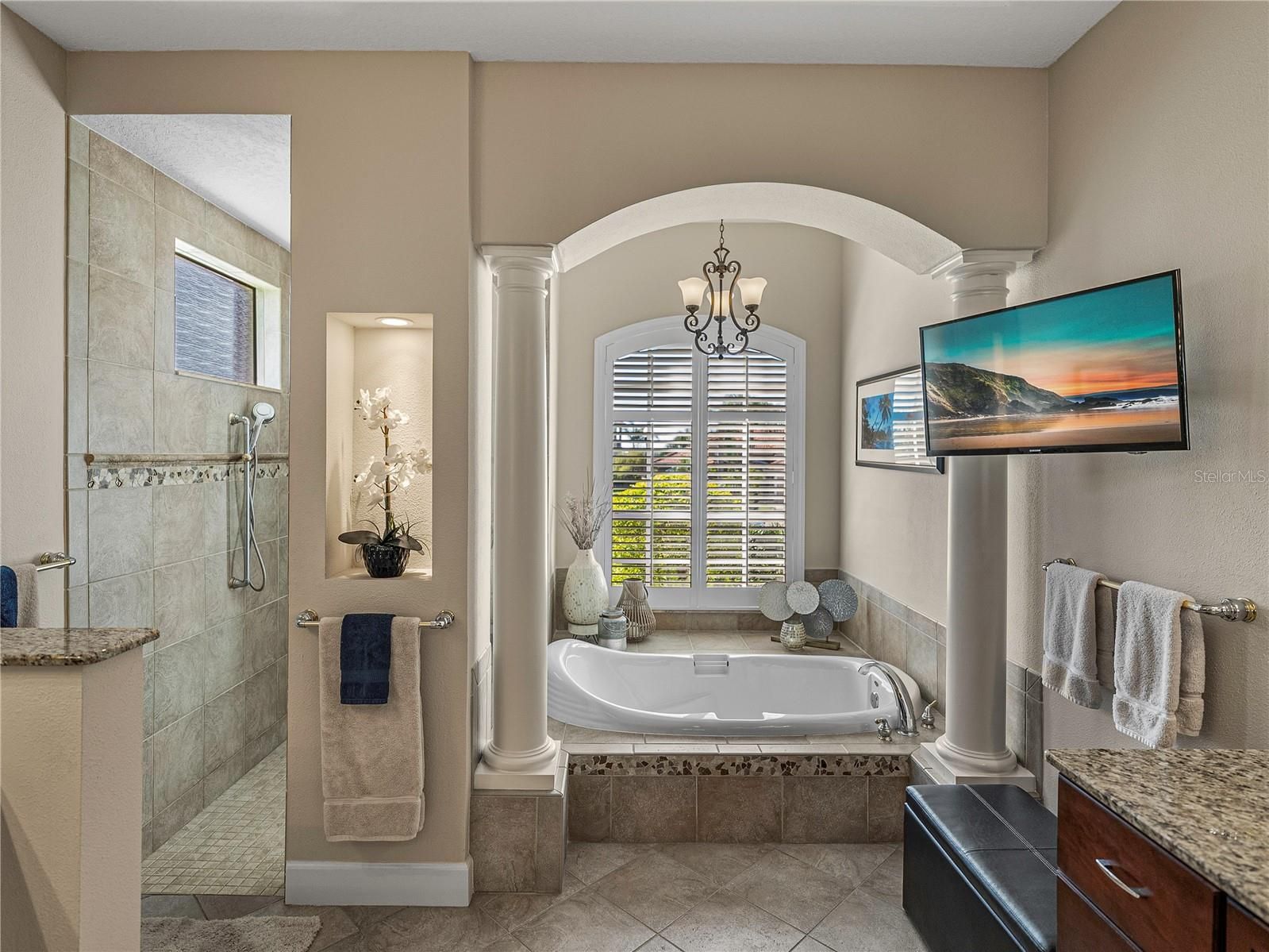- Built-in Features, Ceiling Fan(s), Central Vacuum, Crown Molding, Eat-in Kitchen, High Ceilings, Kitchen/Family Room Combo, Living/Dining Room, Main Level Primary, Split Bedrooms, Stone Counters, Thermostat, Walk-In Closet(s), Window Treatments