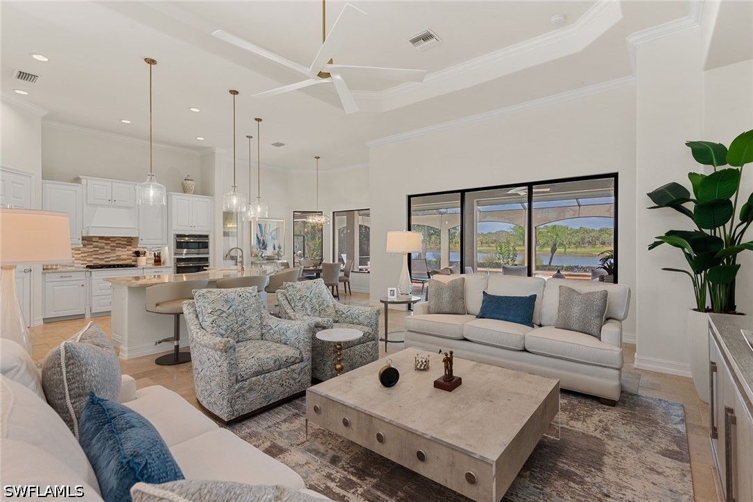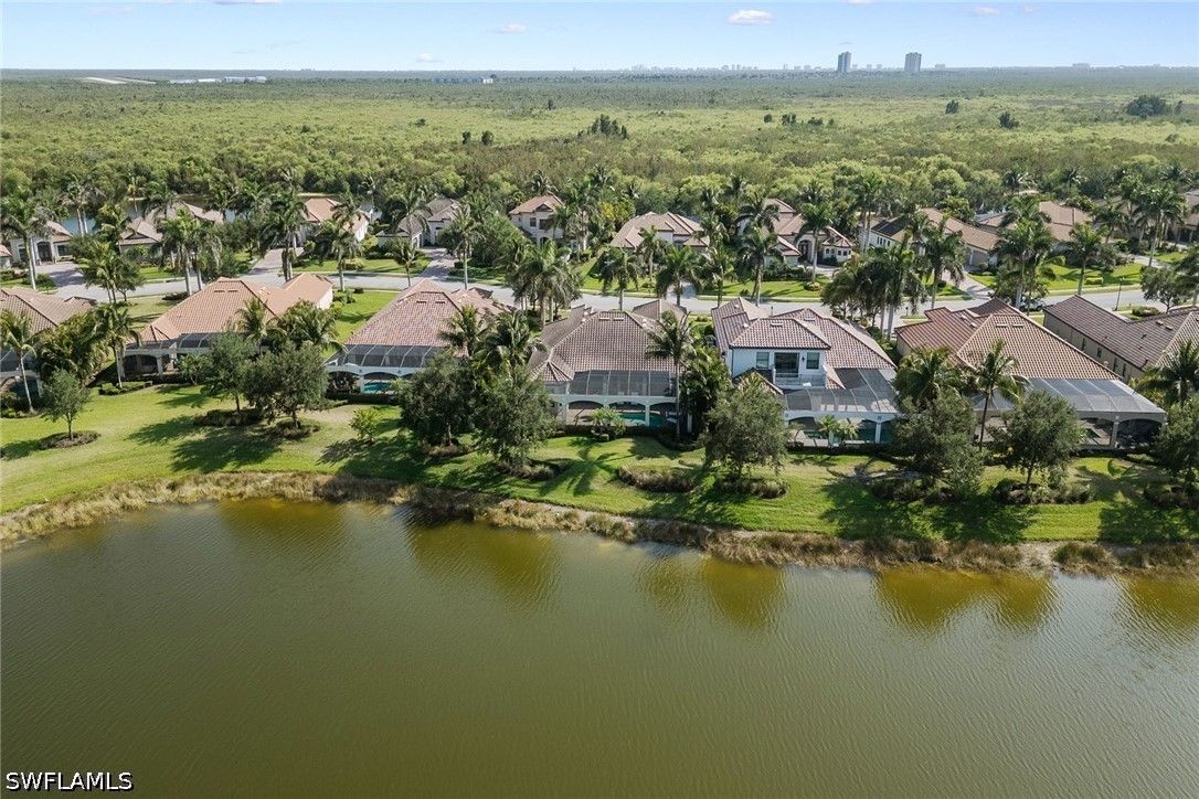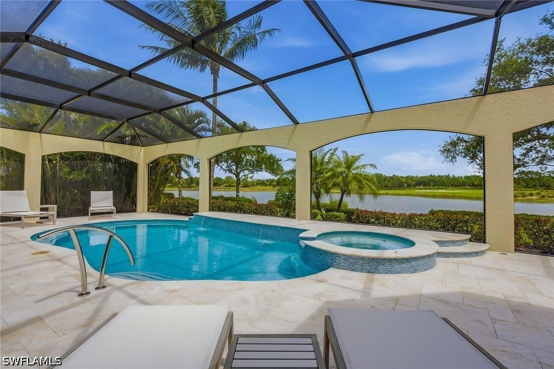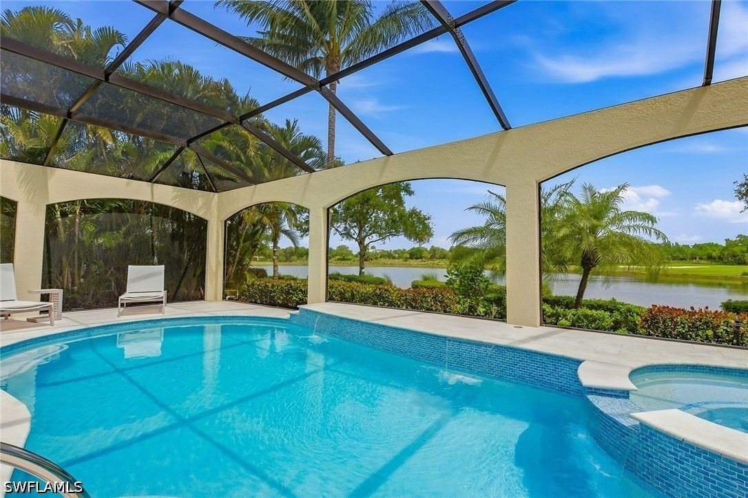 Beautiful renovations! Enjoy sweeping golf course and water views of the spectacular Creek Course from this exquisitely updated residence in the desired Runaway Bay village of Fiddler’s Creek, where a picturesque winding street, long private driveways, and homes gracefully set back from the road create an immediate sense of refined elegance. Showcasing the popular Bougainvillea open floor plan, this beautifully reimagined home offers three bedrooms plus a den, or four bedrooms, three full baths, a three-car garage and an exceptional blend of modern sophistication and effortless comfort. Highlights include extensive recent renovations throughout including new lighting, new fixtures, featuring a stunning kitchen with new Taj Mahal quartzite countertops, stainless appliances, natural gas cooking, a wall oven, pantry and an expansive island, along with impact-resistant glass, plantation shutters, electric storm screens on the lanai, a 32-kilowatt whole-house generator, and two new air-conditioning systems installed in 2023 for optimal comfort and peace of mind. From moment you enter, the home reveals a light-filled, airy ambiance, enhanced by expansive windows and glass doors that frame serene golf and lake views and invite abundant natural light throughout. The open-concept great room flows seamlessly into the kitchen, dining area and lanai, creating an ideal setting for everyday living and elegant entertaining. The thoughtfully modernized interior is defined by refined architectural elements, including crown molding, tray and coffered ceilings, recessed lighting and designer fixtures, all contributing to an elevated aesthetic. The private primary suite serves as a serene retreat with picturesque views, custom walk-in closets, and an en-suite bath featuring dual vanities, a soaking tub and a walk-in shower. Two guest suites are thoughtfully positioned for privacy, each with its en-suite bath, while the versatile den offers flexibility as a home office or additional guest space. Outdoor living is a highlight, featuring an expansive screened lanai with wood ceiling, multiple covered and uncovered seating areas, a gas-heated pool and spa with a new tile and a waterfall feature, a new beautifully refurbished pool deck finished in elegant Diana Royale leathered marble, and a fully equipped outdoor kitchen with a stone accent wall, refrigerator and sink for effortless alfresco dining. Ideally near the front gate, the home also enjoys convenient access to the club and spa and amenities. Your lifestyle is further elevated with miles of scenic, tree-lined sidewalks ideal for recreation, running and cycling, with exceptional amenities including a resort-style pool, the updated Gator Grille for casual dining, Caxambas for fine dining, active tennis and pickleball, fitness with trainers, spa services and a vibrant social calendar, with optional memberships available for the championship golf course, new golf clubhouse, marina and private beach club.