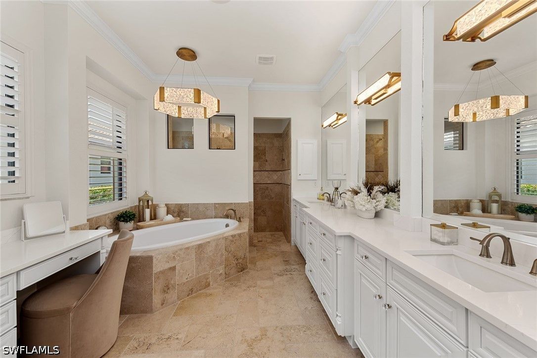 - Breakfast Bar, Built-in Features, Bedroom on Main Level, Breakfast Area, Bathtub, Tray Ceiling(s), Coffered Ceiling(s), Separate/Formal Dining Room, Dual Sinks, Entrance Foyer, Eat-in Kitchen, French Door(s)/Atrium Door(s), High Ceilings, Custom Mirrors, Main Level Primary, Pantry, Separate Shower, Cable TV, Walk-In Closet(s), High Speed Internet, Split Bedrooms
