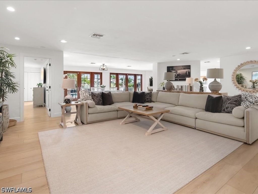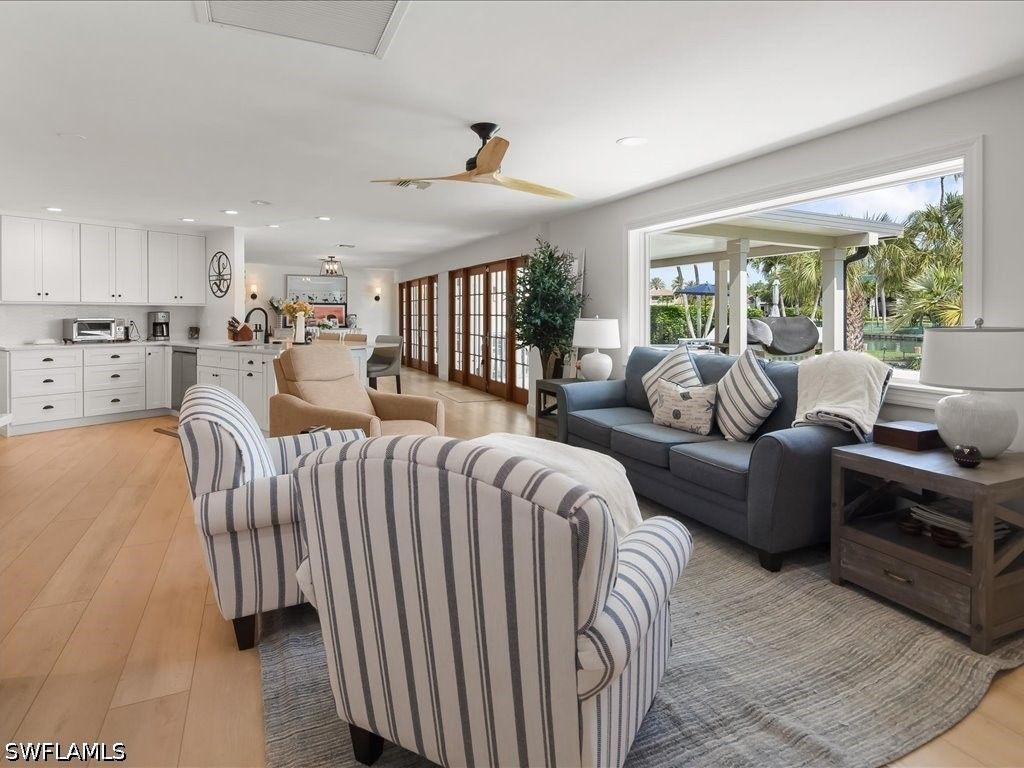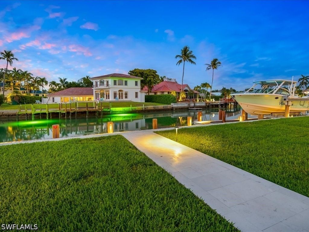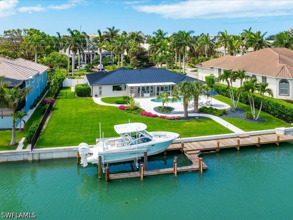 In the coveted “Nifty Fifty” enclave of The Moorings—an intimate stretch of just fifty waterfront homesites where ownership is often held for generations—this fully reimagined coastal residence captures the essence of Naples yachting life with direct, no-bridge Gulf access through Doctors Pass. From the moment you enter, wide-plank wood flooring introduces a sense of understated refinement, guiding you into interiors designed for both relaxed living and effortless entertaining. The kitchen serves as the home’s centerpiece, thoughtfully appointed with quartz surfaces, a gas cooktop beneath a custom-crafted hood, wall oven, microwave, wine refrigeration, and dual sinks. Generous island and bar seating create a natural gathering space, flowing seamlessly into the family room where an expansive picture window frames tranquil canal views and passing vessels en route to open water. A formal dining room set behind French doors offers an elegant setting enhanced by natural light and coastal breezes, while a separate living room provides a more intimate retreat. Privately positioned, the primary suite opens directly to the pool terrace and features a fully renovated bath with a spacious walk-in shower and dual-sink vanity. Custom closet systems throughout the home reflect a commitment to both design and organization. Outdoors, a refinished pool overlooks shimmering waterways, complemented by a private dock and a new twenty-thousand-pound lift—tailored for effortless boating access. Recent enhancements, including a new roof, HVAC system, water heater, seawall and dock, as well as a climate-controlled garage with epoxy flooring, ensure a truly turnkey experience. Positioned just moments from the Gulf and minutes to the refined dining and shopping of 5th Avenue South, 337 Mooring Line Drive represents a rare opportunity to secure a waterfront lifestyle defined by access, exclusivity, and enduring coastal elegance.
