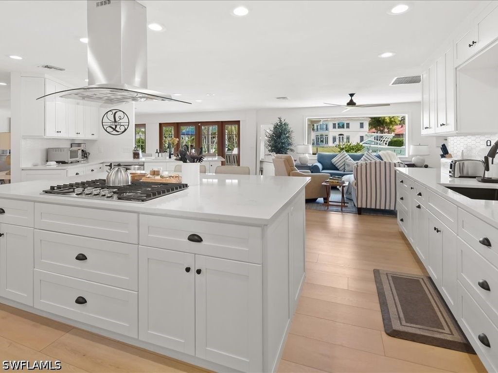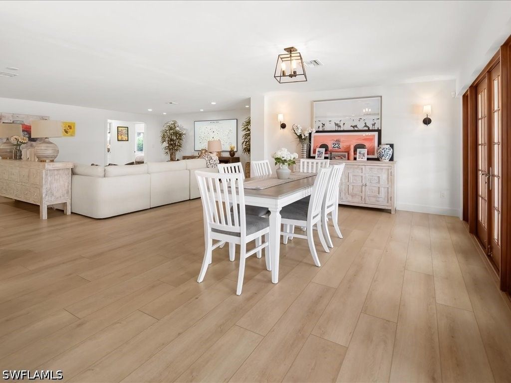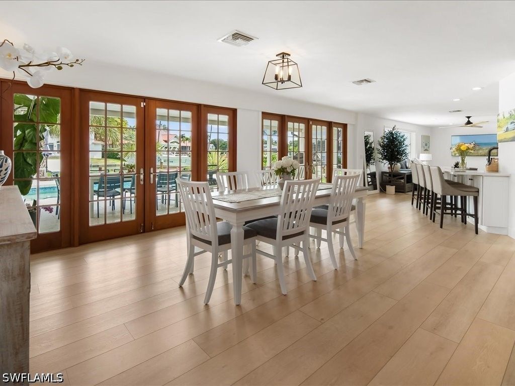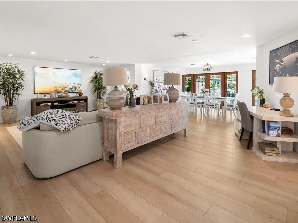 In the coveted “Nifty Fifty” enclave of The Moorings—an intimate stretch of just fifty waterfront homesites where ownership is often held for generations—this fully reimagined coastal residence captures the essence of Naples yachting life with direct, no-bridge Gulf access through Doctors Pass. From the moment you enter, wide-plank wood flooring introduces a sense of understated refinement, guiding you into interiors designed for both relaxed living and effortless entertaining. The kitchen serves as the home’s centerpiece, thoughtfully appointed with quartz surfaces, a gas cooktop beneath a custom-crafted hood, wall oven, microwave, wine refrigeration, and dual sinks. Generous island and bar seating create a natural gathering space, flowing seamlessly into the family room where an expansive picture window frames tranquil canal views and passing vessels en route to open water. A formal dining room set behind French doors offers an elegant setting enhanced by natural light and coastal breezes, while a separate living room provides a more intimate retreat. Privately positioned, the primary suite opens directly to the pool terrace and features a fully renovated bath with a spacious walk-in shower and dual-sink vanity. Custom closet systems throughout the home reflect a commitment to both design and organization. Outdoors, a refinished pool overlooks shimmering waterways, complemented by a private dock and a new twenty-thousand-pound lift—tailored for effortless boating access. Recent enhancements, including a new roof, HVAC system, water heater, seawall and dock, as well as a climate-controlled garage with epoxy flooring, ensure a truly turnkey experience. Positioned just moments from the Gulf and minutes to the refined dining and shopping of 5th Avenue South, 337 Mooring Line Drive represents a rare opportunity to secure a waterfront lifestyle defined by access, exclusivity, and enduring coastal elegance.