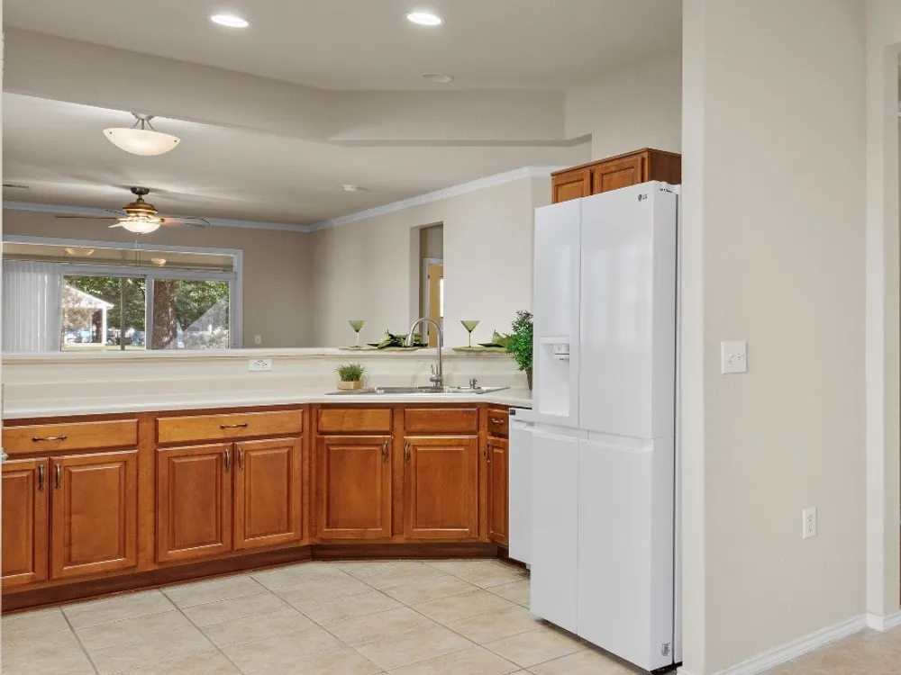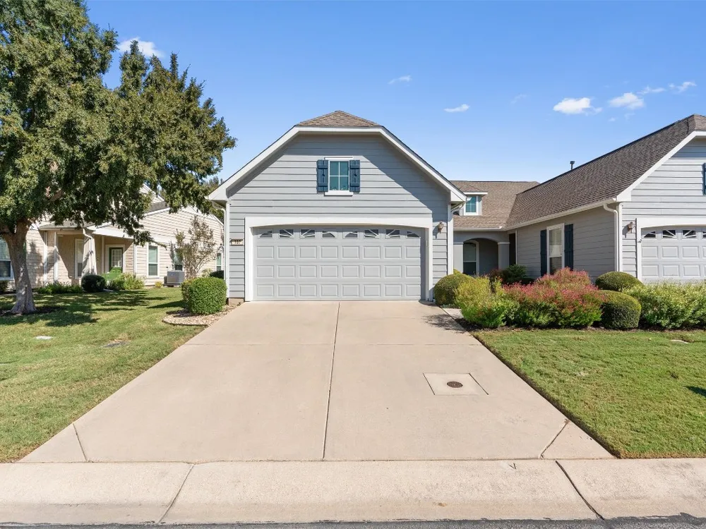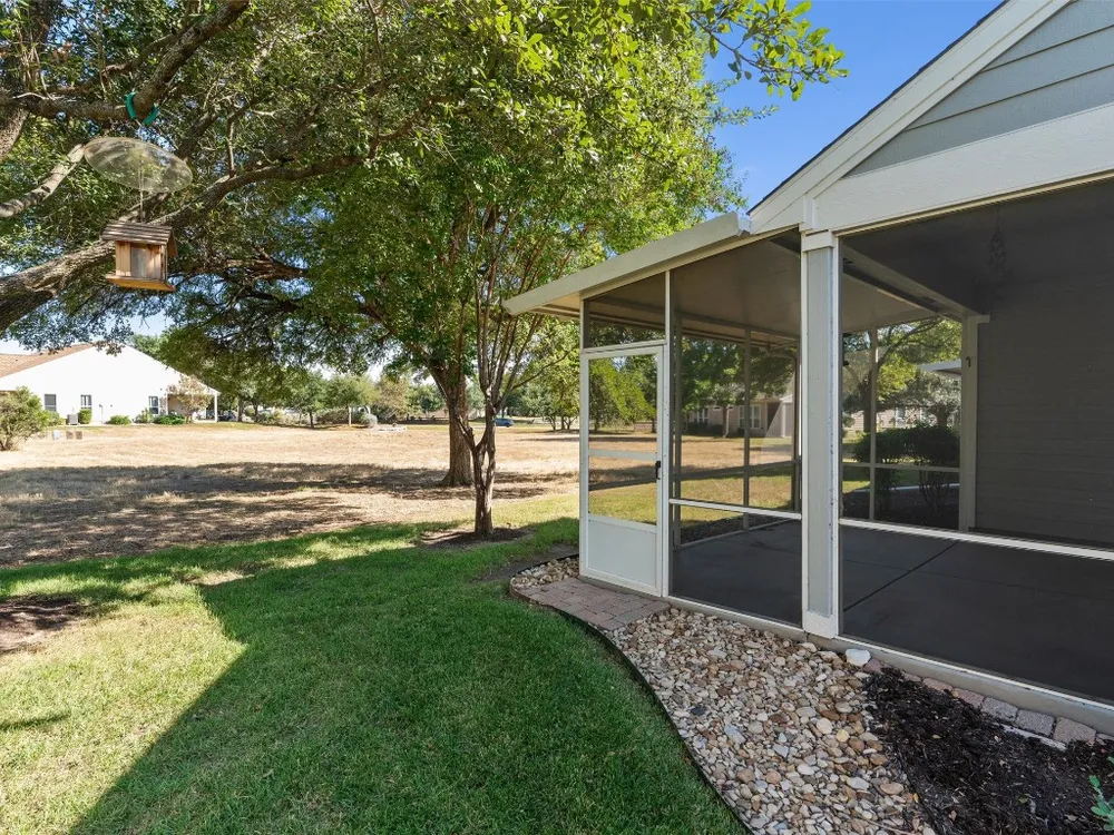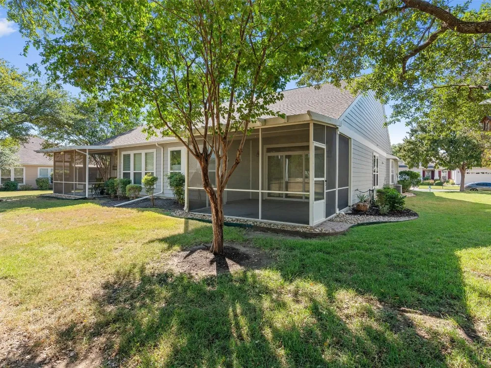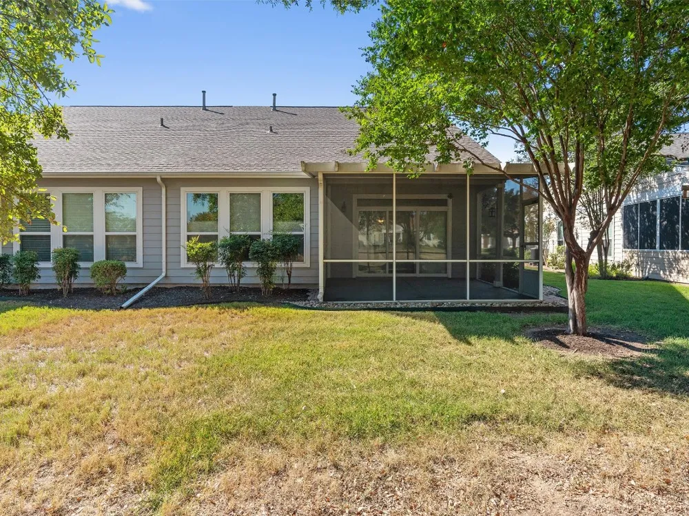 A jumbo Screened Porch overlooks a greenbelt dotted with native trees at this choice Sun City Texas Monterey Cottage (one/half duplex) near myriad activities of the Village Center. After greetings from a separated Front Sitting Porch, a nine-light door welcomes you inside. Here a boxed-window Breakfast Room also makes a cheerful Study area, while the adjacent Open Kitchen touts classic white upgraded appliances including gas cooking in this heart-of-the-home designed with a perfect work triangle. A Breakfast Bar gently separates the Kitchen from the Dining portion of the spacious Great Room, where twin windows overlook the wide and landscaped side yard and crown molding rims the nine-foot ceilings. Easy-care luxury vinyl plank floors blanket the Great Room viewing the roomy Screened Porch and the adjacent greenbelt. Those same floors continue into the separated Primary Bedroom, where a trio of dressed windows in this king-sized room view the awaiting greenbelt and a breezy fan provides added comfort. Meanwhile, the en suite Primary Bath hosts a roomy shower, dual vanities and a generous Walk-In Closet. At the front of the home the separated Guest Bedroom views the beforementioned Front Sitting Porch and the nearby full Guest Bath includes a Linen Closet. Off the boxed-windowed Breakfast Room the Laundry is complete with washer & dryer, while a high transom window grants natural lighting to the space. More well-placed windows illuminate the Two-Car Garage. Lock & leave the yard work for others, as this home is located in a maintained lawn neighborhood, where the stated annual dues include year-around lawn care. With its thoughtful upgrades and superior location, this is a home to add to your short list.