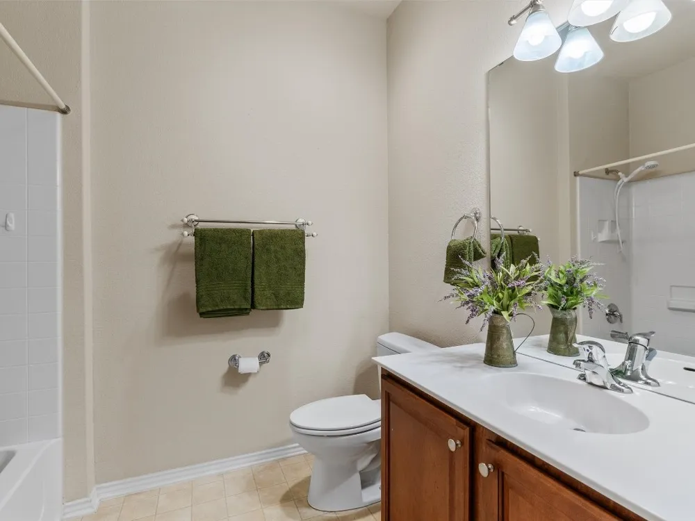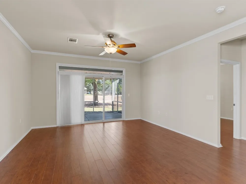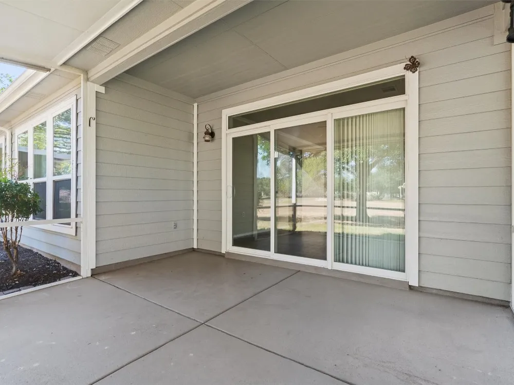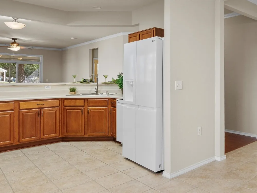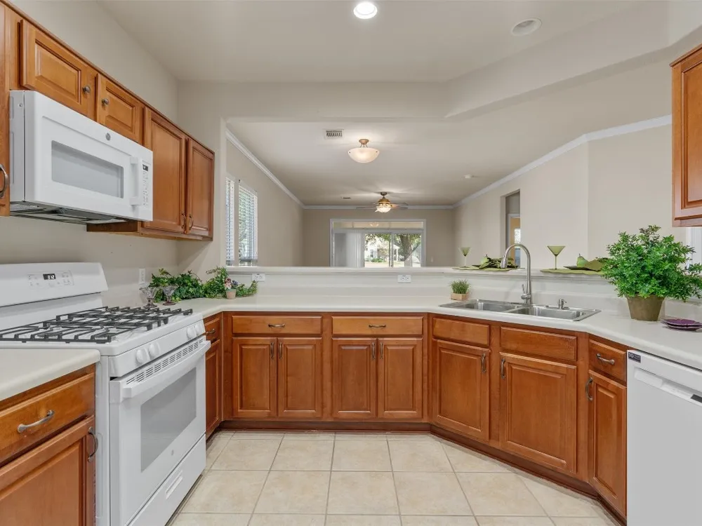 A jumbo Screened Porch overlooks a greenbelt dotted with native trees at this choice Sun City Texas Monterey Cottage (one/half duplex) near myriad activities of the Village Center. After greetings from a separated Front Sitting Porch, a nine-light door welcomes you inside. Here a boxed-window Breakfast Room also makes a cheerful Study area, while the adjacent Open Kitchen touts classic white upgraded appliances including gas cooking in this heart-of-the-home designed with a perfect work triangle. A Breakfast Bar gently separates the Kitchen from the Dining portion of the spacious Great Room, where twin windows overlook the wide and landscaped side yard and crown molding rims the nine-foot ceilings. Easy-care luxury vinyl plank floors blanket the Great Room viewing the roomy Screened Porch and the adjacent greenbelt. Those same floors continue into the separated Primary Bedroom, where a trio of dressed windows in this king-sized room view the awaiting greenbelt and a breezy fan provides added comfort. Meanwhile, the en suite Primary Bath hosts a roomy shower, dual vanities and a generous Walk-In Closet. At the front of the home the separated Guest Bedroom views the beforementioned Front Sitting Porch and the nearby full Guest Bath includes a Linen Closet. Off the boxed-windowed Breakfast Room the Laundry is complete with washer & dryer, while a high transom window grants natural lighting to the space. More well-placed windows illuminate the Two-Car Garage. Lock & leave the yard work for others, as this home is located in a maintained lawn neighborhood, where the stated annual dues include year-around lawn care. With its thoughtful upgrades and superior location, this is a home to add to your short list.