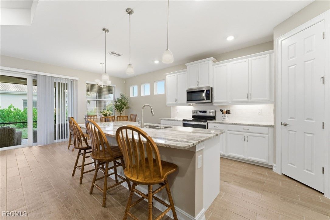 STUNNING 3 Bedroom + Den, 2.5 bath home with an OVERSIZED 3-car TANDEM GARAGE, offering Water Views and the appeal of a nearly new 2023 residence. Offering approximately 2,221 sq ft of well-designed living space, this home is situated on an Oversized Corner Lot and features an open-concept layout that creates seamless flow between the kitchen, dining, and great room—ideal for both everyday living and entertaining. Sophisticated TILE flooring flows throughout the home and is complemented by a fresh interior paint update and tray ceilings that enhance the light, open feel. The kitchen is thoughtfully designed with a large center island, upgraded Ocean Beige countertops, 42" upper cabinetry, stainless steel appliances, and a corner pantry, all overlooking the main living areas. Thoughtfully positioned on the lot, the home captures water views from the screened lanai and primary bedroom window, providing a peaceful backdrop for morning coffee or evening relaxation. The spacious primary suite includes a well-appointed ensuite with dual vanities, a separate shower, a garden tub, and an expansive walk-in closet with convenient access to the laundry room. IMPACT Windows and Doors, full GUTTERING around the entire home, EPOXY-FINISHED Garage Flooring, MyQ garage technology, and a whole-home power SURGE PROTECTOR add comfort, efficiency, and peace of mind. Located in the gated community of Magnolia Landing, residents enjoy resort-style amenities including a pool, fitness center, pickleball and bocce courts, library, and social activities, along with Magnolia Golf & Country Club, featuring an 18-hole golf course and on-site restaurant. Lightly used seasonally and meticulously maintained, this home presents beautifully and delivers the space, lifestyle, and community today’s buyers are actively seeking.