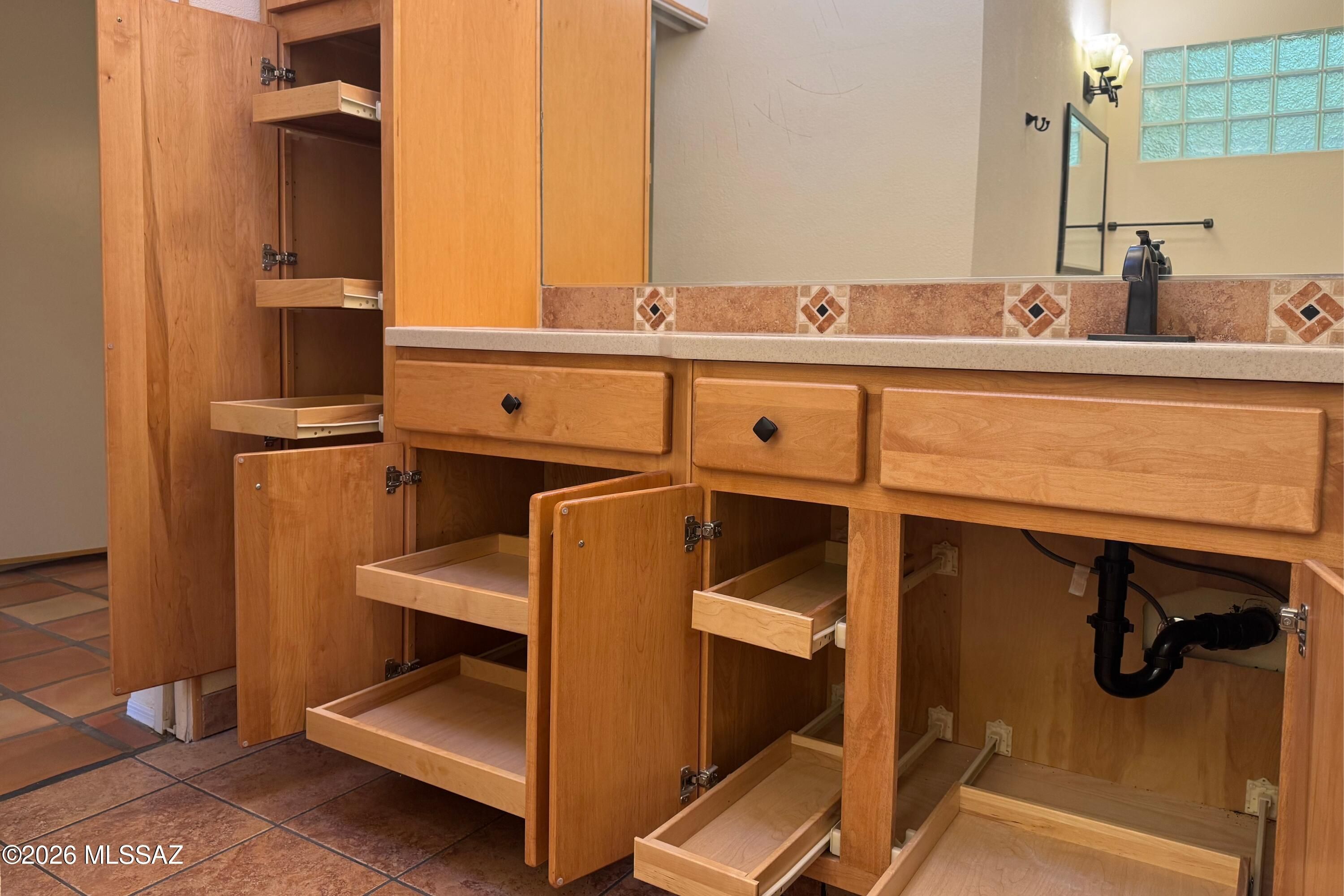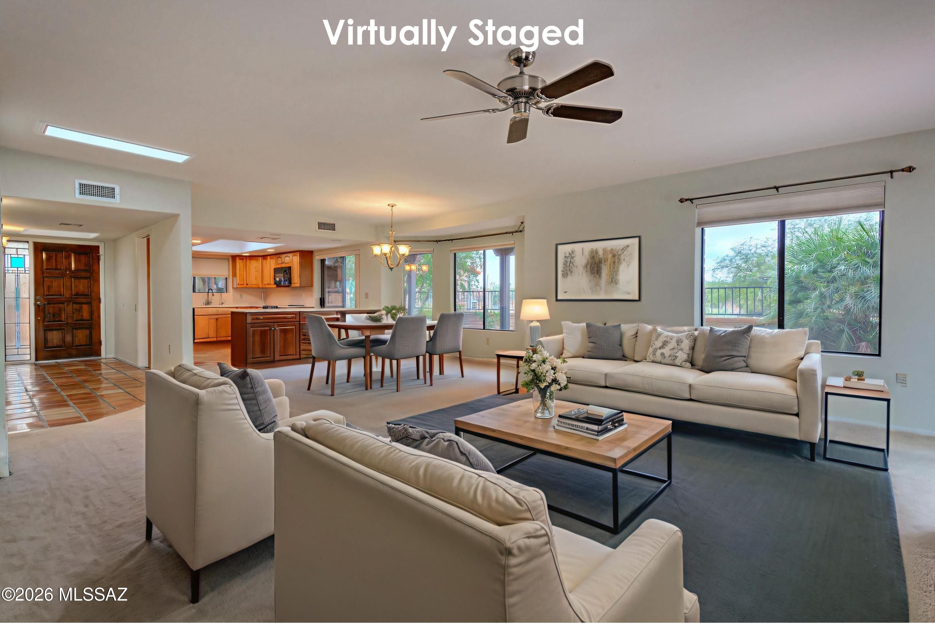 This beautifully remodeled 3-bedroom end-unit townhome offers a bright, open great room with granite breakfast bar, wet bar & gas fireplace. Saltillo tile floors, maple cabinetry, granite counters, abundant windows & skylights fill the home with natural light. Enjoy a wrap-around covered patio backing to common area with Catalina Mountain views, plus remote-controlled shades for sun control. Both bathrooms were fully updated in 2022 with executive-height soft-close maple vanities with pull outs, granite tops, a heated Bask Kohler tub in guest bath & a spacious walk-in shower in primary. The primary suite includes a tucked-away office/craft nook with built-ins. Quiet, private setting close to Canoa Hills Trail, Canoa Rec Center, and nearby golf--ideal for comfortable, low-maintenance living