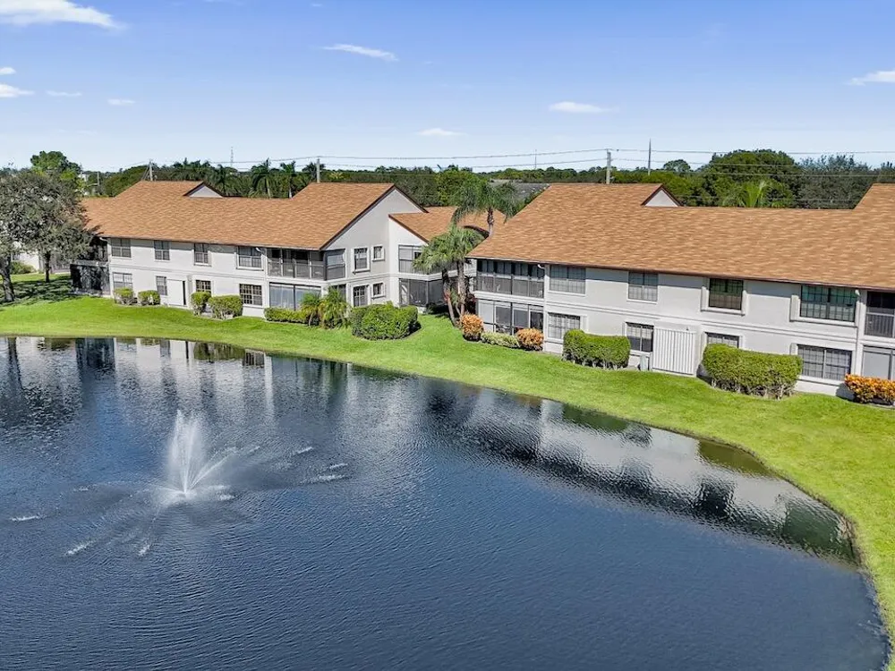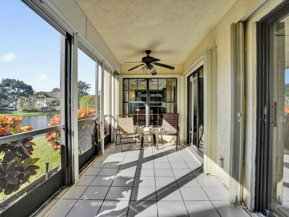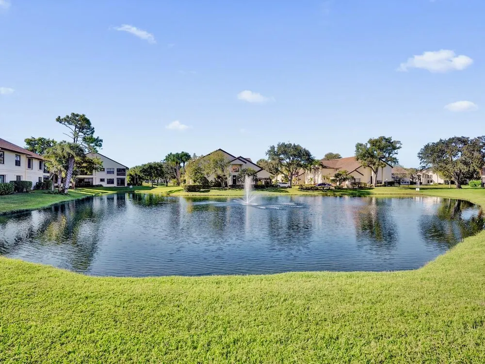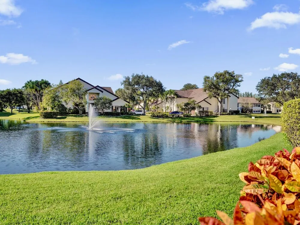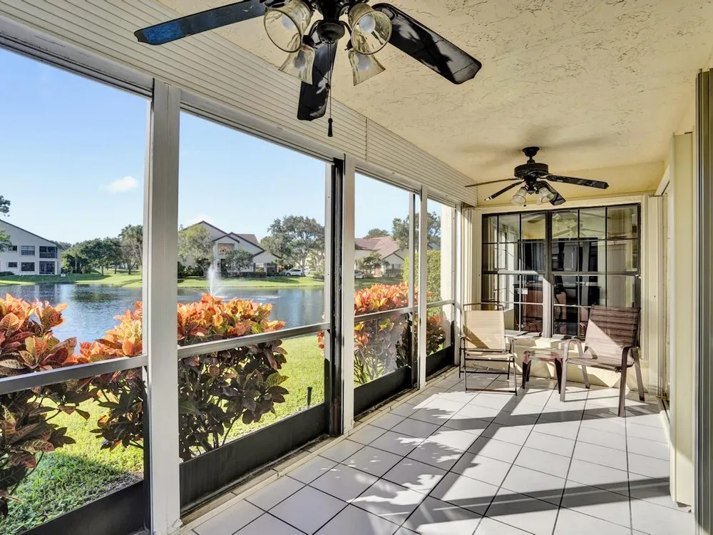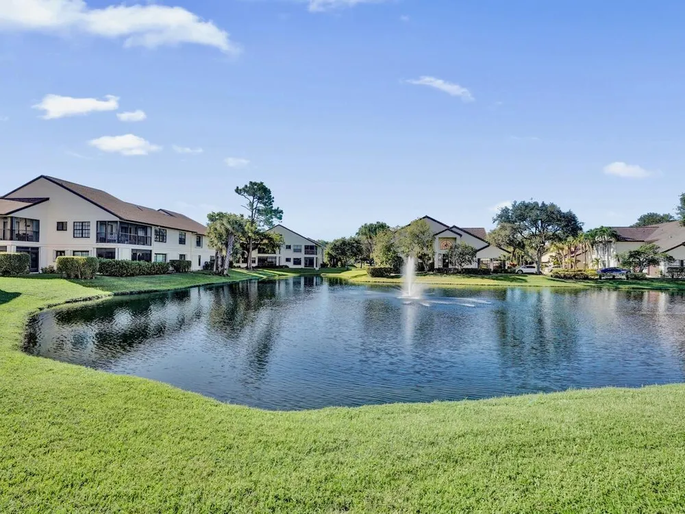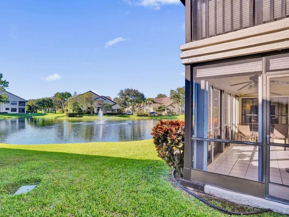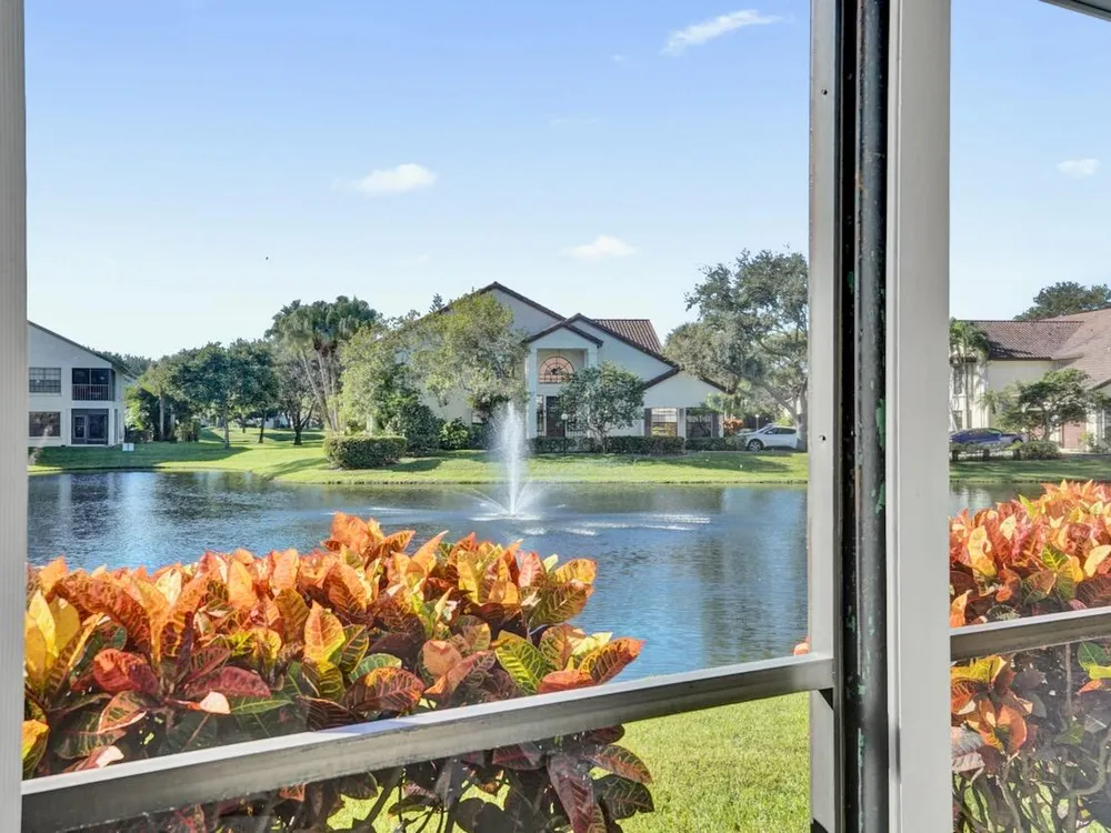 This listing contains virtually staged photos. Welcome Home to Park Pointe! This charming 3-bedroom, 2-bathroom first-floor condo in the desirable 55+ community of Park Pointe in Greenacres is completely move-in ready!As a corner unit with nearly 1,400 sq. ft., this home is filled with natural light and offers a wide lake and fountain view that can be enjoyed from your spacious, screened-in patio. The kitchen features an eat-in area, updated cabinets, and mostly stainless steel appliances. Inside, the home has been meticulously maintained and offers a bright, open feel throughout. Additional features include a 2021 A/C unit, Square D electrical panel, and in-unit washer/dryer hookups conveniently located in a hall closet.Parking is easy with one assigned spot right in front of