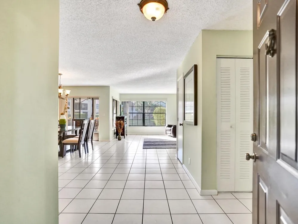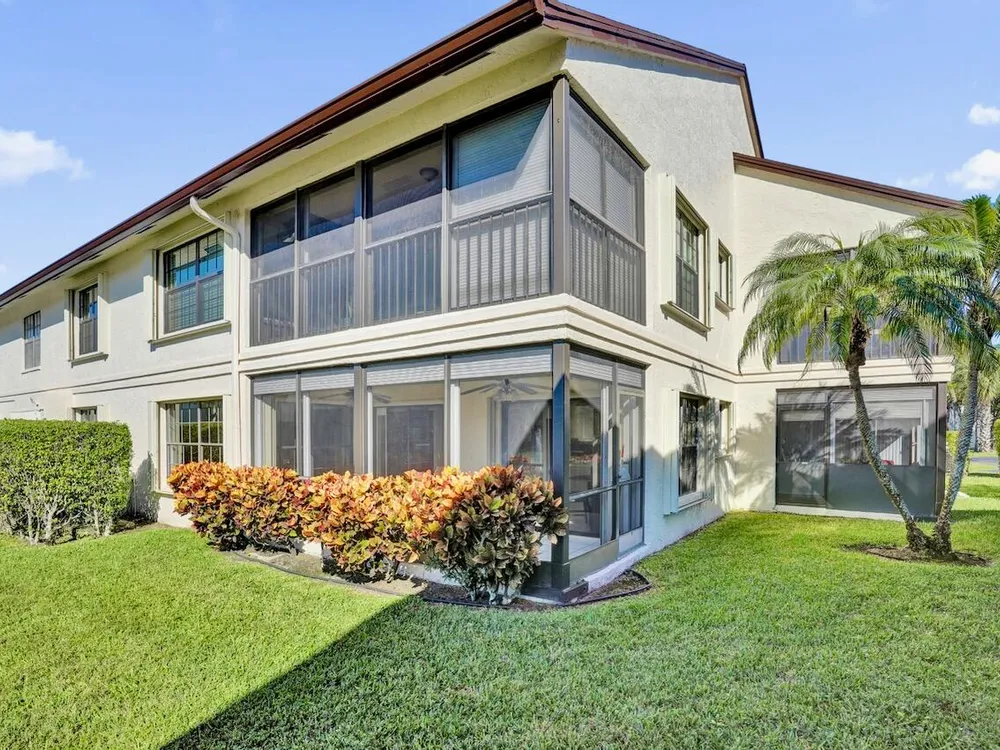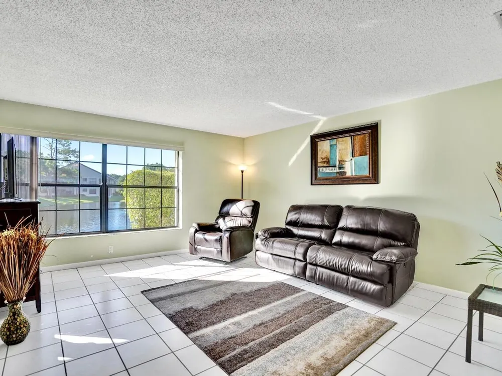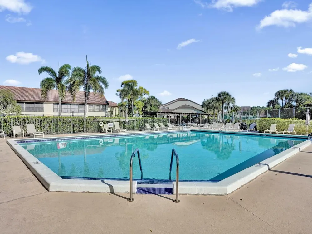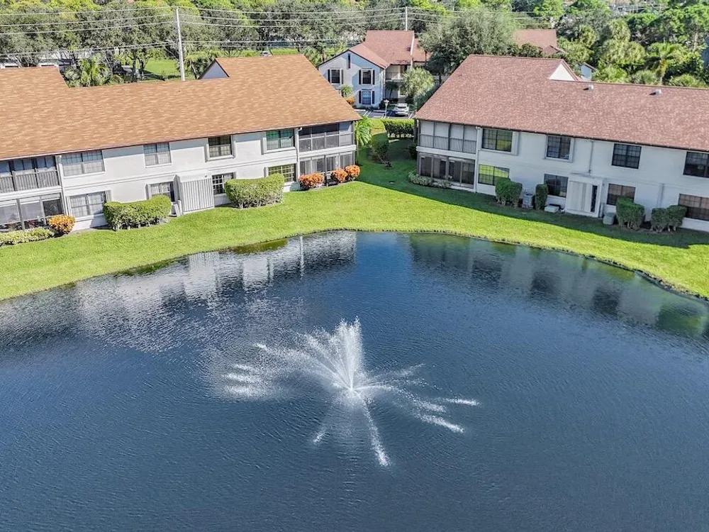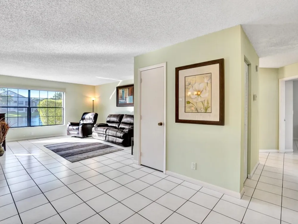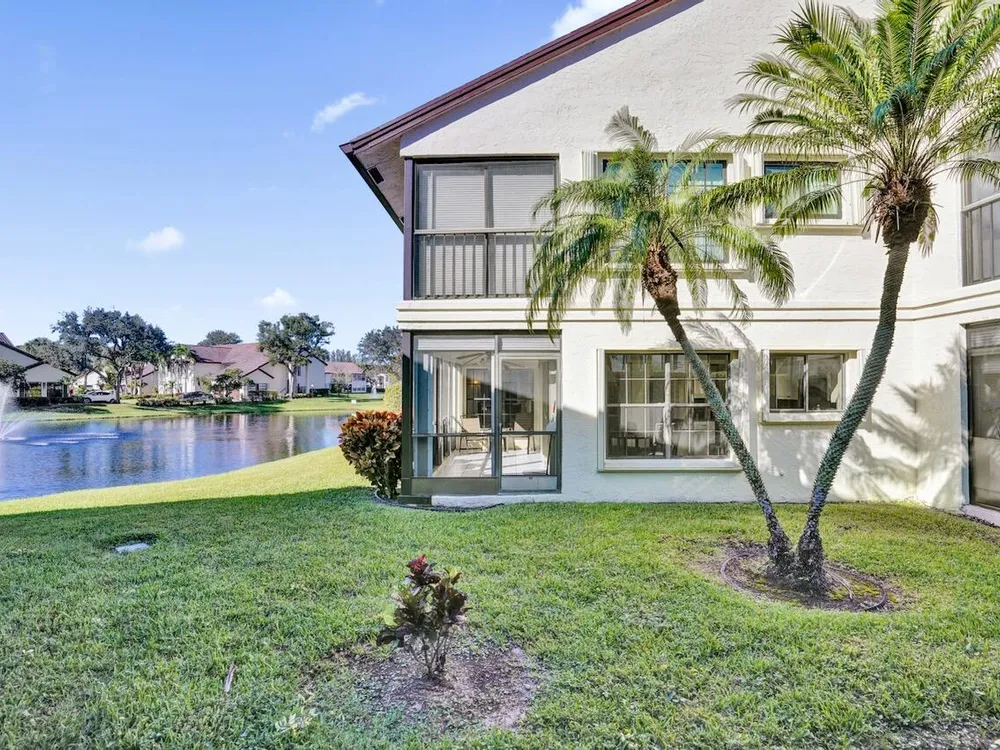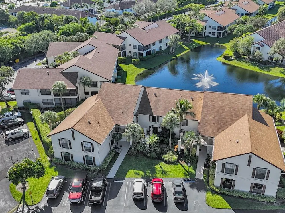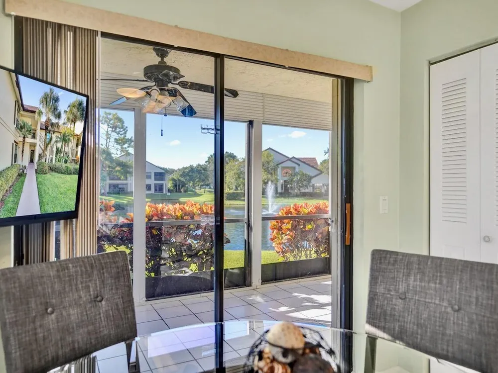 This listing contains virtually staged photos. Welcome Home to Park Pointe! This charming 3-bedroom, 2-bathroom first-floor condo in the desirable 55+ community of Park Pointe in Greenacres is completely move-in ready!As a corner unit with nearly 1,400 sq. ft., this home is filled with natural light and offers a wide lake and fountain view that can be enjoyed from your spacious, screened-in patio. The kitchen features an eat-in area, updated cabinets, and mostly stainless steel appliances. Inside, the home has been meticulously maintained and offers a bright, open feel throughout. Additional features include a 2021 A/C unit, Square D electrical panel, and in-unit washer/dryer hookups conveniently located in a hall closet.Parking is easy with one assigned spot right in front of
