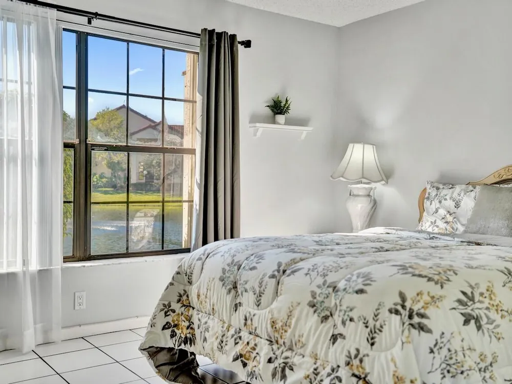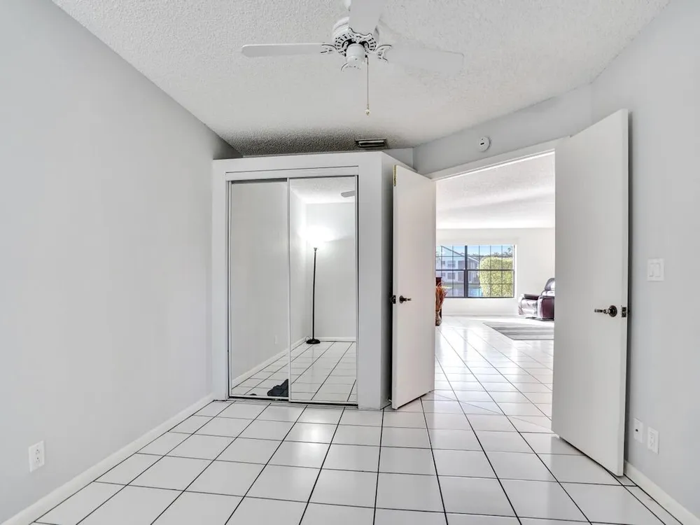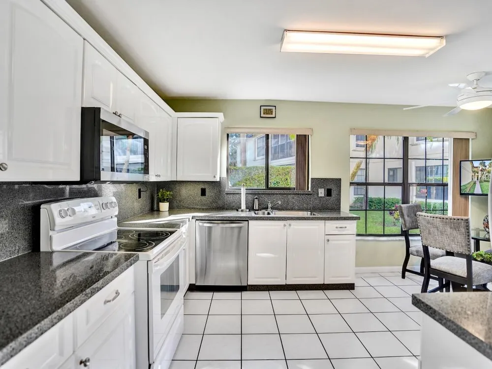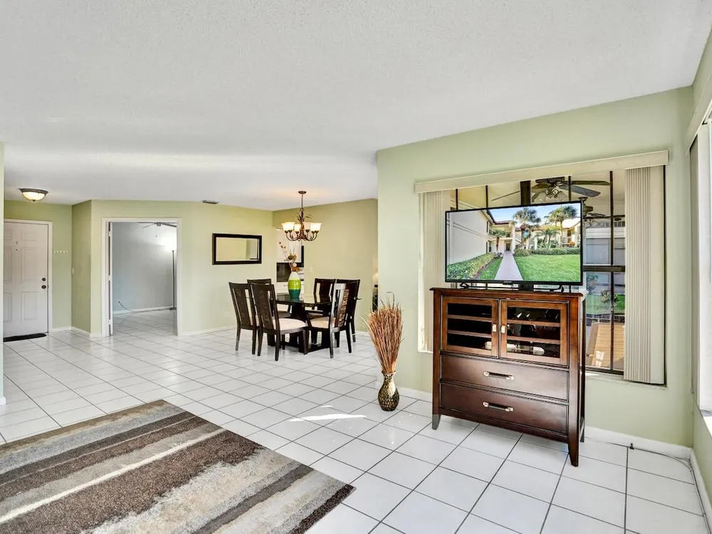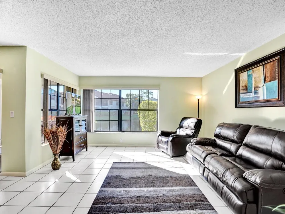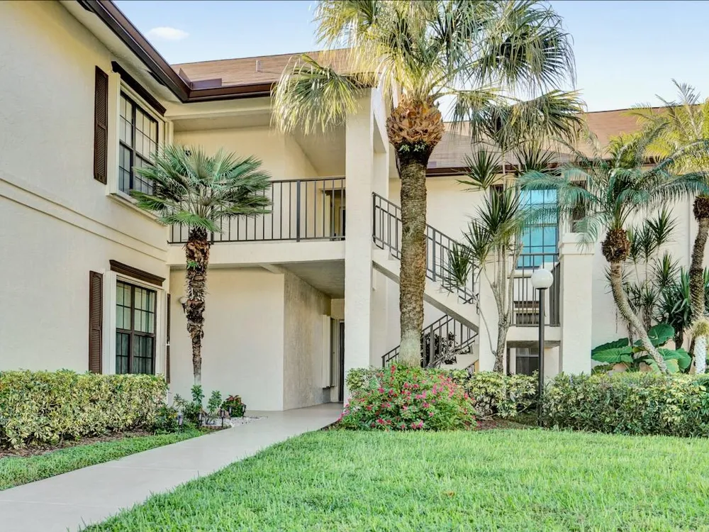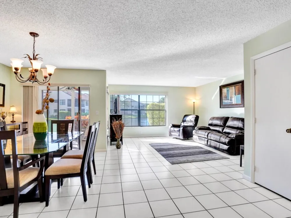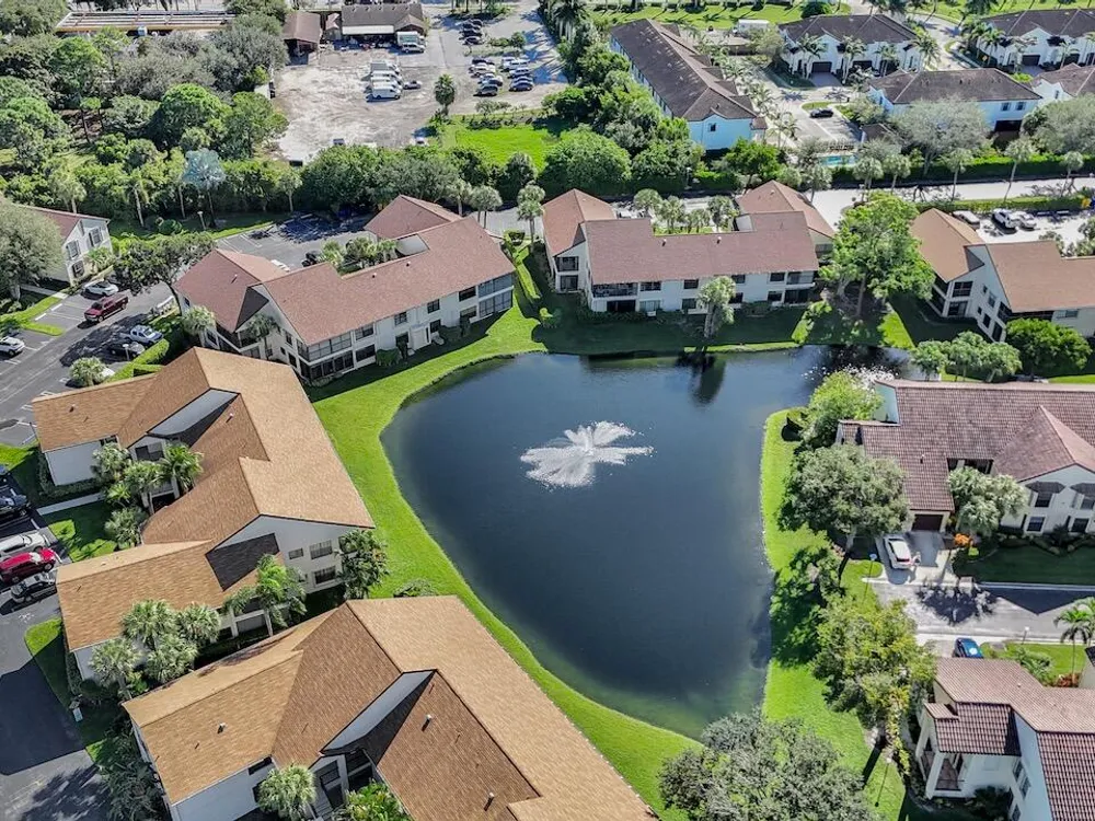 This listing contains virtually staged photos. Welcome Home to Park Pointe! This charming 3-bedroom, 2-bathroom first-floor condo in the desirable 55+ community of Park Pointe in Greenacres is completely move-in ready!As a corner unit with nearly 1,400 sq. ft., this home is filled with natural light and offers a wide lake and fountain view that can be enjoyed from your spacious, screened-in patio. The kitchen features an eat-in area, updated cabinets, and mostly stainless steel appliances. Inside, the home has been meticulously maintained and offers a bright, open feel throughout. Additional features include a 2021 A/C unit, Square D electrical panel, and in-unit washer/dryer hookups conveniently located in a hall closet.Parking is easy with one assigned spot right in front of