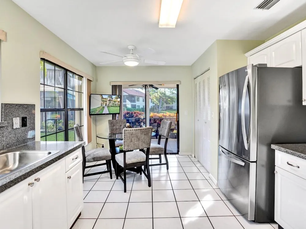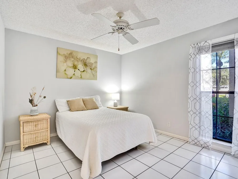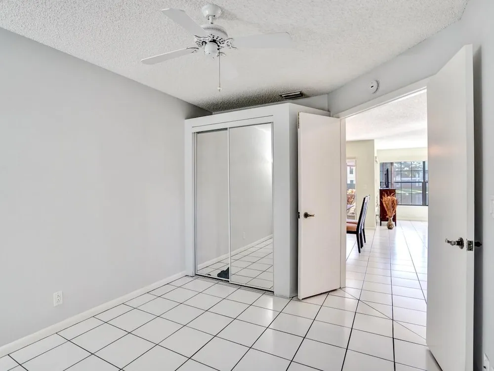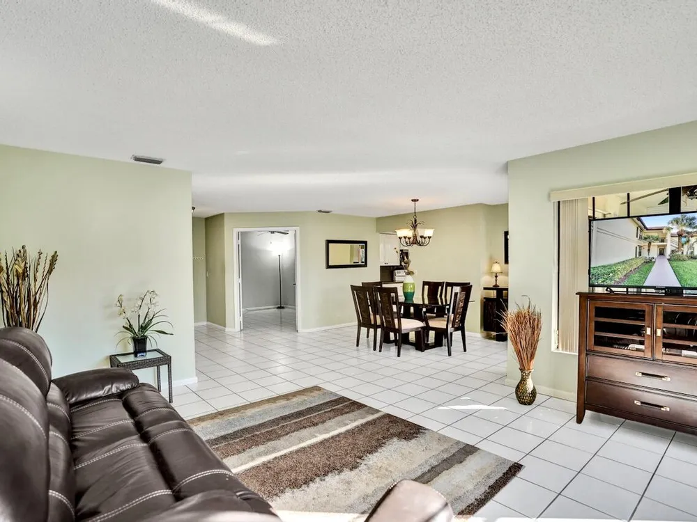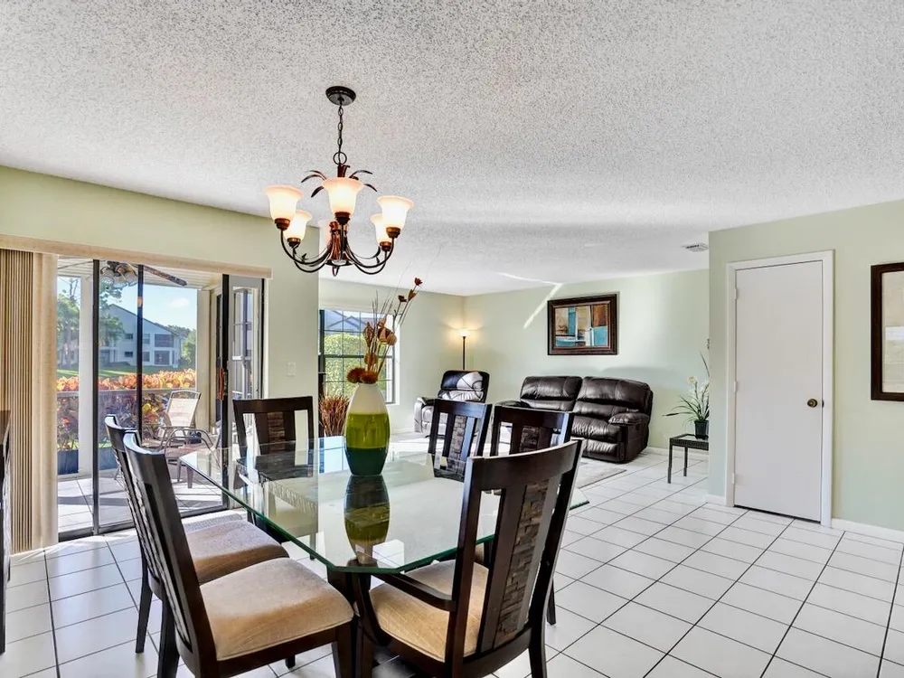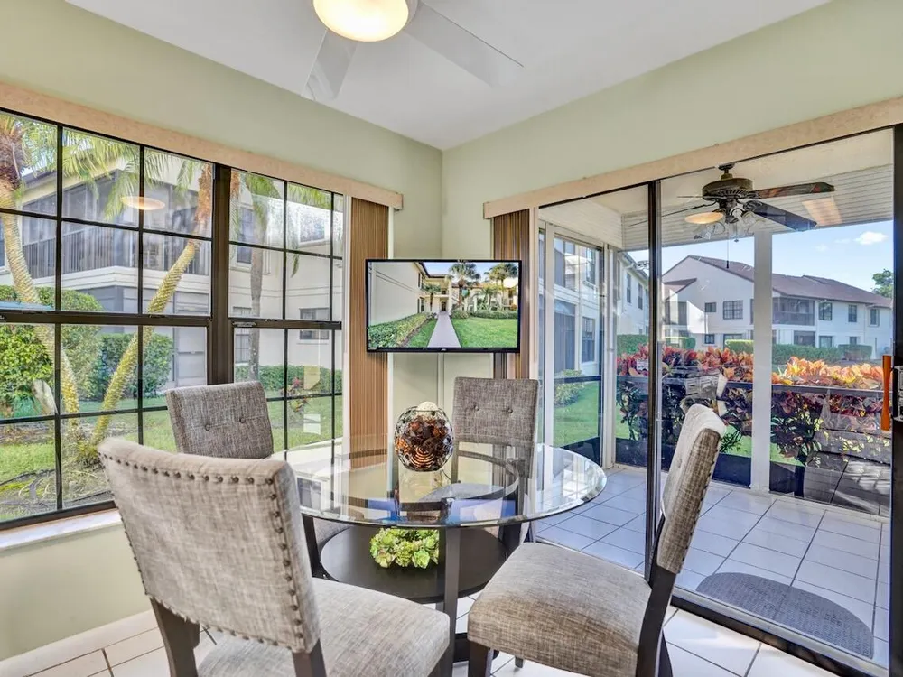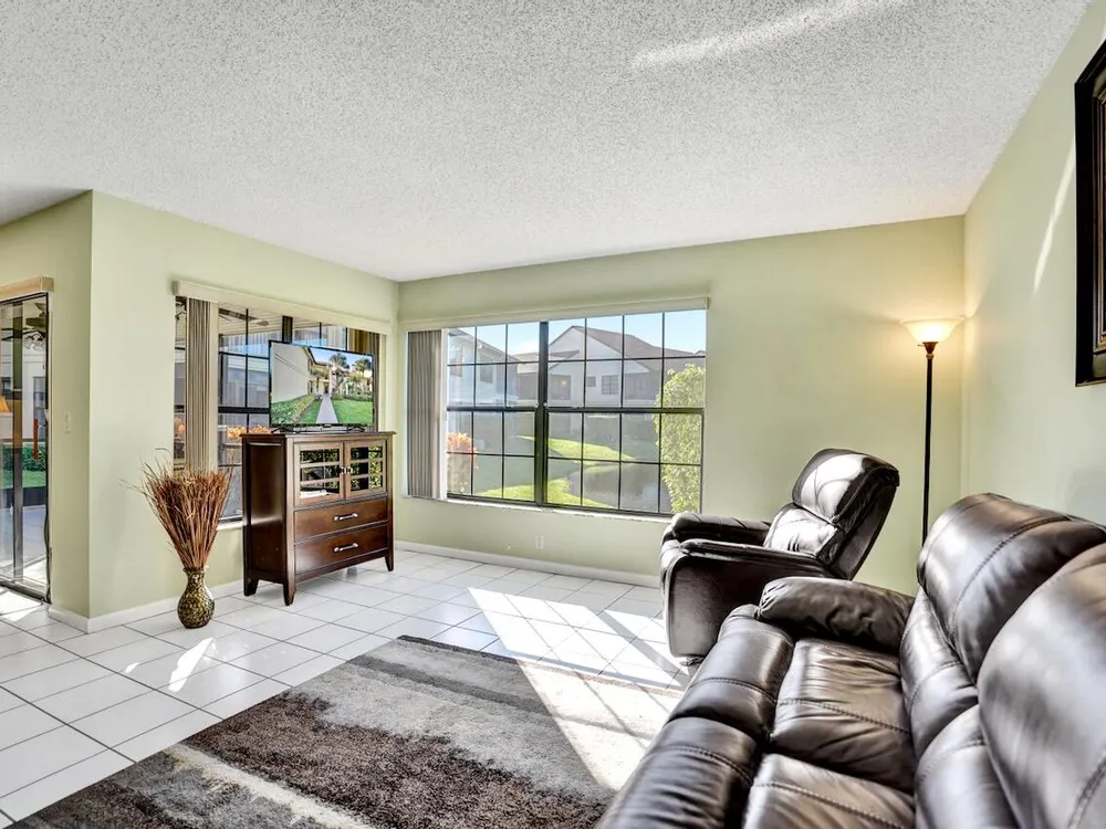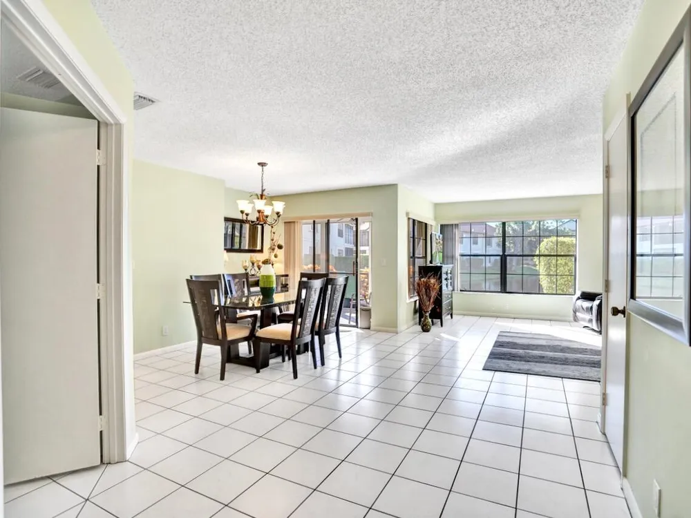 This listing contains virtually staged photos. Welcome Home to Park Pointe! This charming 3-bedroom, 2-bathroom first-floor condo in the desirable 55+ community of Park Pointe in Greenacres is completely move-in ready!As a corner unit with nearly 1,400 sq. ft., this home is filled with natural light and offers a wide lake and fountain view that can be enjoyed from your spacious, screened-in patio. The kitchen features an eat-in area, updated cabinets, and mostly stainless steel appliances. Inside, the home has been meticulously maintained and offers a bright, open feel throughout. Additional features include a 2021 A/C unit, Square D electrical panel, and in-unit washer/dryer hookups conveniently located in a hall closet.Parking is easy with one assigned spot right in front of
