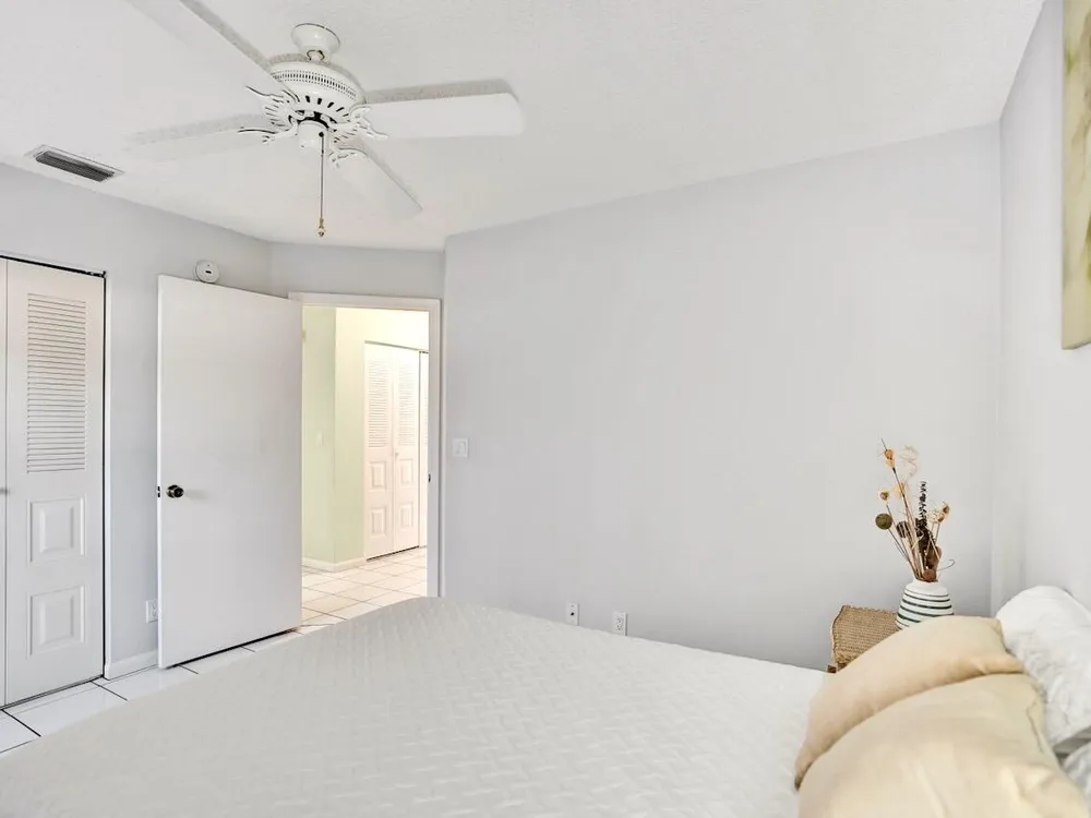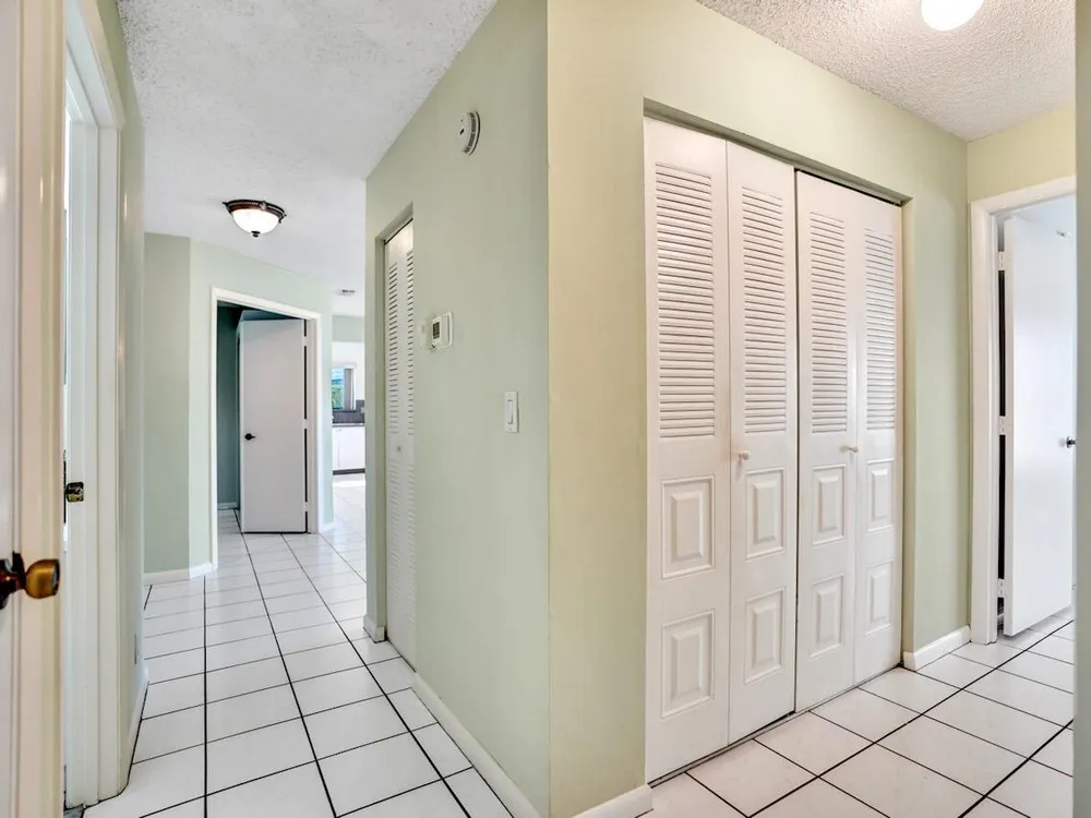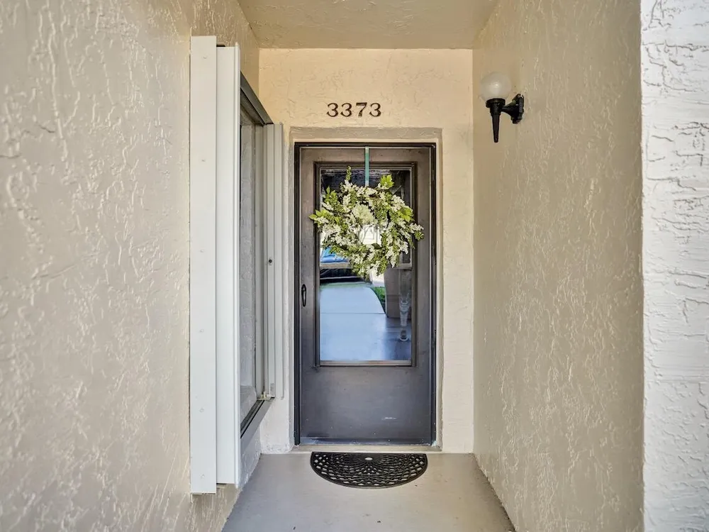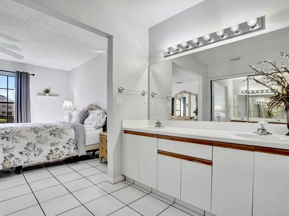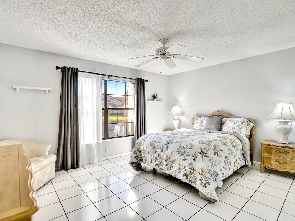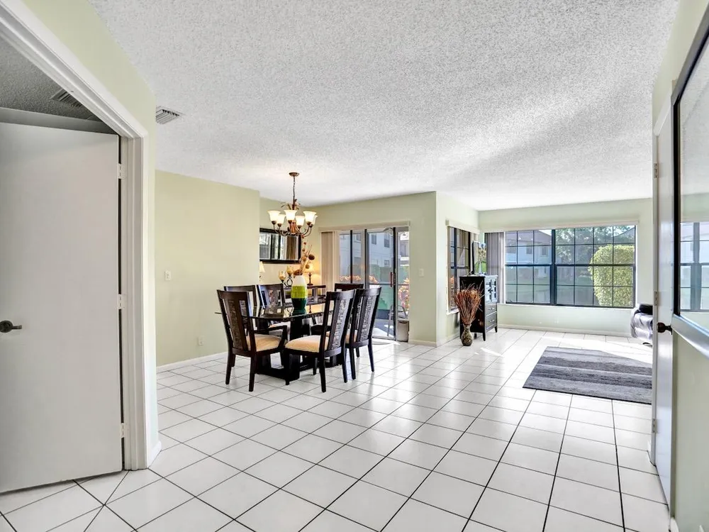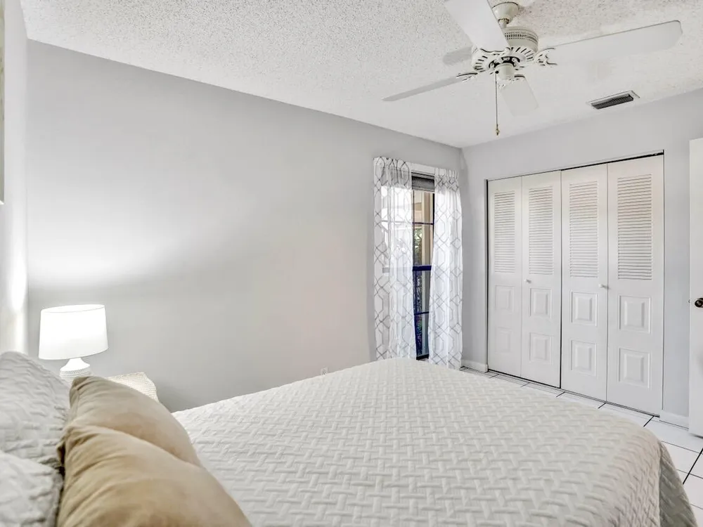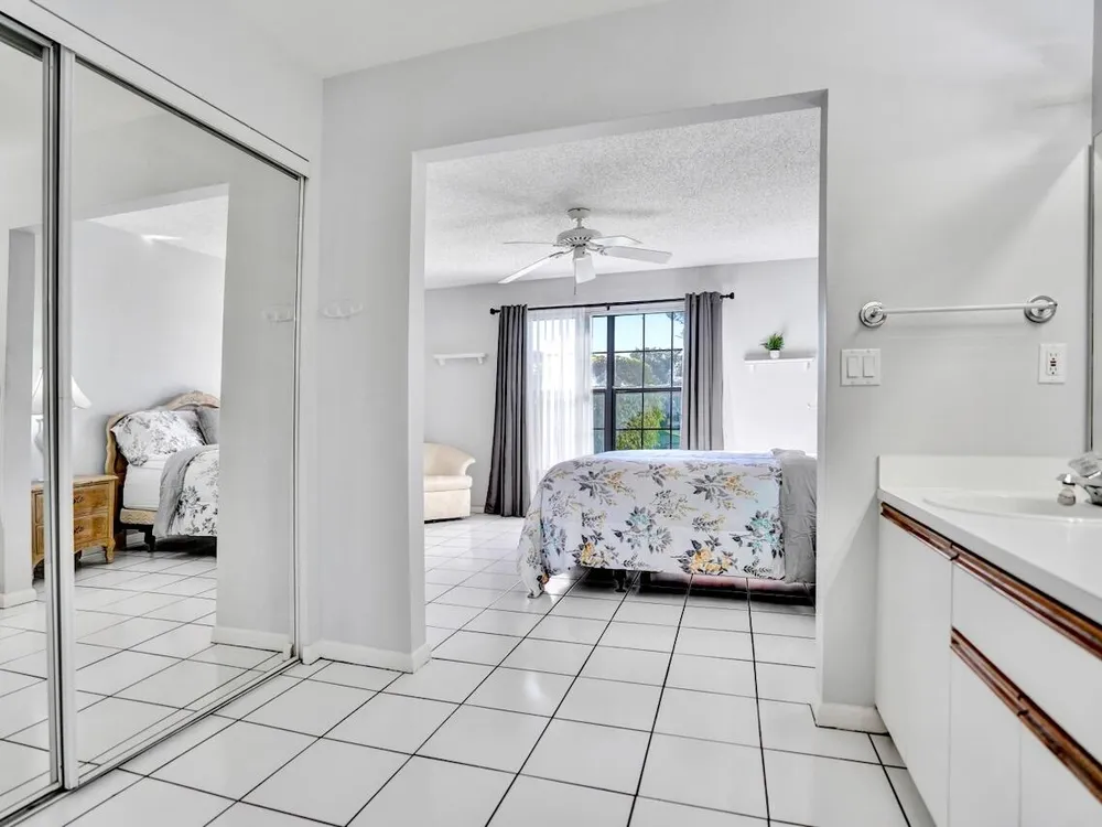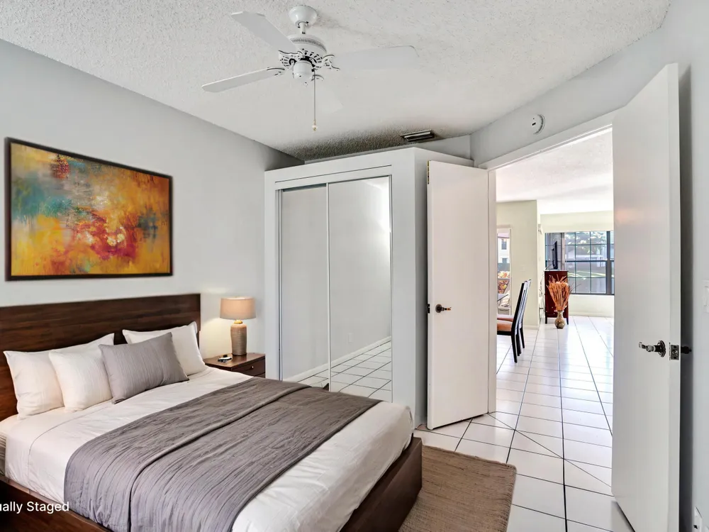 This listing contains virtually staged photos. Welcome Home to Park Pointe! This charming 3-bedroom, 2-bathroom first-floor condo in the desirable 55+ community of Park Pointe in Greenacres is completely move-in ready!As a corner unit with nearly 1,400 sq. ft., this home is filled with natural light and offers a wide lake and fountain view that can be enjoyed from your spacious, screened-in patio. The kitchen features an eat-in area, updated cabinets, and mostly stainless steel appliances. Inside, the home has been meticulously maintained and offers a bright, open feel throughout. Additional features include a 2021 A/C unit, Square D electrical panel, and in-unit washer/dryer hookups conveniently located in a hall closet.Parking is easy with one assigned spot right in front of