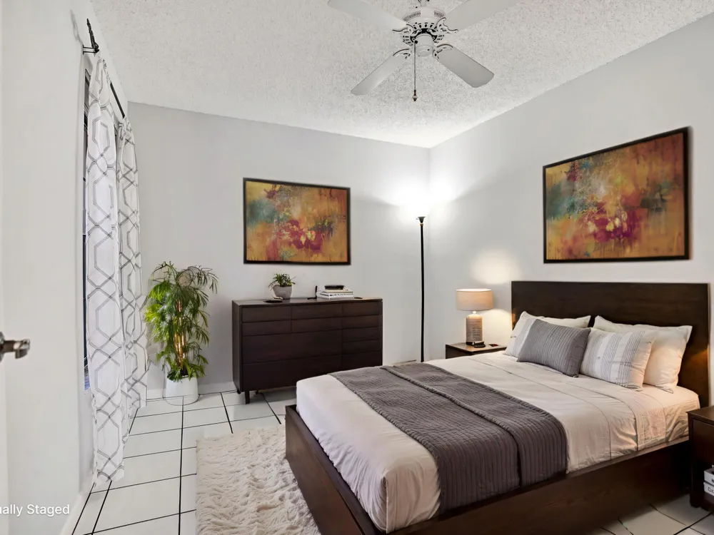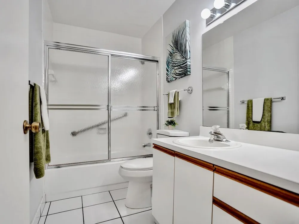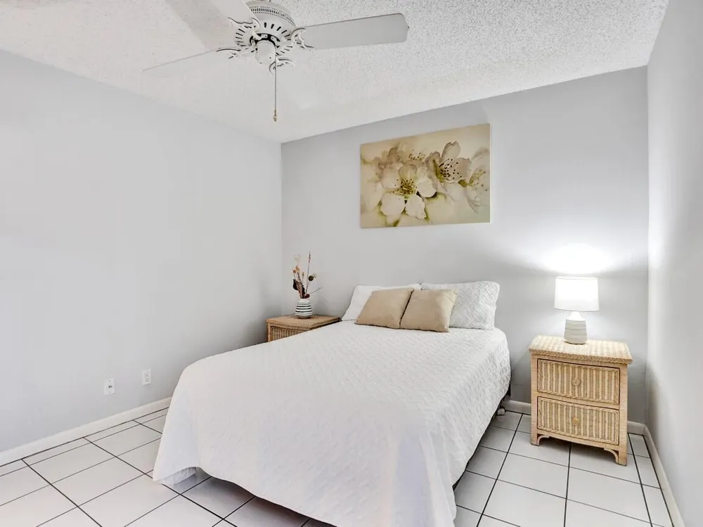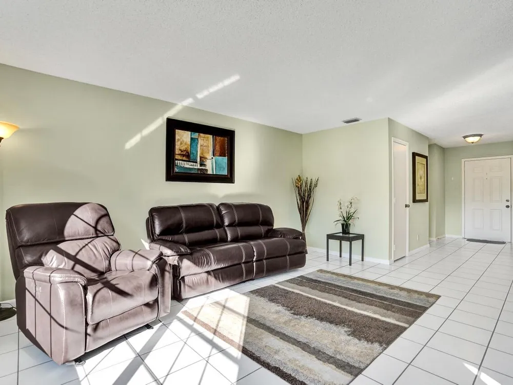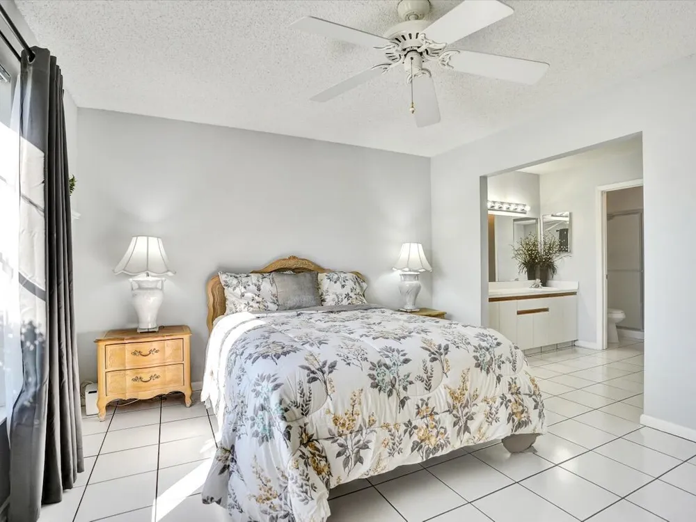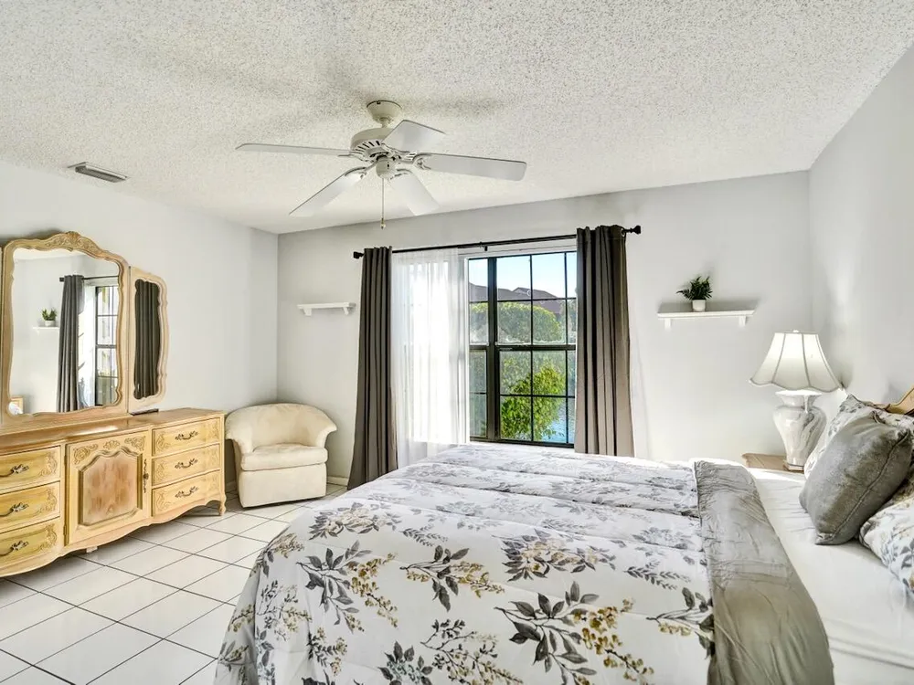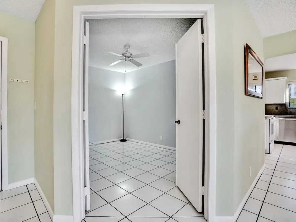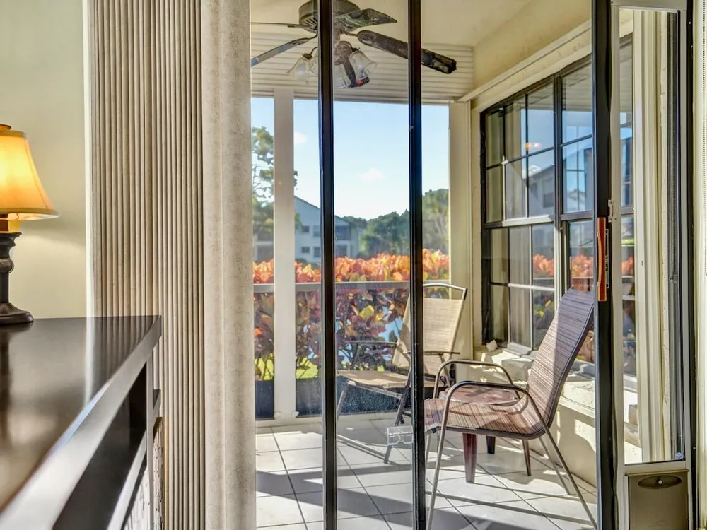 This listing contains virtually staged photos. Welcome Home to Park Pointe! This charming 3-bedroom, 2-bathroom first-floor condo in the desirable 55+ community of Park Pointe in Greenacres is completely move-in ready!As a corner unit with nearly 1,400 sq. ft., this home is filled with natural light and offers a wide lake and fountain view that can be enjoyed from your spacious, screened-in patio. The kitchen features an eat-in area, updated cabinets, and mostly stainless steel appliances. Inside, the home has been meticulously maintained and offers a bright, open feel throughout. Additional features include a 2021 A/C unit, Square D electrical panel, and in-unit washer/dryer hookups conveniently located in a hall closet.Parking is easy with one assigned spot right in front of