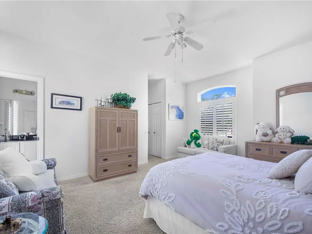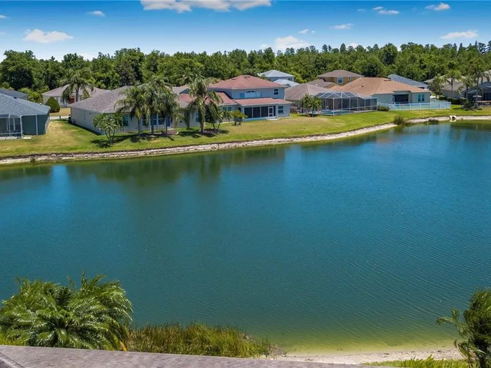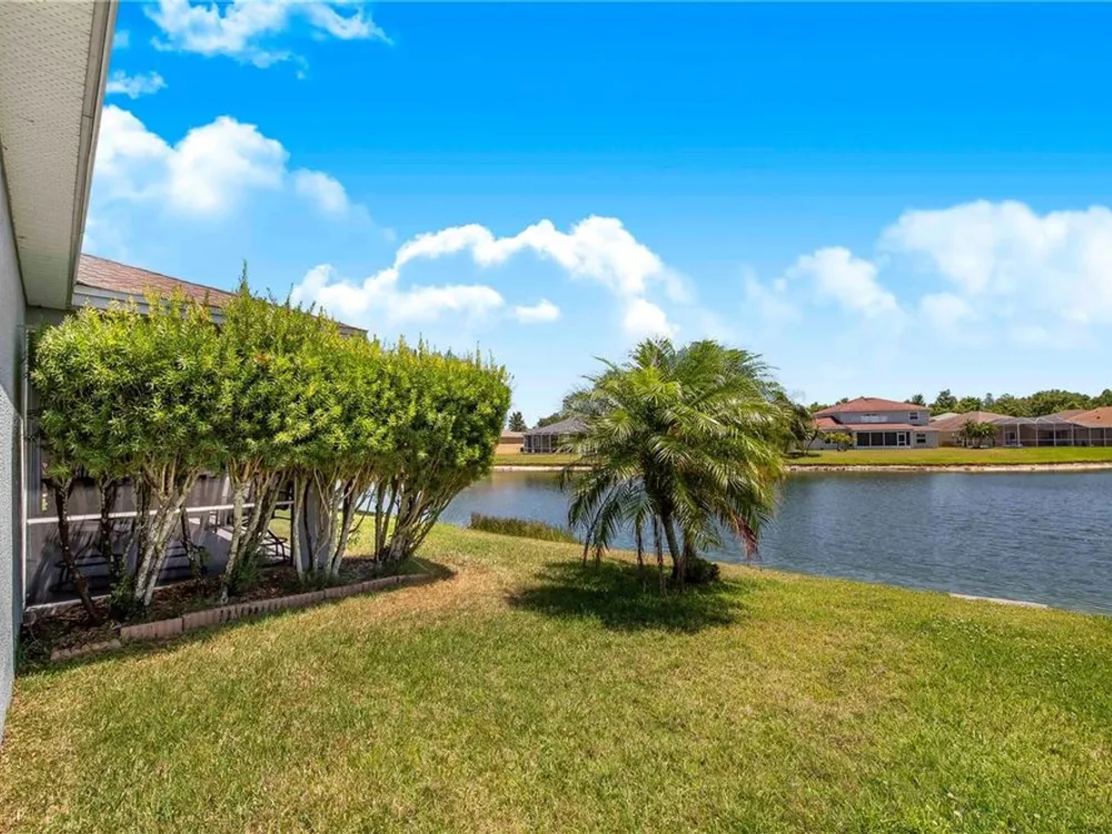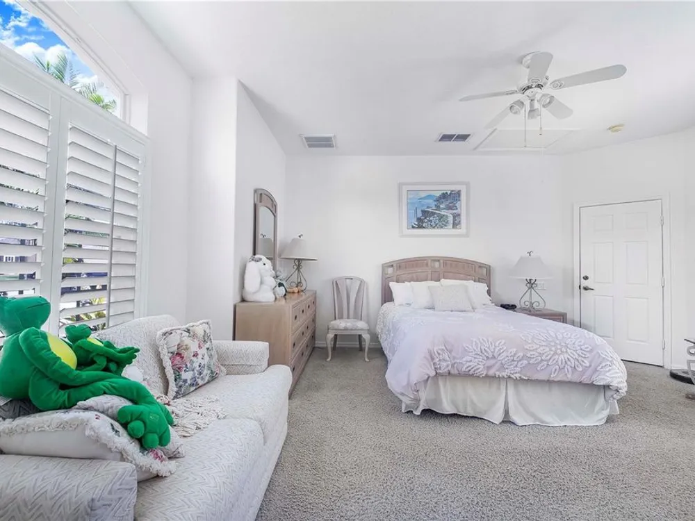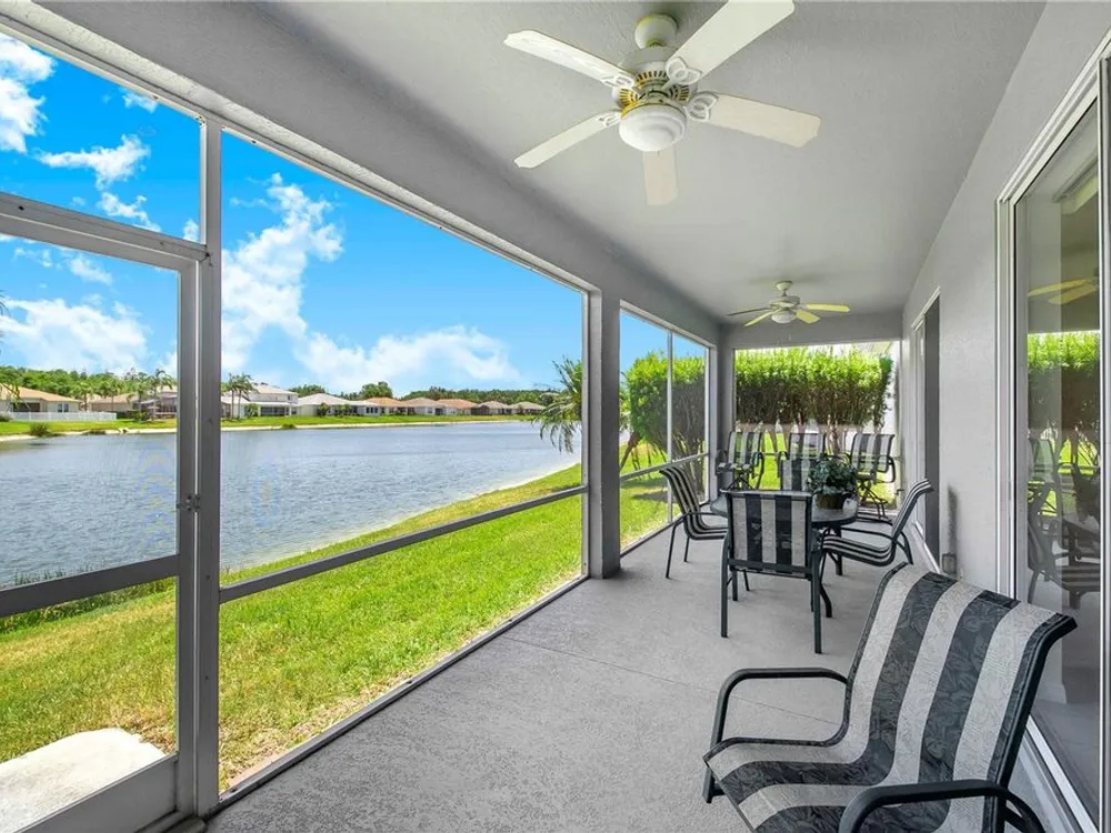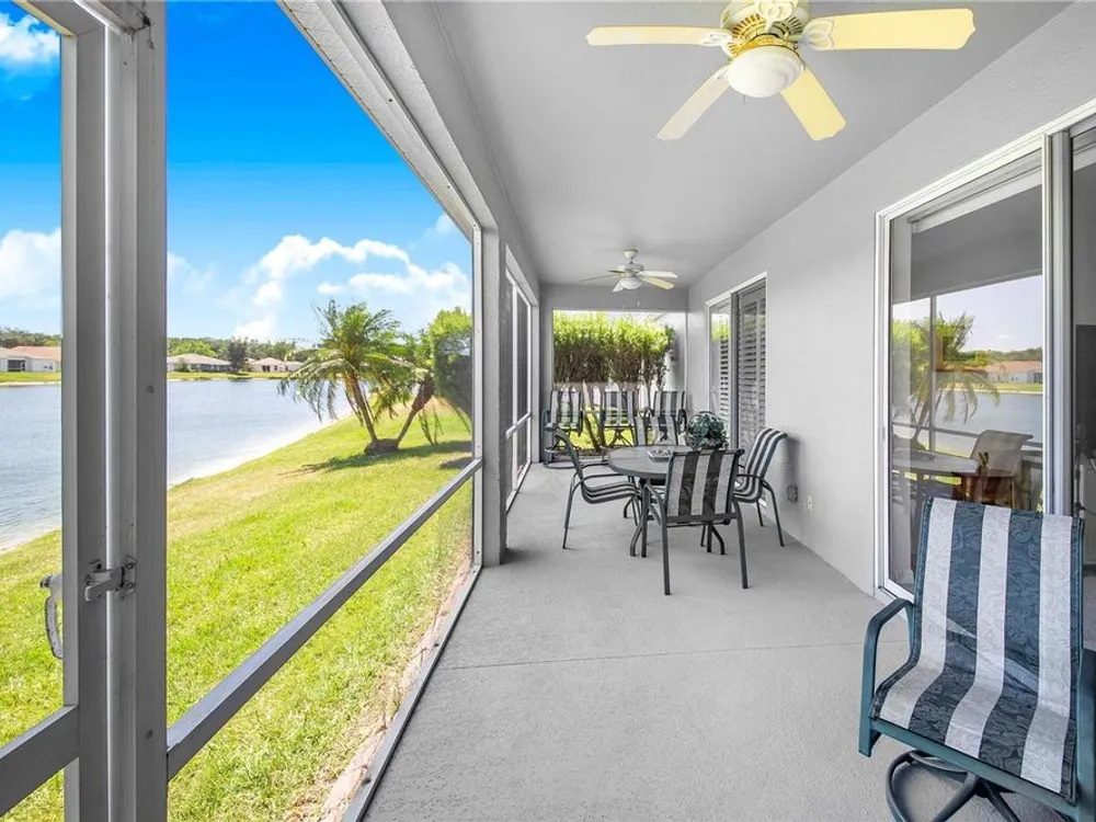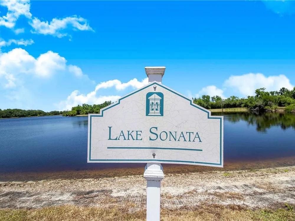Welcome to this beautifully designed 3-bedroom 3 bath, nestled in the vibrant lakefront community of Carillon Lakes on the shores of Lake Sonata. Thoughtfully laid out for comfort and privacy, this home features a unique atrium that separates the guest or in-law suite from the main living area-perfect for extended family or visitors. The guest suite includes its own private entrance, a kitchenette with a refrigerator and microwave, and a convenient storage closet. Inside, you'll find light neutral walls that enhance the home's airy and inviting feel and elegant plantation shutters throughout. The owner's suite is a true retreat with its own sitting area, a spacious walk-in closet, and a large bathroom designed for relaxation. The home also boasts a newly painted exterior and a roof installed in 2018, offering peace of mind for years to come. Enjoy everyday convenience with a dedicated laundry room and a beautiful entryway that welcomes you with charm. Step out back to a screened-in room that offers tranquil views of Lake Sonata, ideal for morning coffee or evening sunsets. Enjoy access to wonderful community amenities including a clubhouse, tennis and basketball courts, and a dedicated cornhole area- ideal for fun and connection with neighbors. Furnishings can be purchased in a separately. This is a rare opportunity to own a private, spacious, and beautifully maintained home in a highly desirable location.