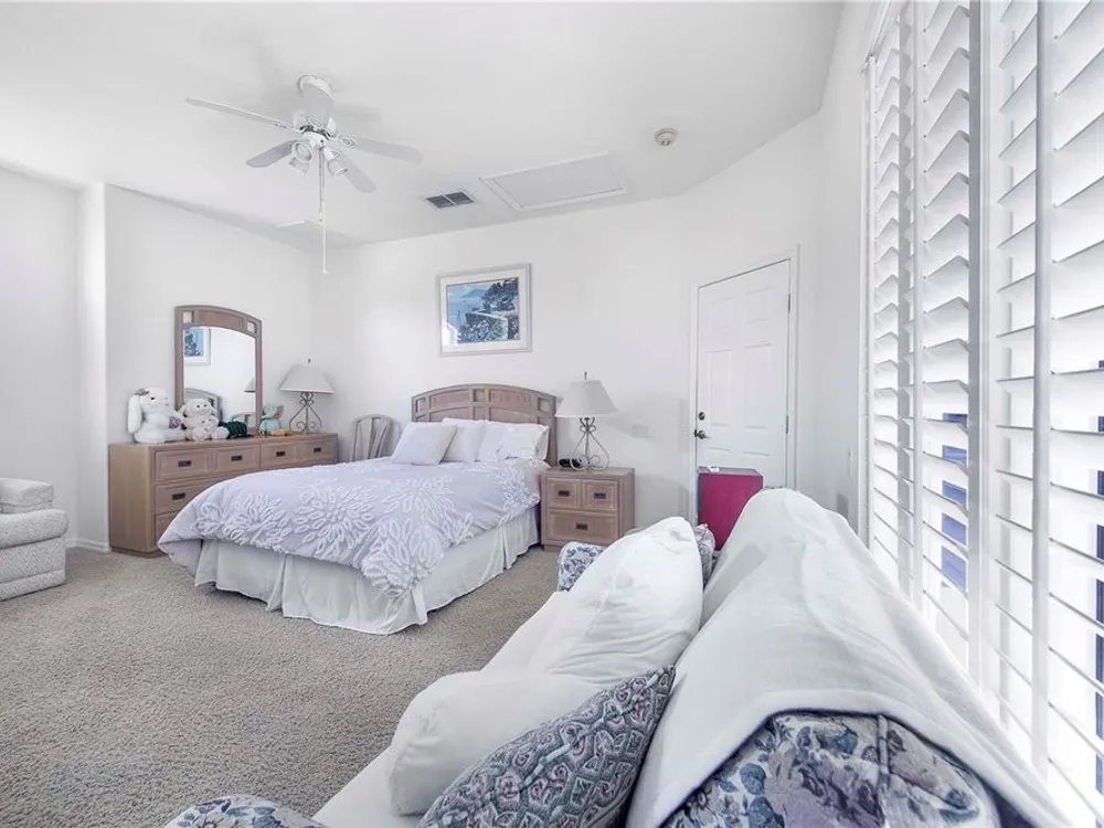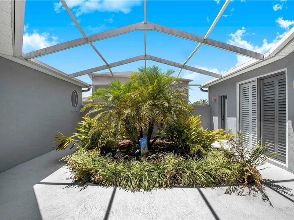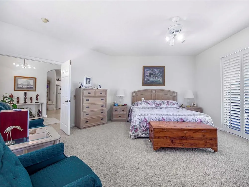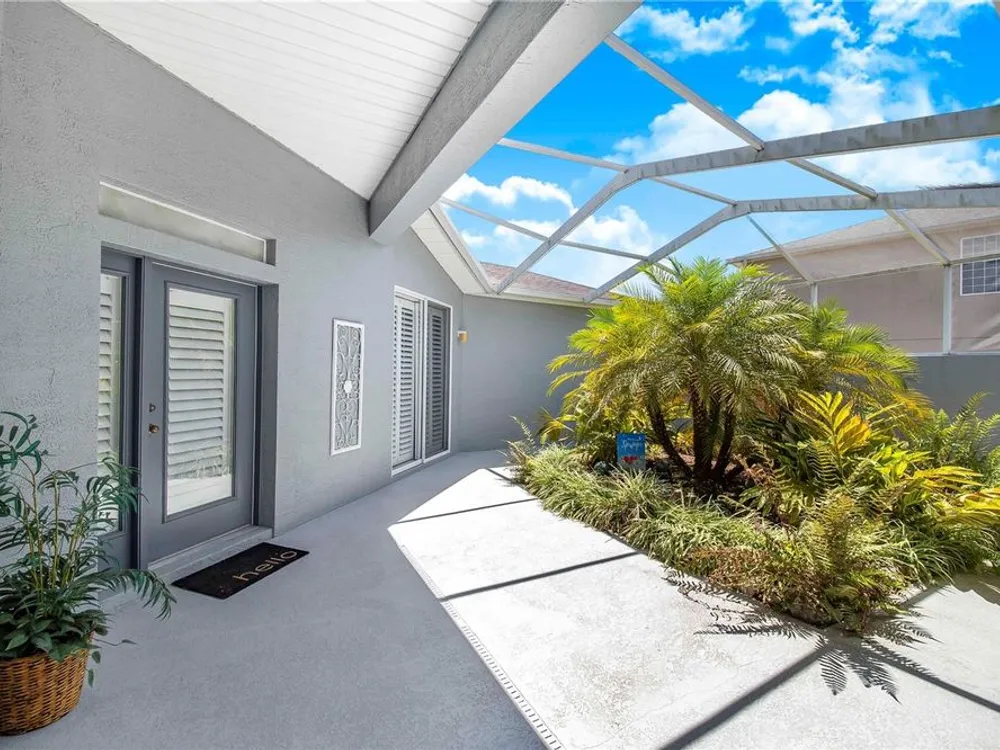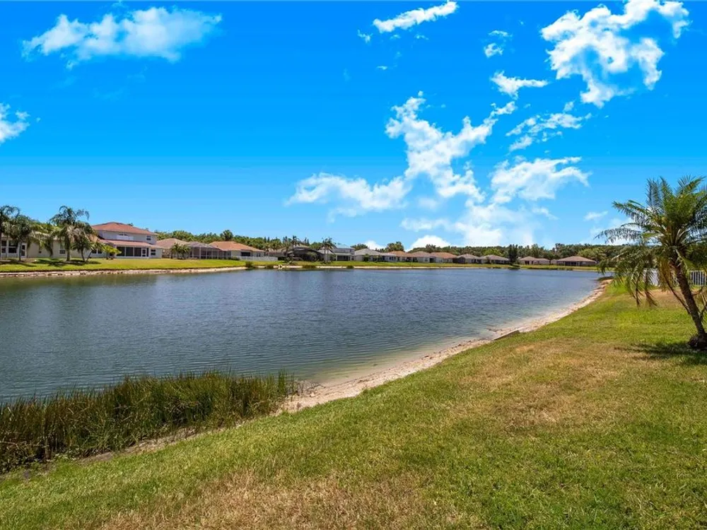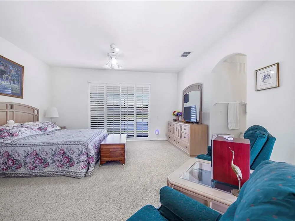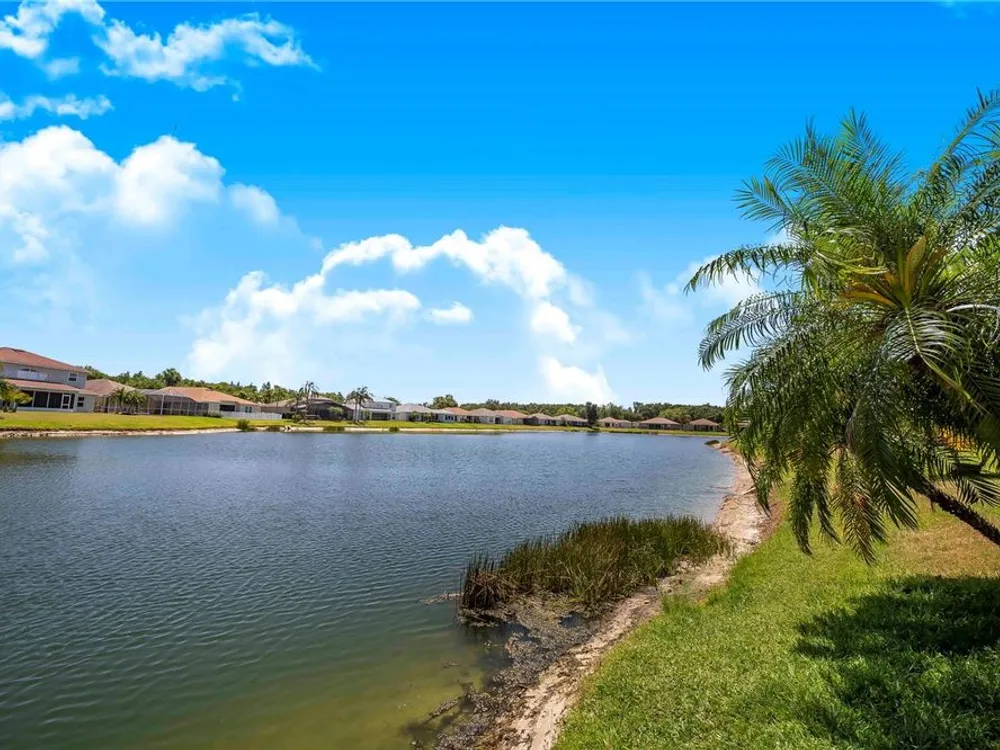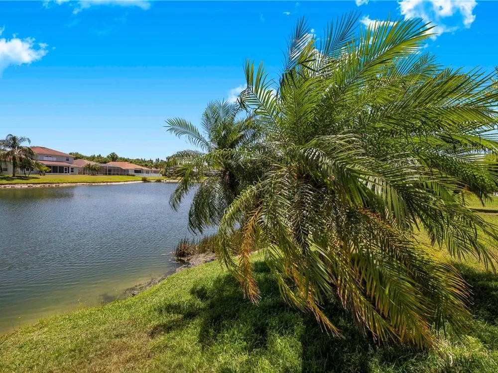 Welcome to this beautifully designed 3-bedroom 3 bath, nestled in the vibrant lakefront community of Carillon Lakes on the shores of Lake Sonata. Thoughtfully laid out for comfort and privacy, this home features a unique atrium that separates the guest or in-law suite from the main living area-perfect for extended family or visitors. The guest suite includes its own private entrance, a kitchenette with a refrigerator and microwave, and a convenient storage closet. Inside, you'll find light neutral walls that enhance the home's airy and inviting feel and elegant plantation shutters throughout. The owner's suite is a true retreat with its own sitting area, a spacious walk-in closet, and a large bathroom designed for relaxation. The home also boasts a newly painted exterior and a roof installed in 2018, offering peace of mind for years to come. Enjoy everyday convenience with a dedicated laundry room and a beautiful entryway that welcomes you with charm. Step out back to a screened-in room that offers tranquil views of Lake Sonata, ideal for morning coffee or evening sunsets. Enjoy access to wonderful community amenities including a clubhouse, tennis and basketball courts, and a dedicated cornhole area- ideal for fun and connection with neighbors. Furnishings can be purchased in a separately. This is a rare opportunity to own a private, spacious, and beautifully maintained home in a highly desirable location.