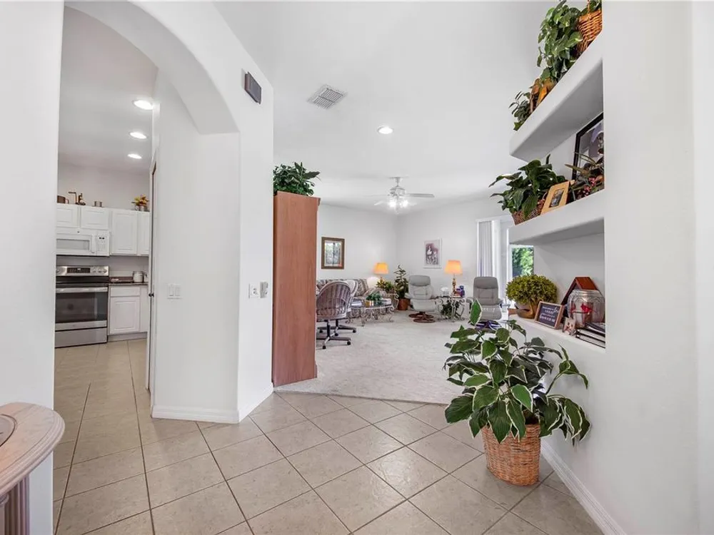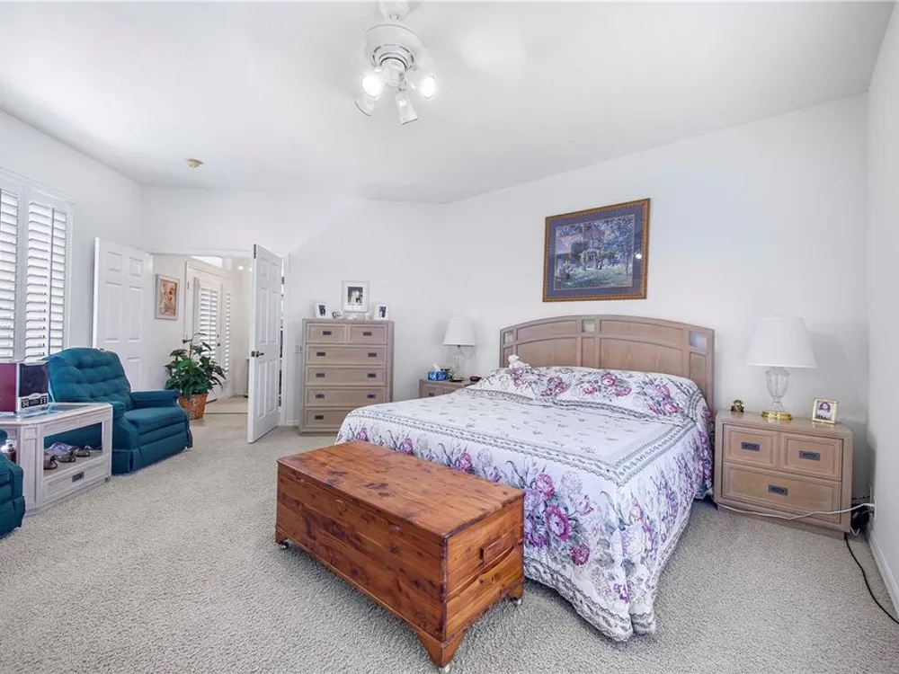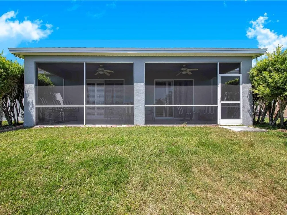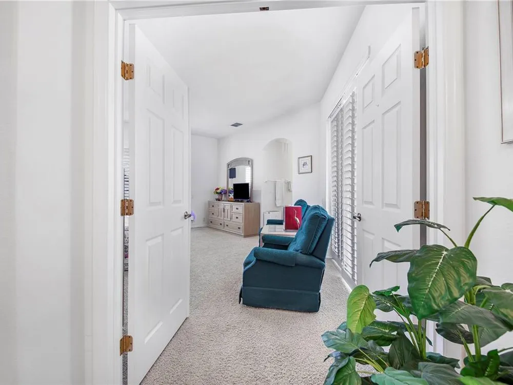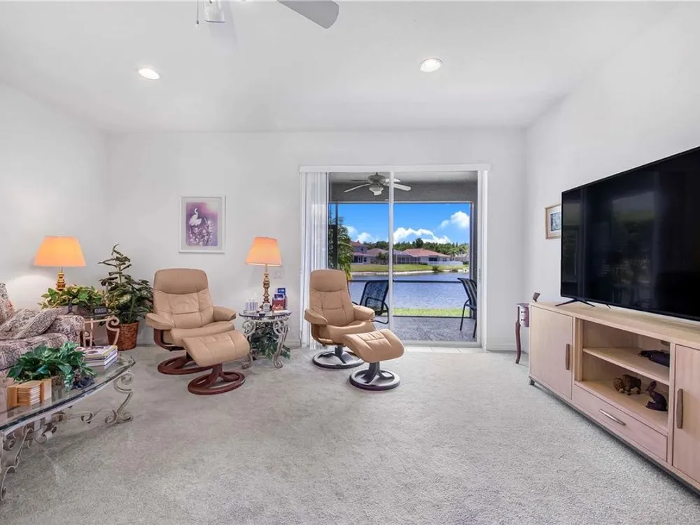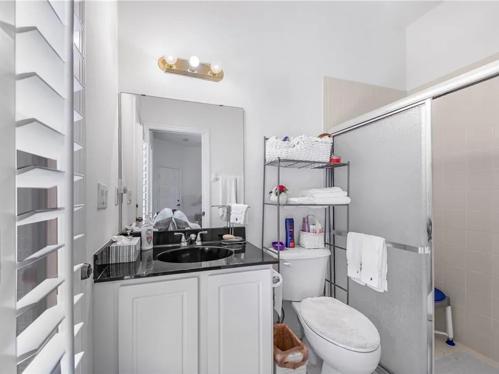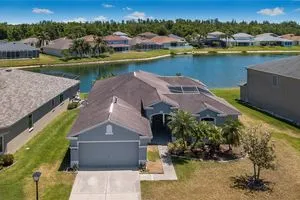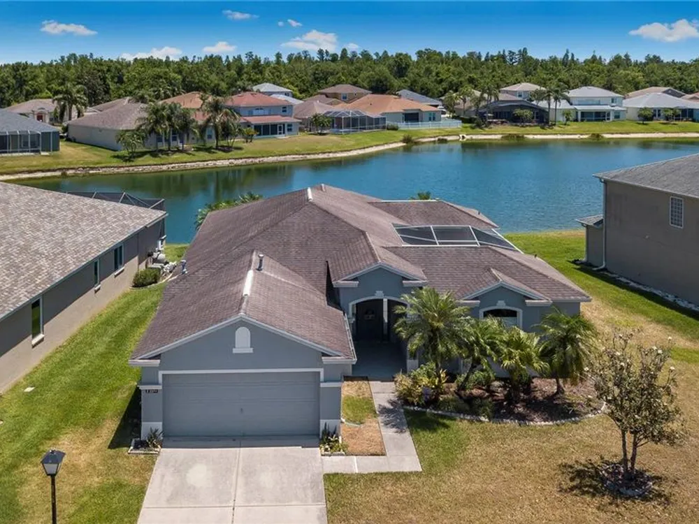 Welcome to this beautifully designed 3-bedroom 3 bath, nestled in the vibrant lakefront community of Carillon Lakes on the shores of Lake Sonata. Thoughtfully laid out for comfort and privacy, this home features a unique atrium that separates the guest or in-law suite from the main living area-perfect for extended family or visitors. The guest suite includes its own private entrance, a kitchenette with a refrigerator and microwave, and a convenient storage closet. Inside, you'll find light neutral walls that enhance the home's airy and inviting feel and elegant plantation shutters throughout. The owner's suite is a true retreat with its own sitting area, a spacious walk-in closet, and a large bathroom designed for relaxation. The home also boasts a newly painted exterior and a roof installed in 2018, offering peace of mind for years to come. Enjoy everyday convenience with a dedicated laundry room and a beautiful entryway that welcomes you with charm. Step out back to a screened-in room that offers tranquil views of Lake Sonata, ideal for morning coffee or evening sunsets. Enjoy access to wonderful community amenities including a clubhouse, tennis and basketball courts, and a dedicated cornhole area- ideal for fun and connection with neighbors. Furnishings can be purchased in a separately. This is a rare opportunity to own a private, spacious, and beautifully maintained home in a highly desirable location.