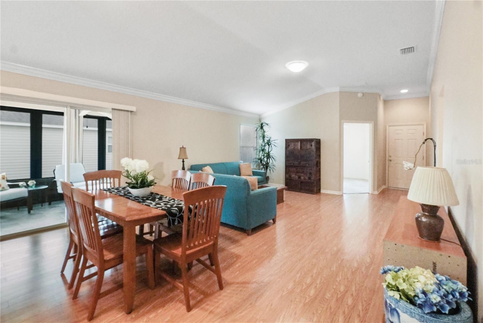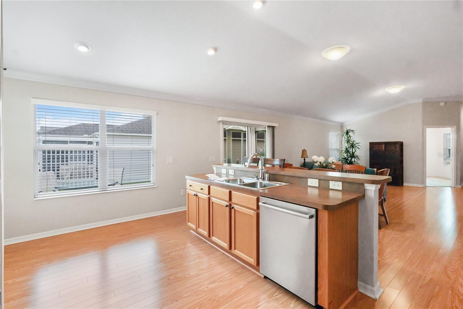 Welcome to this popular At Ease floor plan in The Village of Charlotte featuring 3 bedrooms, 2 bathrooms, and a 2-car garage. Designed with an open layout and volume ceilings, this home offers a bright and spacious feel throughout. The main living areas—including the living room, dining room, and kitchen—feature beautiful wood laminate flooring for easy care and style. Enjoy the comfort of an enclosed and tiled lanai, which faces the side of the home for complete privacy—perfect for relaxing with your morning coffee or entertaining guests. Thoughtful upgrades include crown molding, double-pane Low E windows, a front storm door, and gutters, adding both function and value. The HVAC was replaced in 2025. Located in a highly desirable area, this home is just minutes from Colony Shopping Plaza, Neighborhood Wal-Mart, and Brownwood Paddock Square, offering convenient access to shopping, dining, and entertainment. Don’t miss your chance to make this beautifully maintained At Ease model your next home in The Villages!