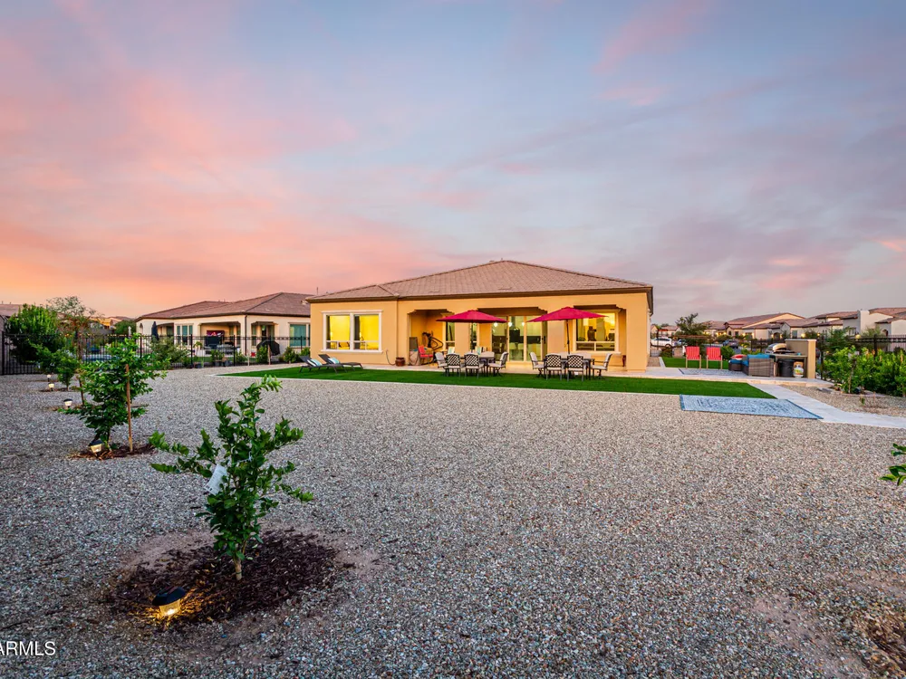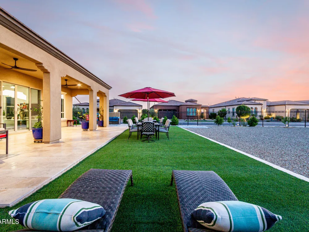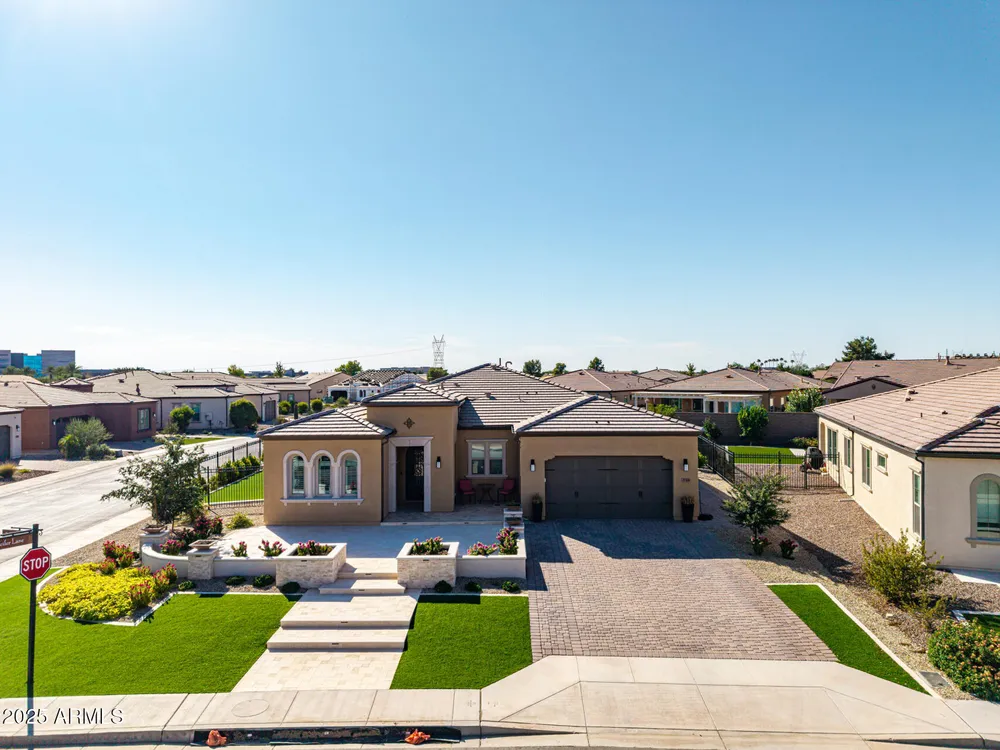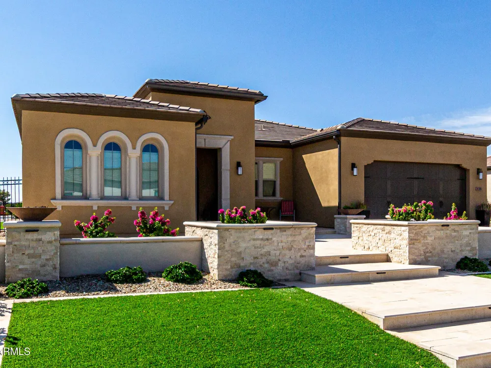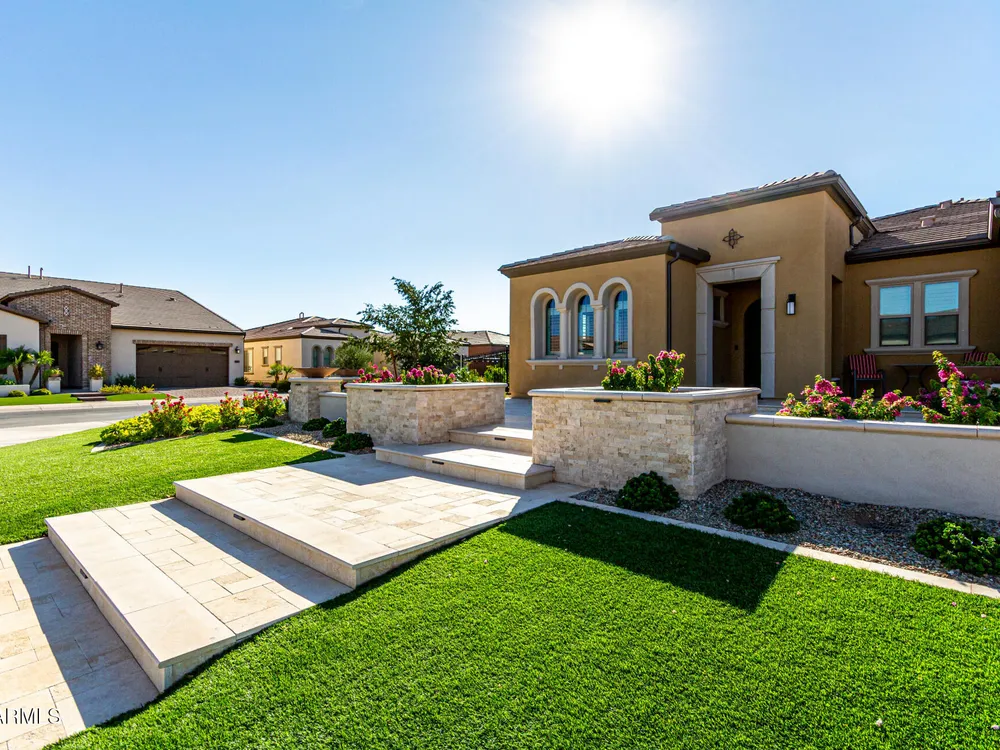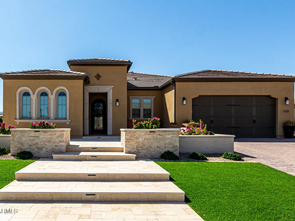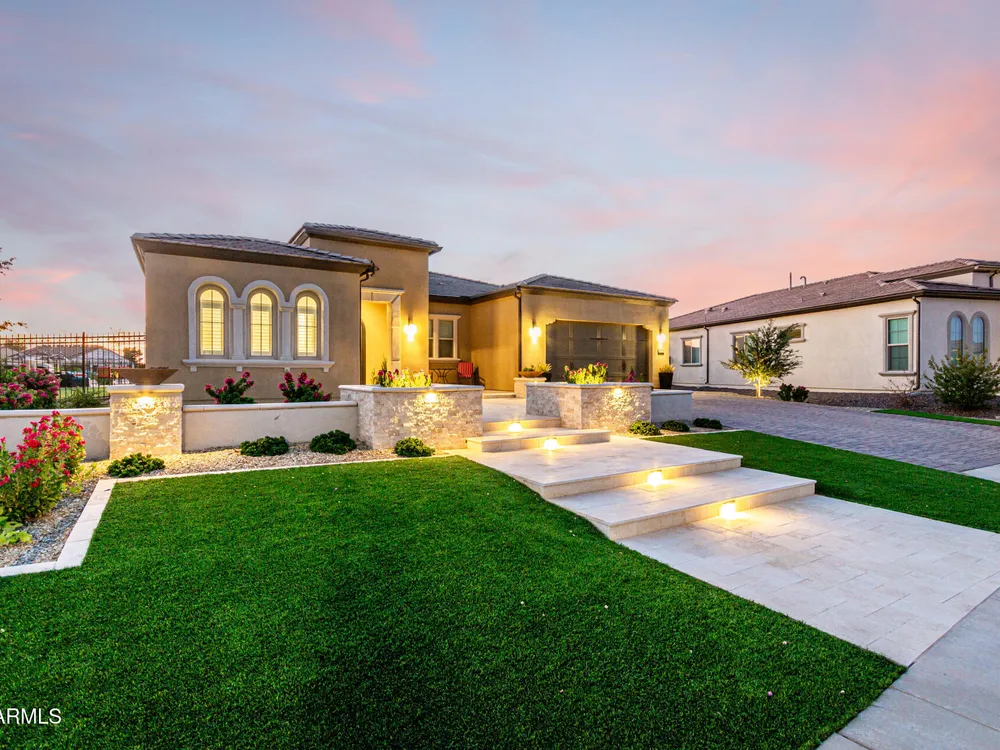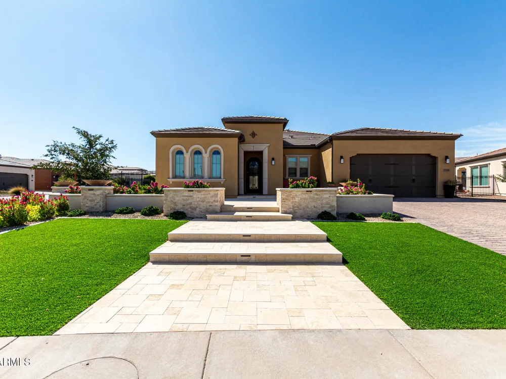 Luxury Living in the Heart of Encanterra Country Club! Experience the luxury lifestyle of Encanterra Country Club in this newer single-level home, nestled on 14,327sf premium corner lot, located in the sought-after enclave within the prestigious, gated Encanterra Country Club in Queen Creek, AZ. From the moment you step through the lush, professionally landscaped courtyard and custom wrought-iron front door, you'll be welcomed into a home where luxury, design, and comfort are in perfect harmony. This exquisite home features 3 spacious bedrooms, each located in its own private wing and complete with an en-suite bath — offering ultimate privacy and tranquility for both residents and guests. Inside, soaring ceilings, elegant marble-style flooring, sparkling crystal chandeliers, and a soft.. white palette enhance the open, sunlit layout. The split-floor plan ensures serene separation, with the primary suite serving as a peaceful retreat. It boasts a spa-inspired bath with dual vanities, a luxurious walk-in shower, and an oversized walk-in closet. The heart of the home is the chef's kitchen, an entertainer's dream, appointed with gleaming granite countertops, white cabinetry with crown moulding, a generous walk-in pantry, gas cooktop, apron-front farmhouse sink, and stainless-steel appliances. The kitchen flows seamlessly into the expansive great room, creating an ideal space for gatherings both large and intimate. Enjoy seamless indoor-outdoor living with expansive views of the outside of the beautifully designed backyard features multiple seating areas, a large, covered travertine-tiled patio, and ample room for entertaining under the stars. Living in Encanterra offers more than just a home-it's a lifestyle. Enjoy access to world-class amenities including a championship golf course, four resort-style pools, full-service spa, state-of-the-art fitness center, tennis and pickleball courts, fine and casual dining, live entertainment, social clubs, and curated community events, all within a vibrant and secure gated setting. This is a rare opportunity to own a truly one of a kind luxury home that brings together the modern design and resort lifestyle community you've been searching for.