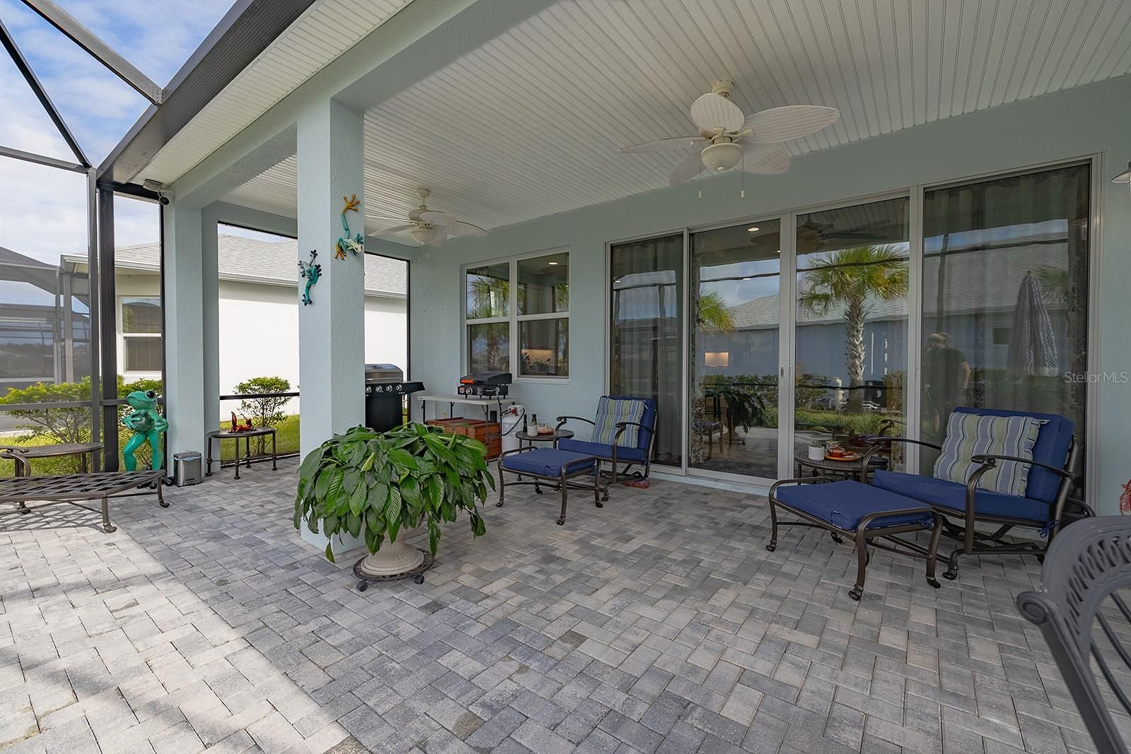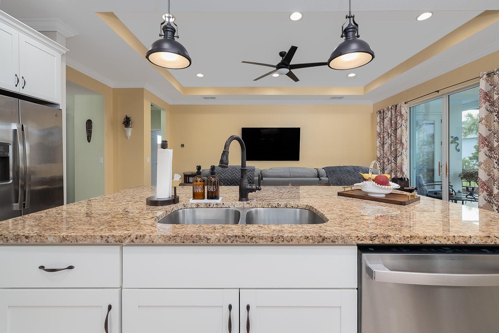 Elegant Cabana Model on a large corner lot with room to add a pool, offering 3 bedrooms, 2.5 baths, an office/den, and seamless tile floors throughout. Chef-style kitchen features stone countertops, wine refrigerator, double wall ovens, walk-in pantry, and a new dishwasher. Spacious primary suite includes two walk-in closets, sitting area, and spa-inspired bath with glass rain shower and abundant cabinetry. Upgrades you’ll love: Generac generator with 10-year warranty, Nest thermostat, on-demand hot water, laundry cabinetry, fresh interior paint, whole-house water filtration, gutters, and garage overhead storage with shelving and organizing racks. Relax or entertain under the covered lanai and design your private outdoor oasis. Resort-style community amenities include Paradise Pool, Fitness Center, Bar & Chill, pickleball courts, and more—close to Publix, dining, and shopping.