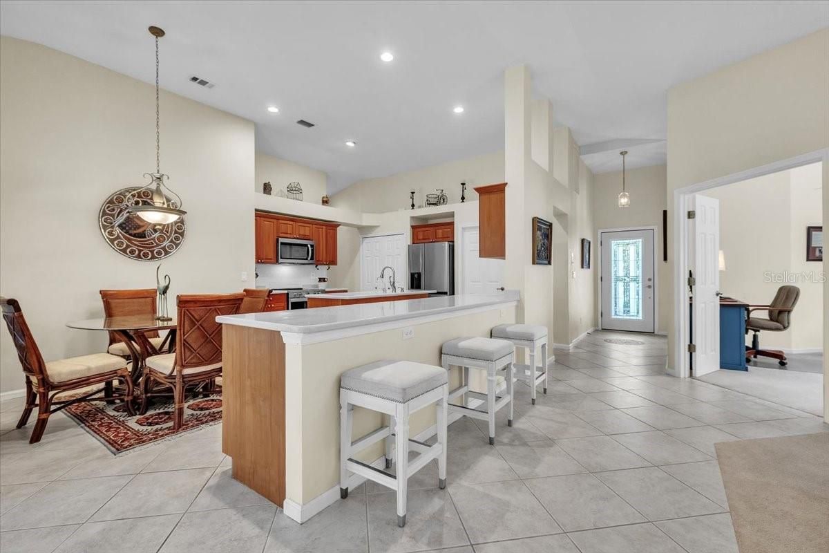 Welcome to this beautifully maintained home in the highly desirable Royal Oaks neighborhood of Riverwood, where resort-style amenities meet everyday comfort. Recent upgrades include: roof, A/C and hot water heater (2024), hurricane shutters (2025)—providing added value and peace of mind from the moment you move in. This inviting residence offers 2 bedrooms, 2 bathrooms, a versatile bonus room, and an attached two-car garage, blending functionality with relaxed Florida charm. The Mediterranean-inspired exterior features a classic red tile roof, elegant stucco façade, and lush tropical landscaping accented by mature oak trees for a warm and welcoming first impression. Inside, the bright open floor plan is designed for entertaining. With 1,762 sq. ft. of thoughtfully planned space, the home features a spacious great room that flows into the kitchen. Solid-surface countertops, a pantry closet, generous island, raised-panel cabinetry with crown molding, and newer stainless-steel appliances make the kitchen ideal for both cooking and gathering. The adjoining dining offers high ceilings, plantation shutters, and a blend of tile and carpeted spaces for added comfort. Sliding glass doors and large windows fill the home with natural light and open directly to the pool and lanai, enhancing the indoor-outdoor lifestyle. The primary suite provides direct lanai access, an oversized walk-in closet, and a spa-inspired bathroom featuring a soaking tub, walk-in shower, extended vanity, and private water closet. The guest suite has a spacious built-in closet, and its own full bathroom for privacy. A flexible bonus room is perfect for a home office, den, or additional guest room. Step outside to the inviting screened lanai, where a sparkling private pool and newly resurfaced paver patio (2024) create the ideal setting for lounging, dining. Lush landscaping and mature trees provide a serene backdrop, while the screened enclosure allows for year-round enjoyment. Life in Riverwood is about more than just a home—it’s a resort lifestyle. Beyond your doorstep, enjoy championship golf on the Golfer’s Choice 2021 #1 Florida Course and Top 15 U.S. Courses, plus a vibrant Activity Center Campus featuring lap and resort-style pools, a fitness center, pickleball and tennis courts, croquet, bocce, art studios, library, and countless social events all for a reasonable HOA fee! For added amenities, the Riverwood Golf Club, Private Beach Club on Manasota Key, and RV/Boat storage are also available by membership. Ideally located near the Tampa Bay Rays and Atlanta Braves Spring Training facilities, world-class Gulf beaches, Charlotte Harbor, the Myakka River, Punta Gorda, Englewood, and Boca Grande—Riverwood is where Florida’s natural beauty meets resort-style living. Don’t miss this opportunity to make this slice of paradise your own. **PLEASE ENJOY THE 3D INTERACTIVE VIRTUAL TOUR ASSOCIATED WITH THIS LISTING**