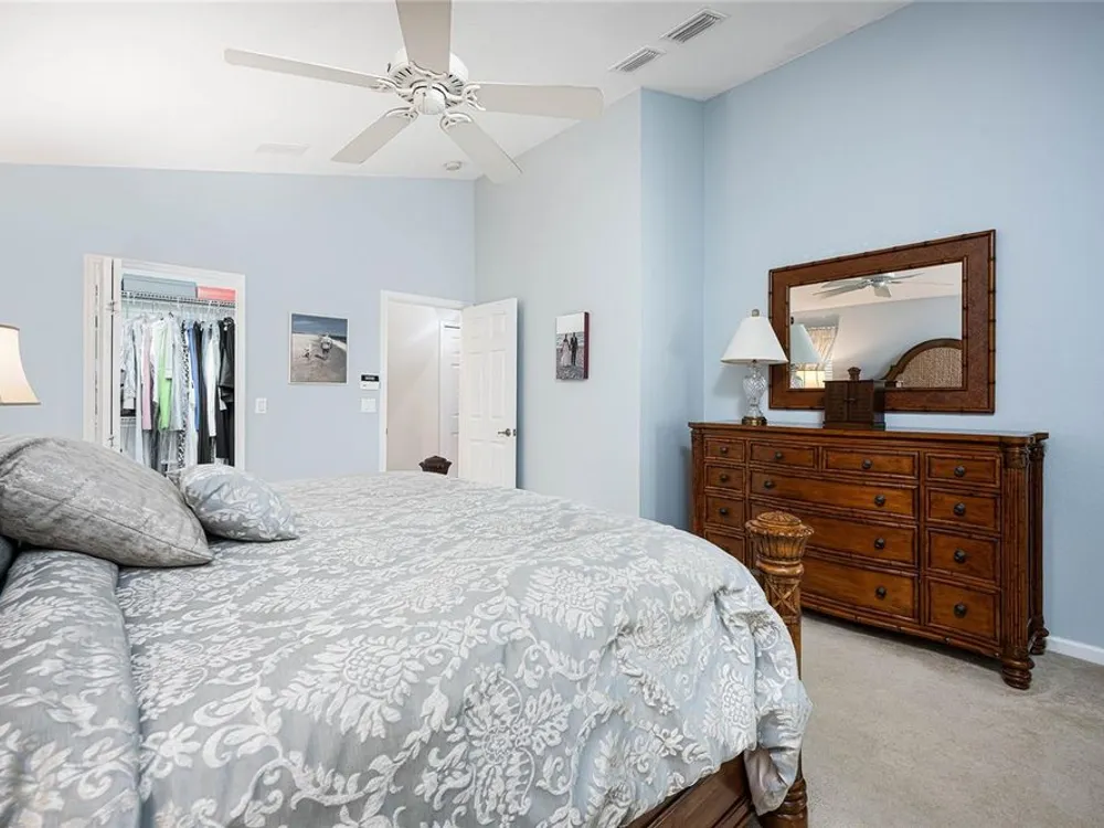 - Ceiling Fan(s), Eat-in Kitchen, High Ceilings, Living/Dining Room, Open Floorplan, Main Level Primary, Solid Surface Counters, Split Bedrooms, Thermostat, Walk-In Closet(s), Window Treatments