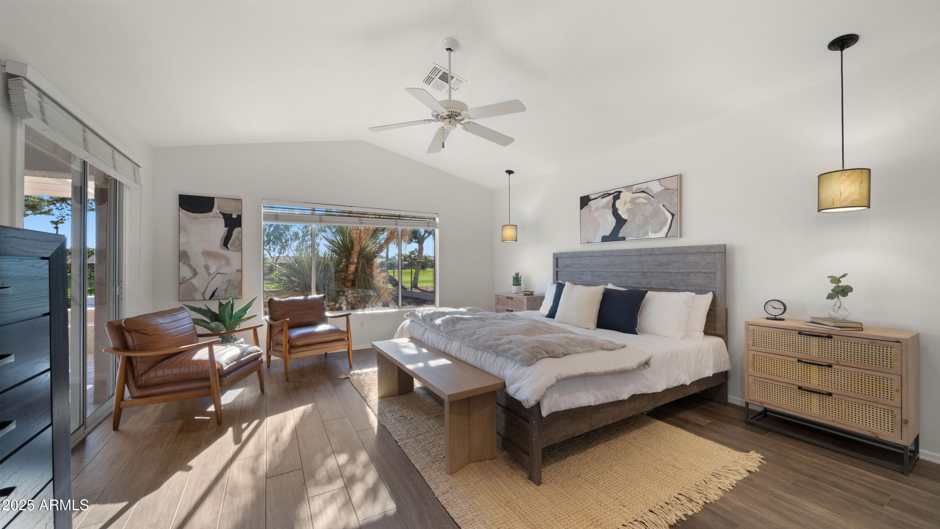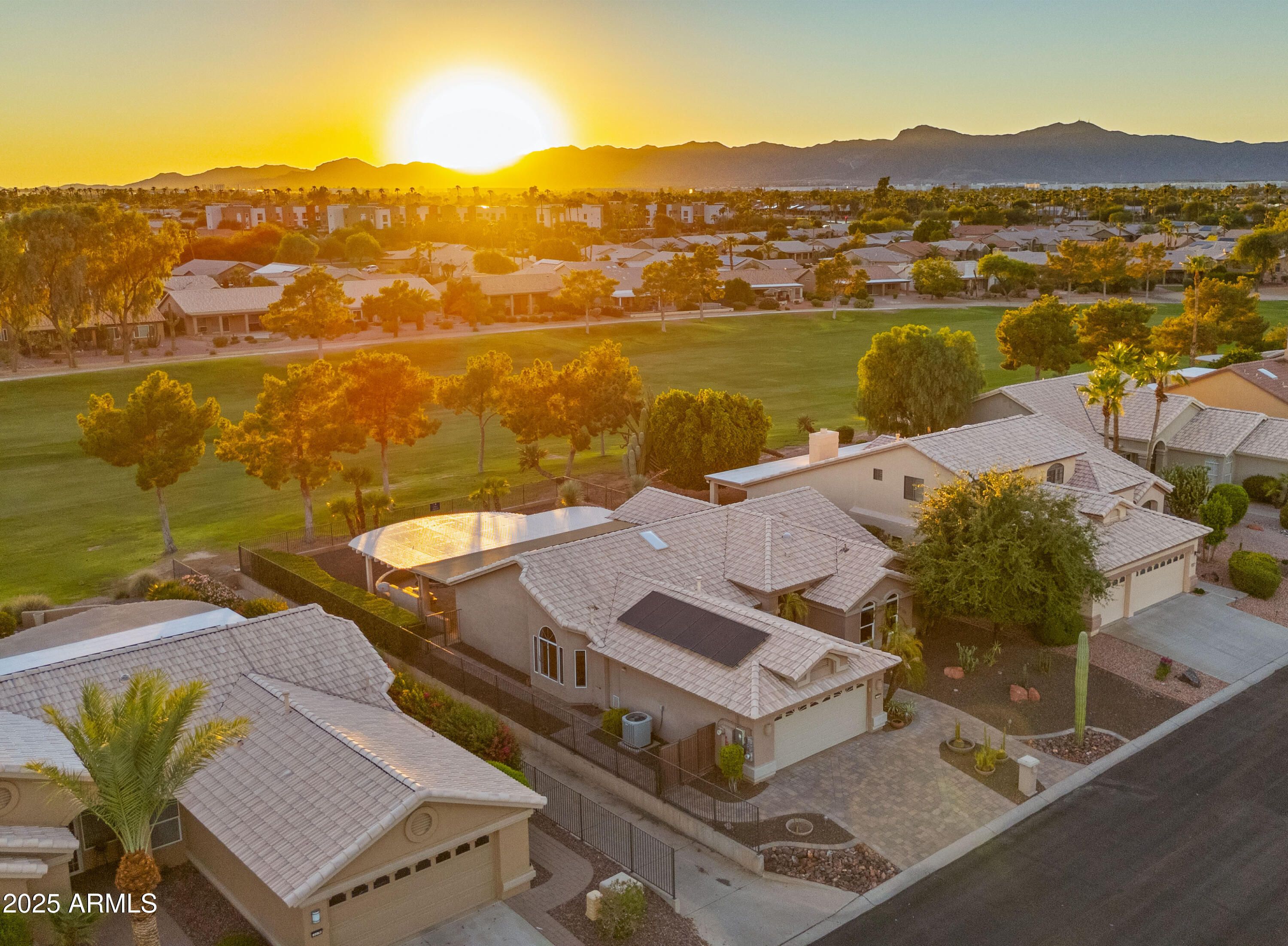 SELLER OPEN TO PREPAYING THE SOLAR LEASE. Enjoy serene golf course living on the 6th fairway of Eagle's Nest in this Topez model in coveted guard-gated PebbleCreek Active Adult community. This beautifully updated 3 bed, 2 bath home features vaulted ceilings, two remodeled bathrooms, a spacious laundry room and a two car extended garage with a golf cart bay. Relax on your shady patio with stunning mountain and golf views. PebbleCreek offers resort-style amenities including two 18-hole championship golf courses, a community pool, fitness center, and vibrant rec center. Ideal for full-time or seasonal living, this home blends comfort, style, and an unbeatable location in one of Goodyear's premier 55+ communities. Move-in ready and waiting for you!