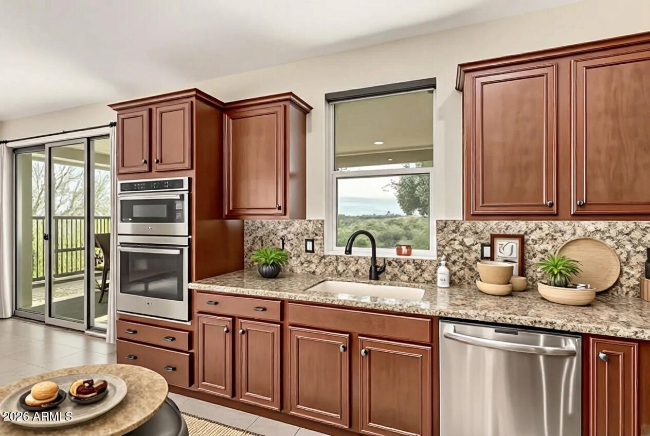 Located in Wickenburg Ranch, this rare Sycamore model offers 2 bedrooms, 2.5 bathrooms, and 2,162 square feet of thoughtfully designed living space. The open-concept floor plan creates effortless flow between the great room, dining area, and gourmet kitchen, making the home ideal for both everyday living and entertaining. Tile flooring runs throughout, enhancing the clean, cohesive feel, while abundant windows and expansive sliding glass doors fill the home with natural light. The kitchen serves as the heart of the home, featuring granite countertops, a large statement island with seating, ample cabinetry, and generous prep space for hosting or casual meals. The spacious primary suite offers privacy and comfort, while well-appointed guest accommodations provide flexibility for visitors or a home office. Step outside to a large covered patio designed for true indoor-outdoor living. Enjoy evenings in the jacuzzi or relax in the peaceful setting surrounded by minimal, low-maintenance desert landscaping. The extended patio space is perfect for entertaining, dining al fresco, or simply taking in Arizona's beautiful sunsets. Residents enjoy access to resort-style amenities including championship golf, tennis, pickleball, a fitness center, clubhouse dining, and an active lifestyle calendar. A rare opportunity to own one of the community's most sought-after floor plans in a premier setting.