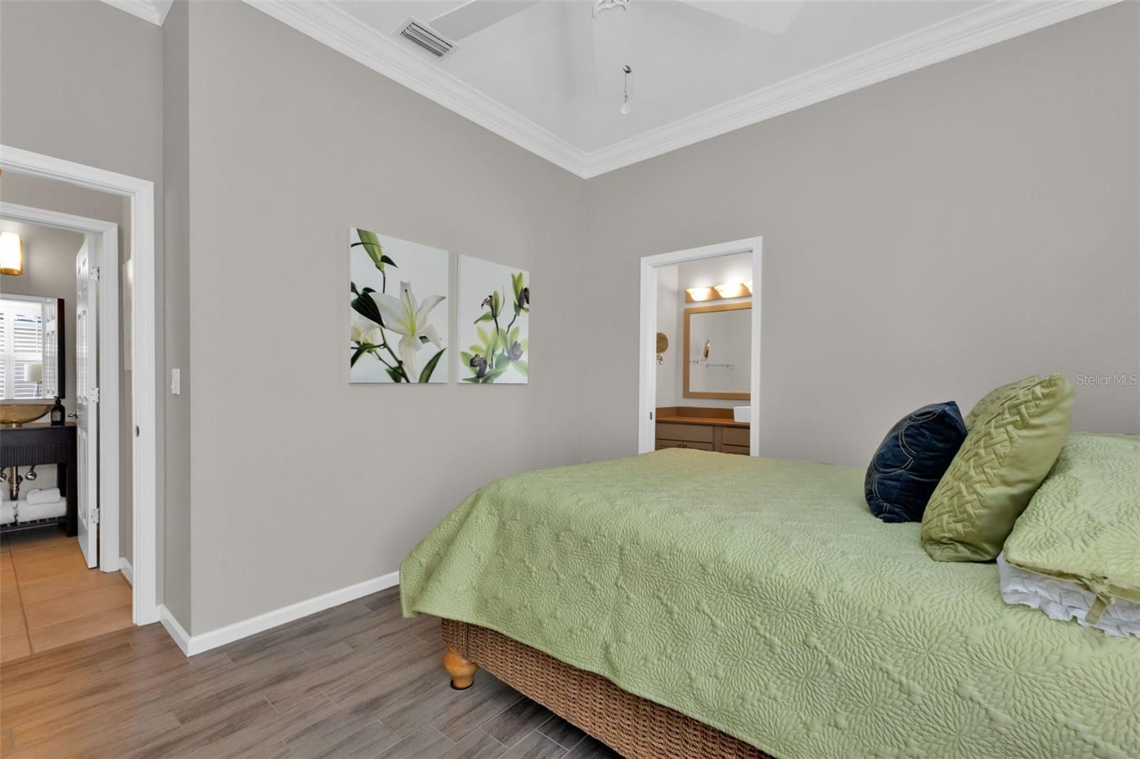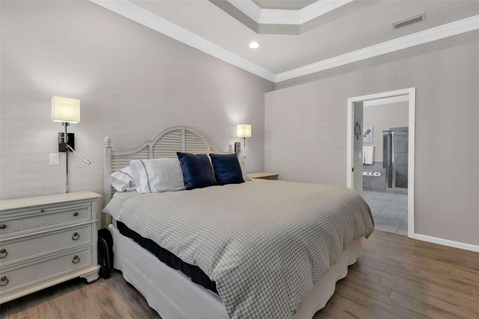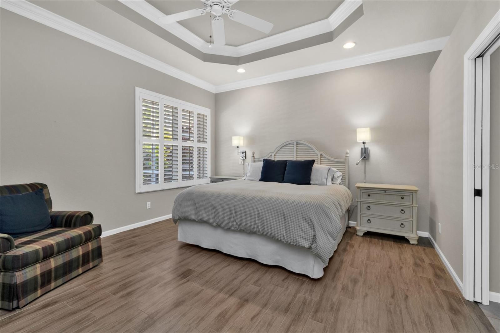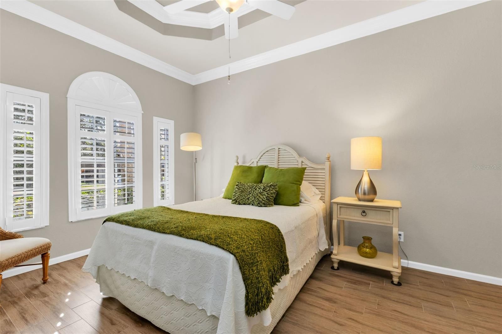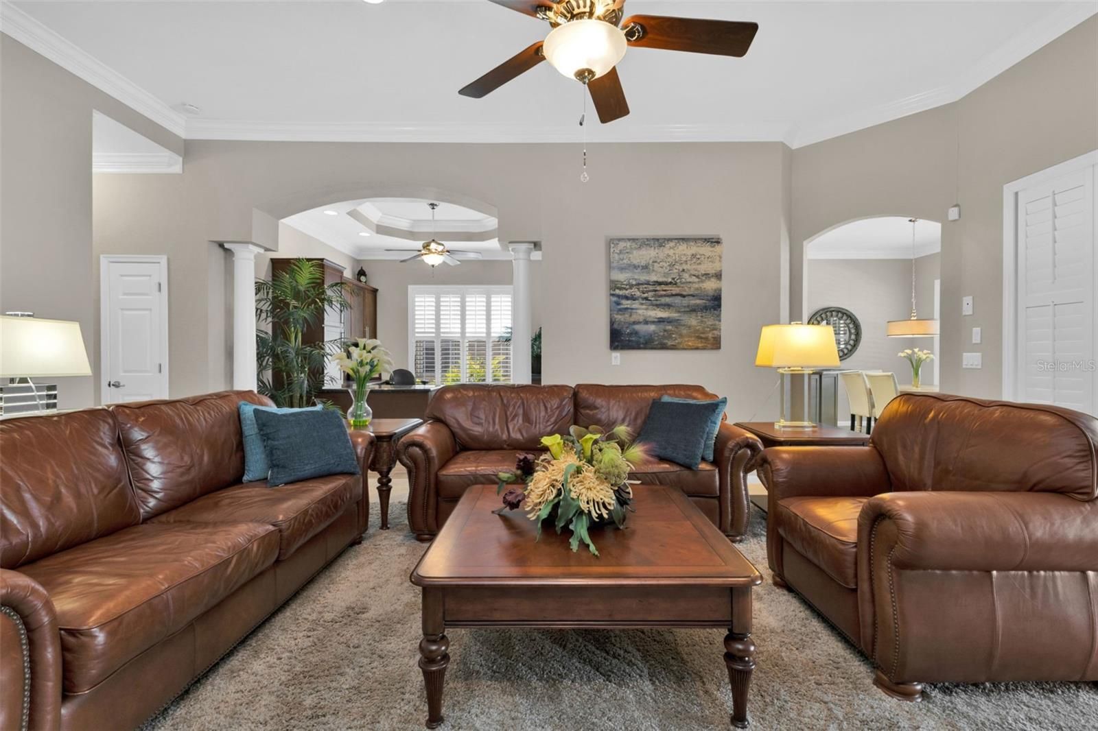 - Built-in Features, Ceiling Fan(s), Central Vacuum, Coffered Ceiling(s), Crown Molding, Eat-in Kitchen, High Ceilings, In-Wall Pest Control, Main Level Primary, Solid-Wood Cabinets, Split Bedrooms, Stone Counters, Tray Ceiling(s), Walk-In Closet(s), Window Treatments
